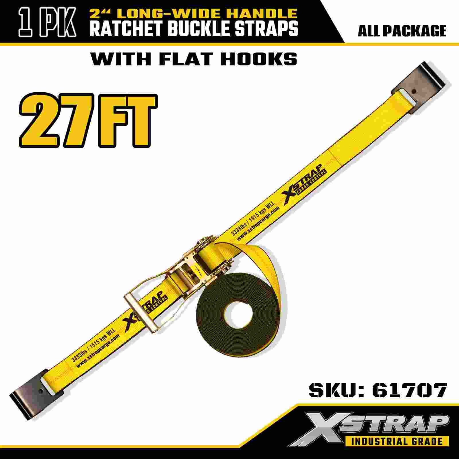 Xstrap 61707 Lange, brede håndtag skraldestropper 2" x 27 fod (1-pakke) - Flade kroge, 10.000 lbs brudstyrke, kraftig bindestrop til sikker transport