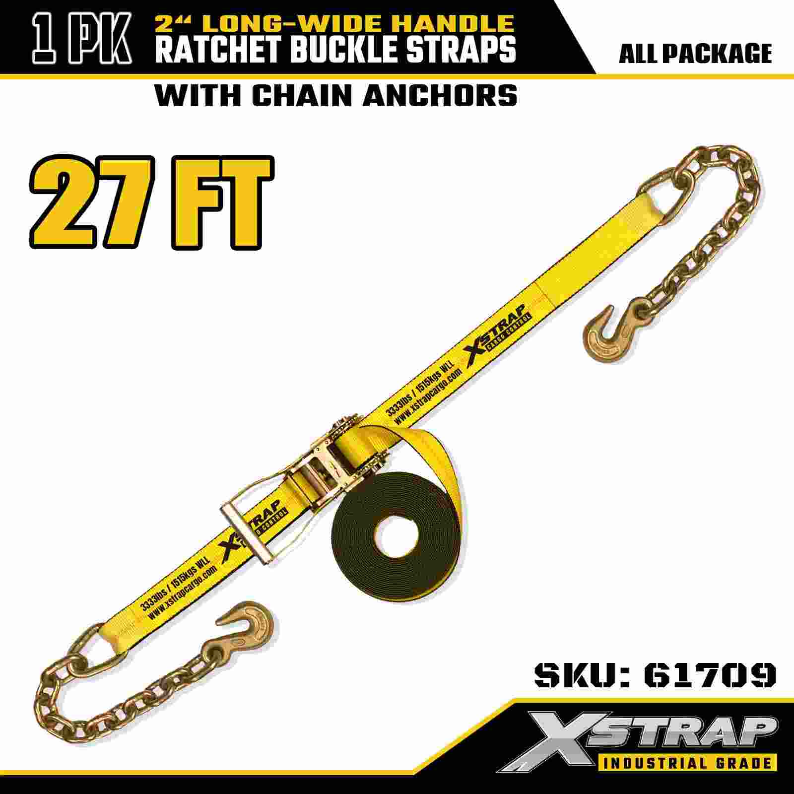 Xstrap 61709 Langt bredt håndtag skraldespændestropper 2" x 27ft (1-pakke) med Kædekroge, 10.000 lbs brudstyrke, kraftig bindestrop til sikker transport