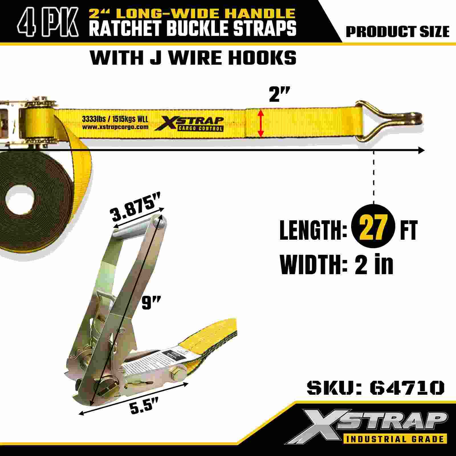 Xstrap 64710 Cargo Control Ratchet Straps 2" x 27ft (4-pakke) - Wirekroge, 10.000 lbs nominel kapacitet, holdbar binding til udstyrstransport