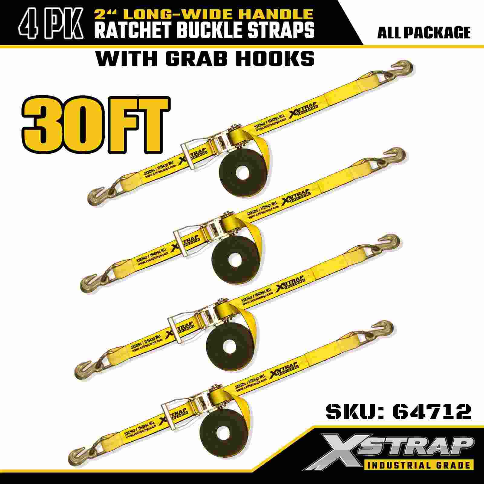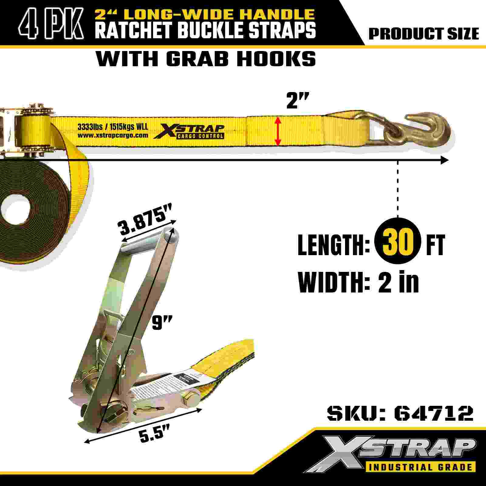 Xstrap 64712 2" x 30 fod lange, brede håndtag skraldespændestropper (4-pak) - Gribekroge, 10.000 lbs kapacitet, kraftig binding til transport af stort udstyr