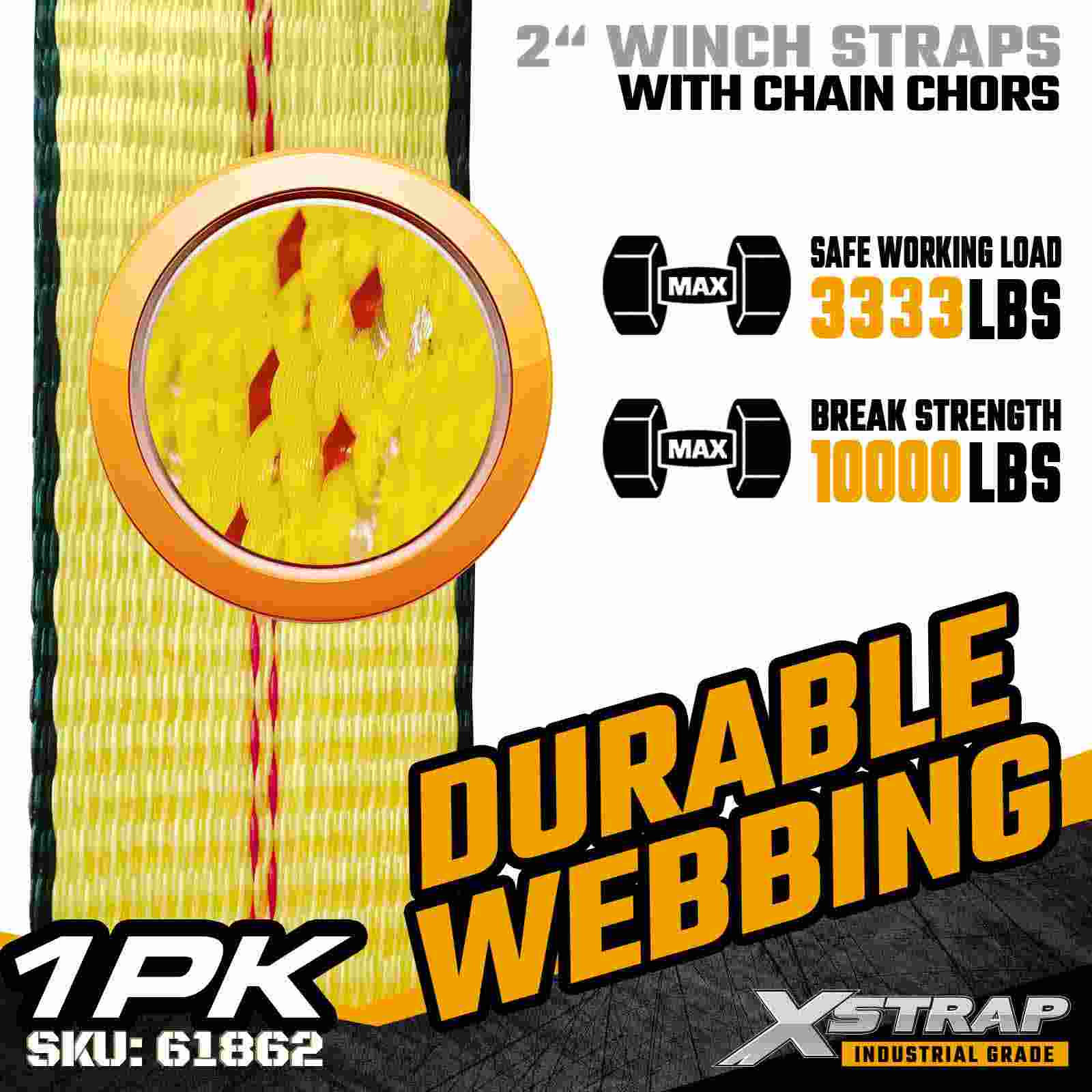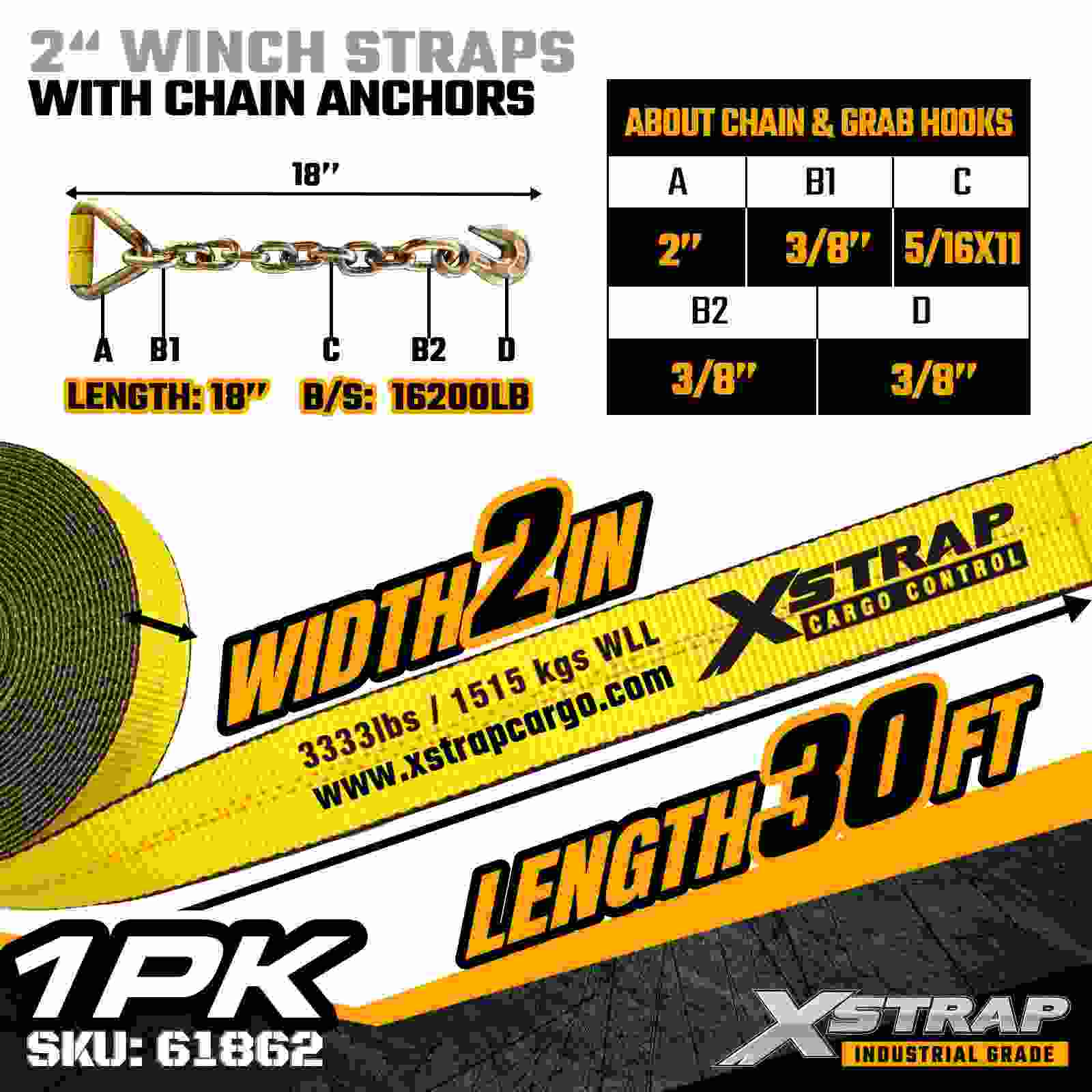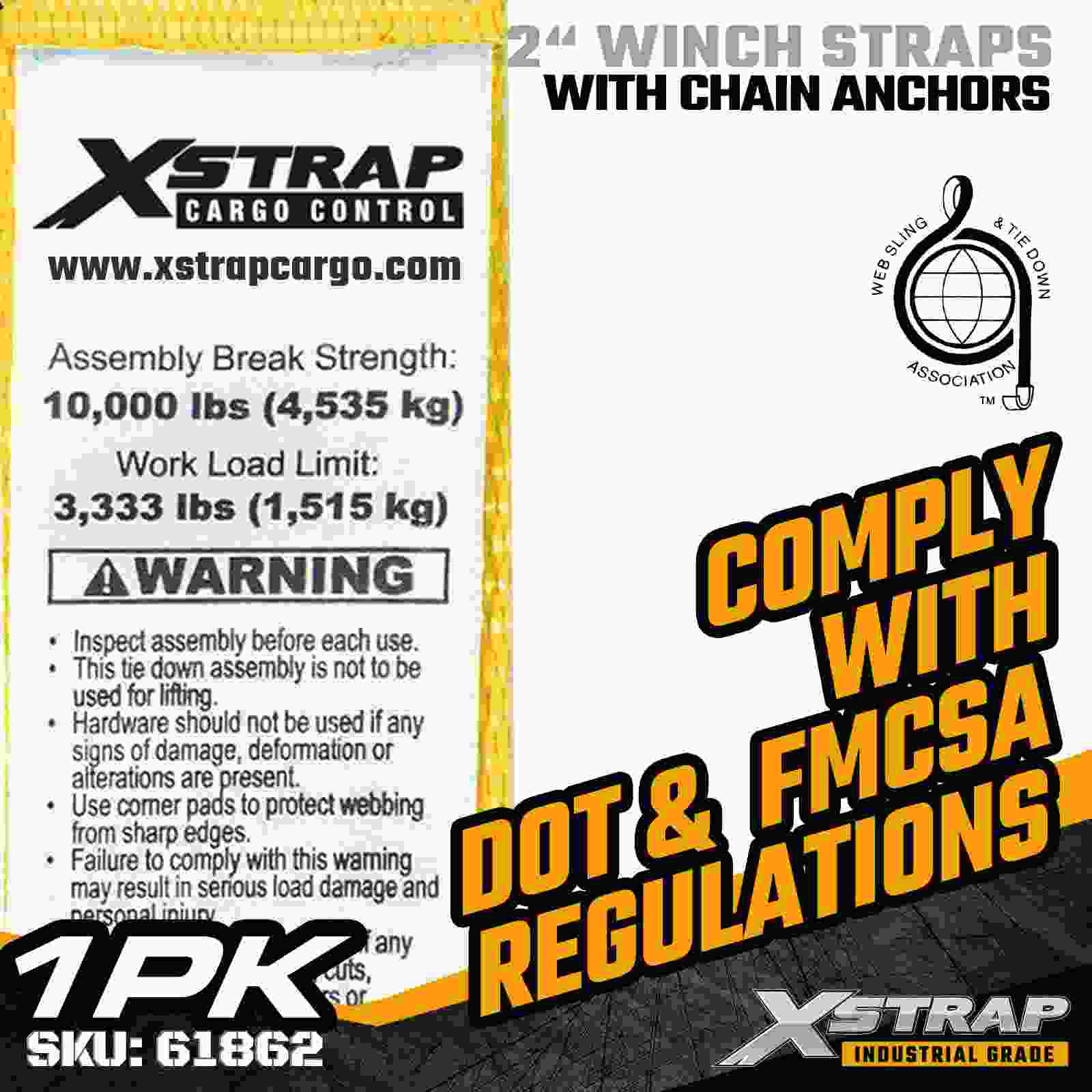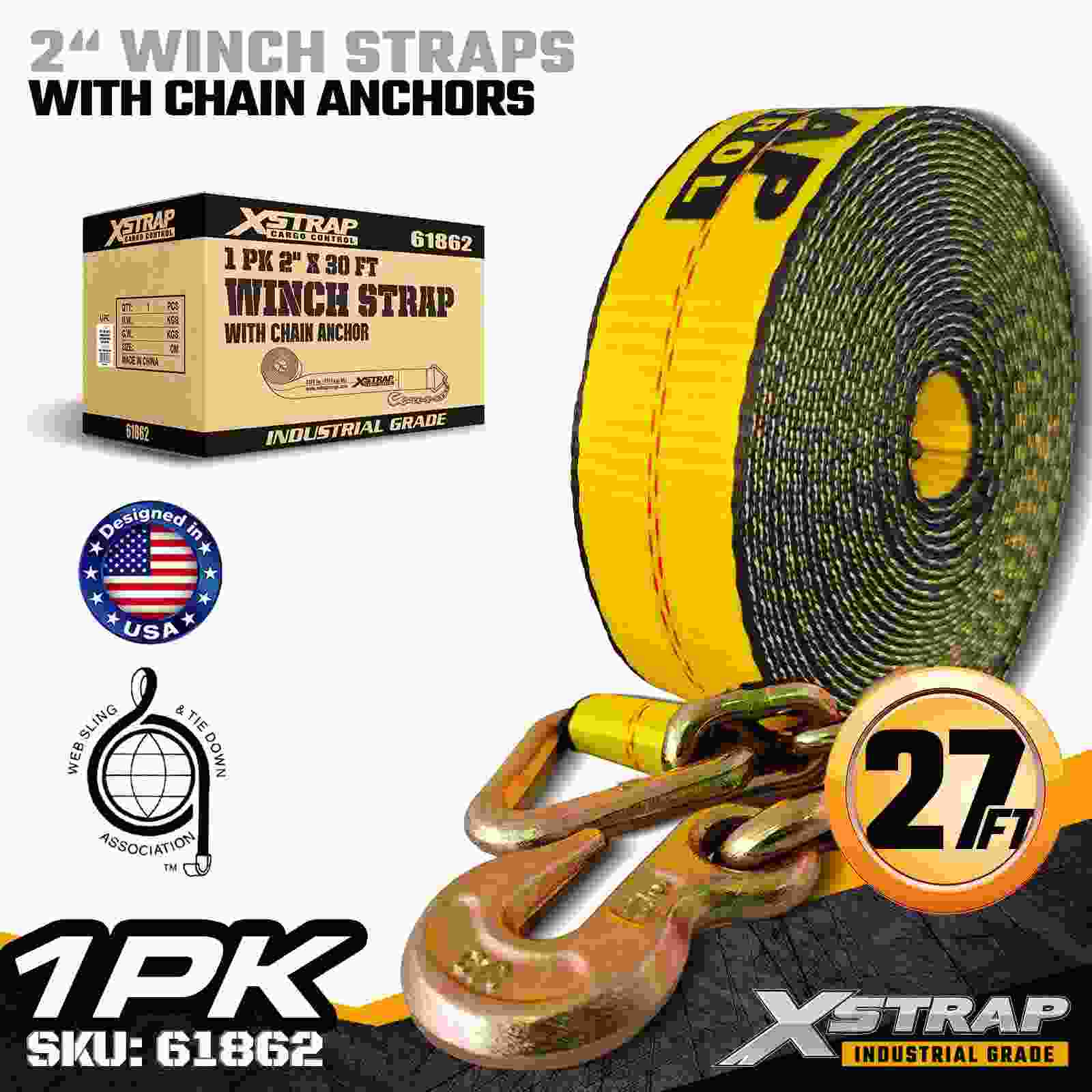 Xstrap 61862 2" × 30 ft standard spilstrop er bygget til pålidelig fastgodssikring med flatbed, med holdbare kædeankre og højstyrke polyesterbånd. Med en arbejdsbelastningsgrænse på 3.333 lbs og 10.000 lbs brudstyrke giver den pålidelig ydeevne til daglig fragt af paller, last fra paller, generel belastning af paller, rørlast, paller og rør. logistikapplikationer.