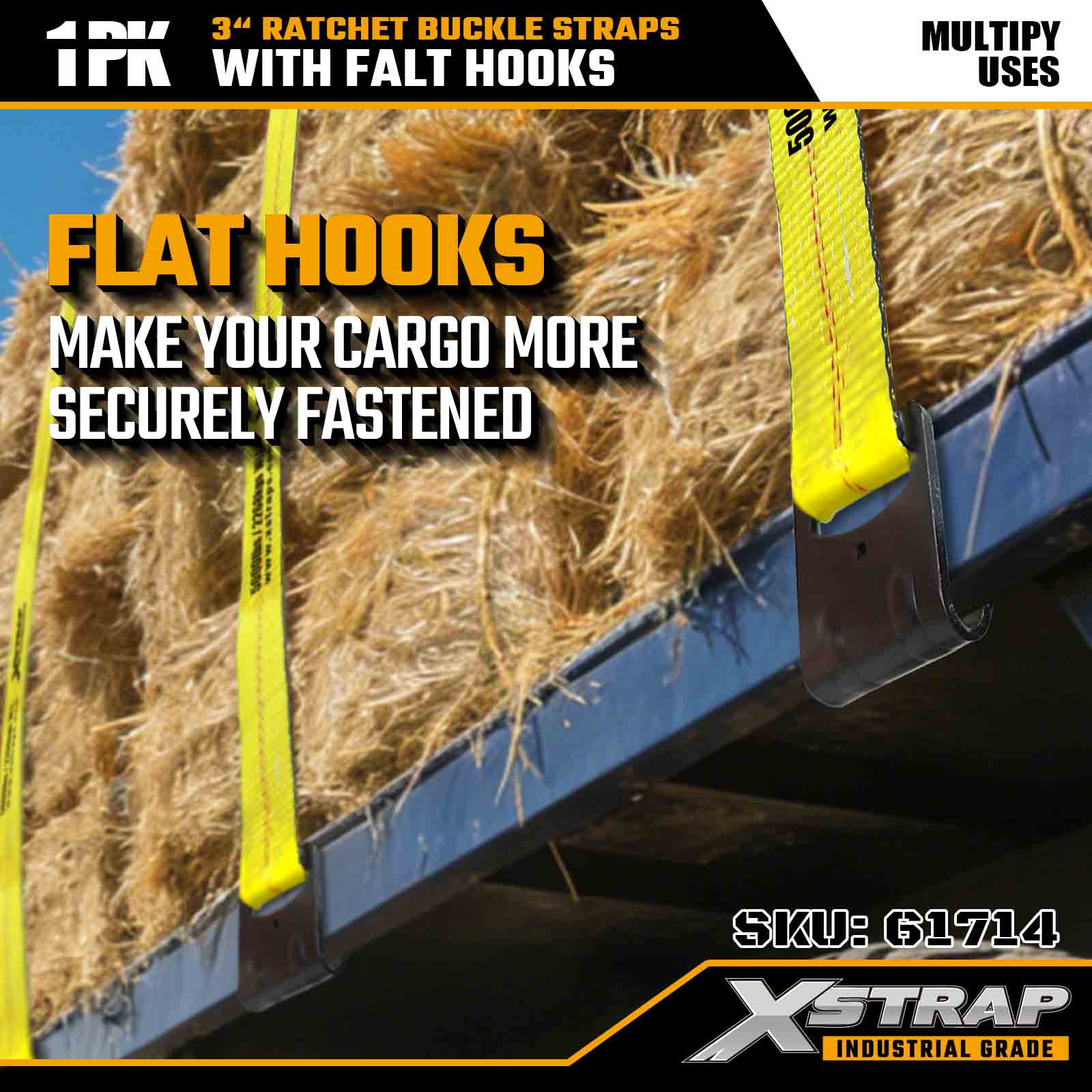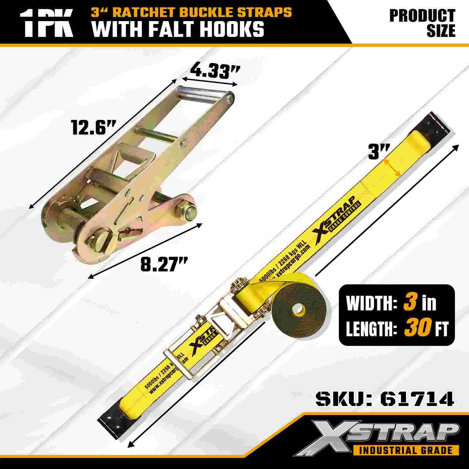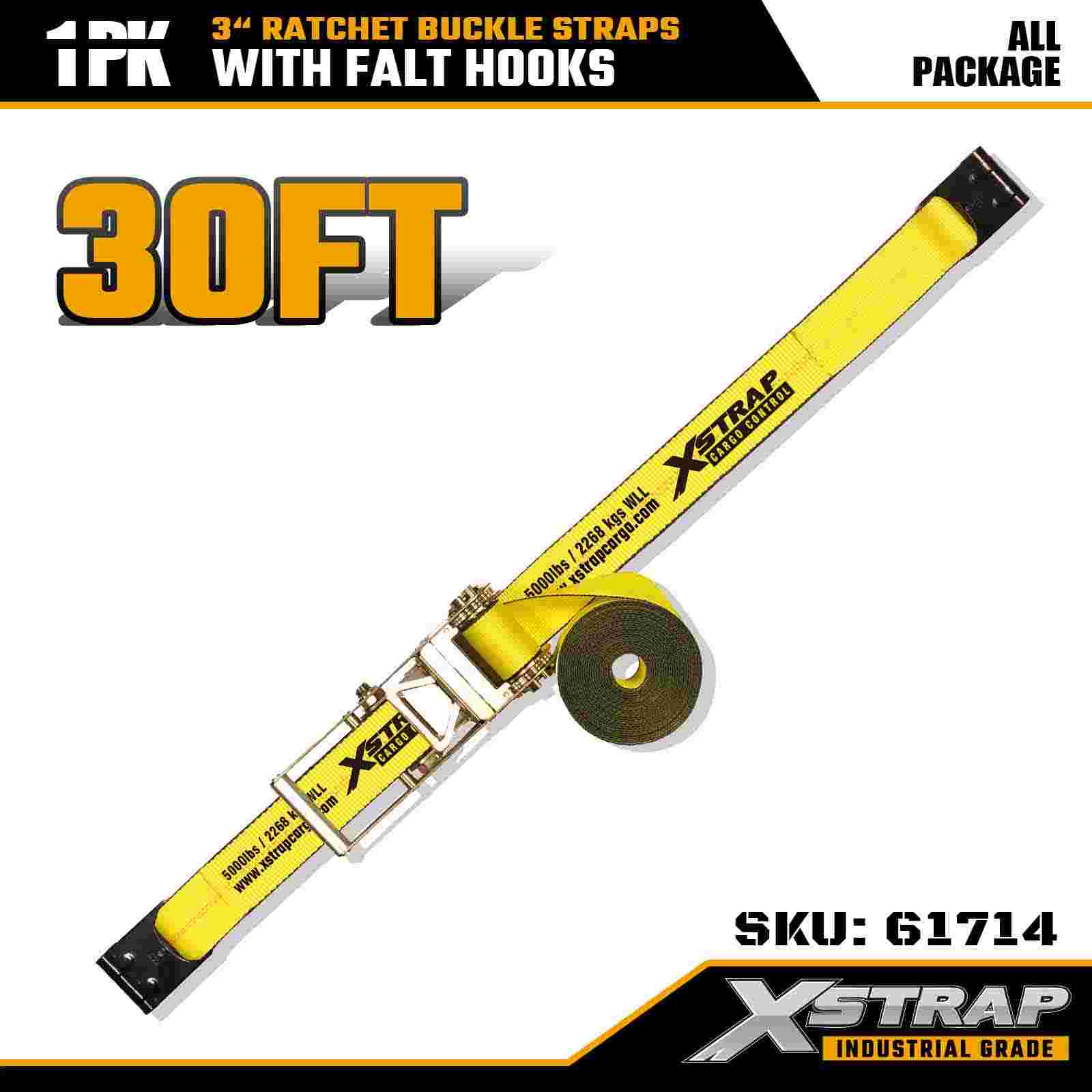 Xstrap 61714 3" x 30 fod skraldespændestropper (1-pakke) – Flade kroge, 5.000 lbs lastekapacitet, 15.000 lbs brudstyrke, kraftig binding til lastbiler, trailere og industrigodstransport.