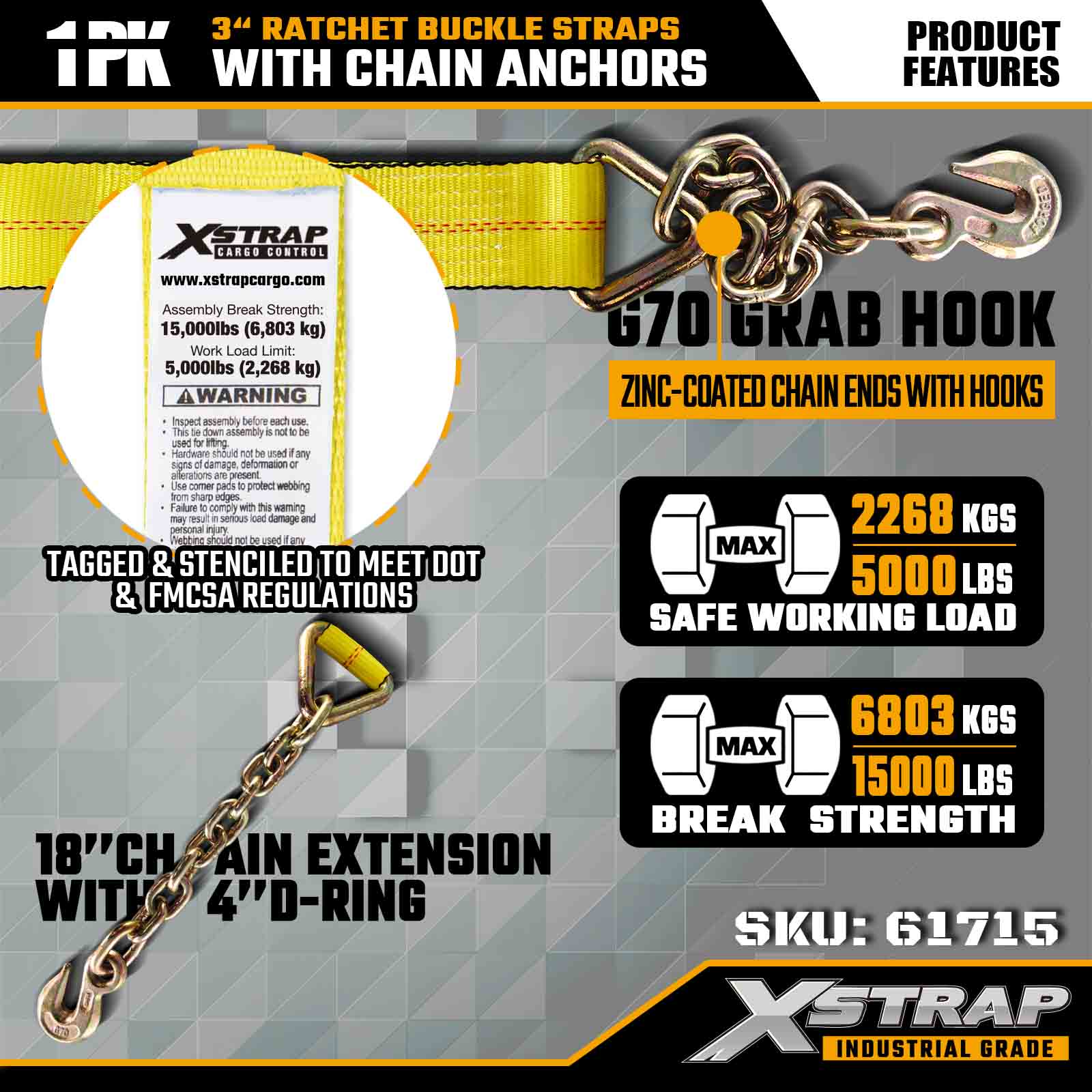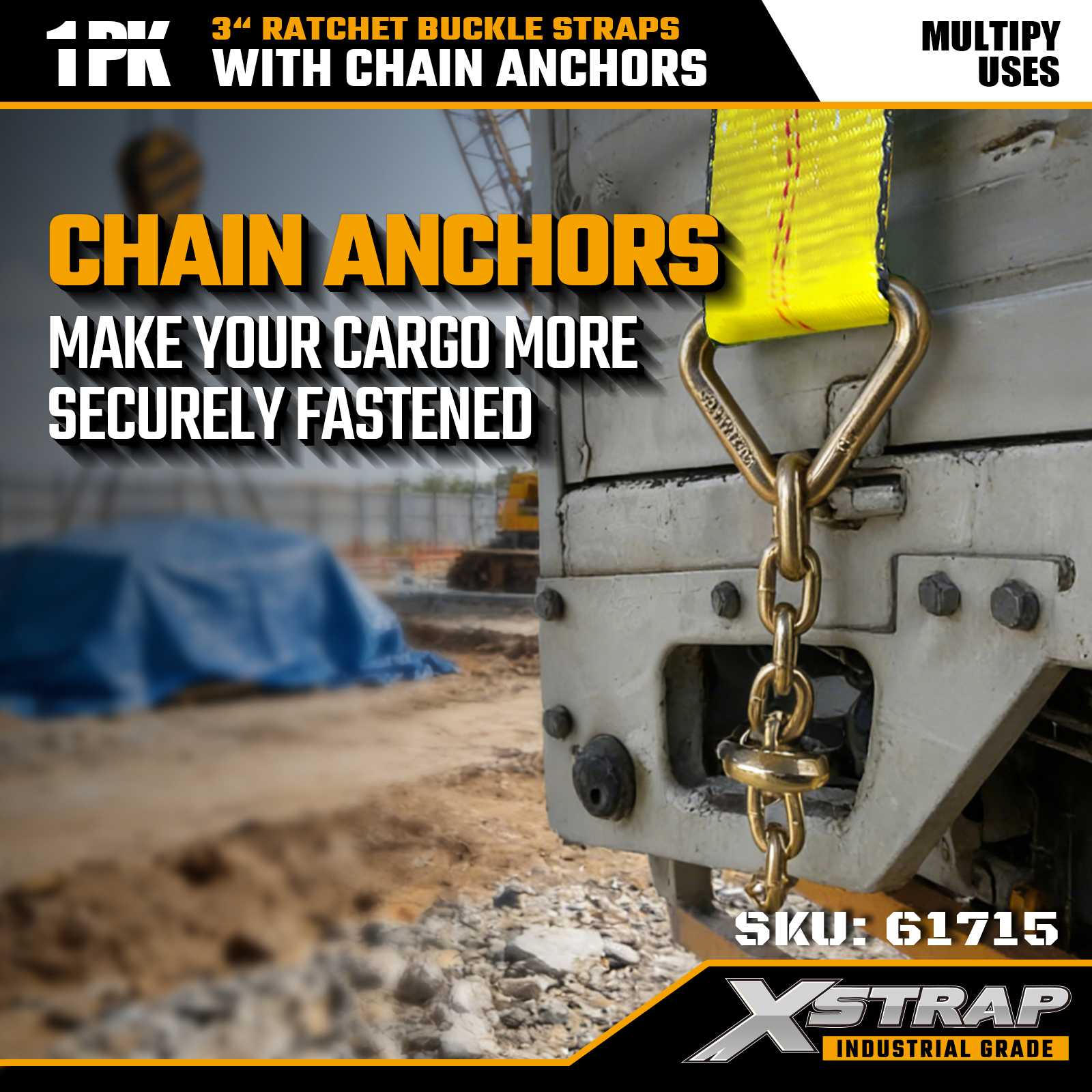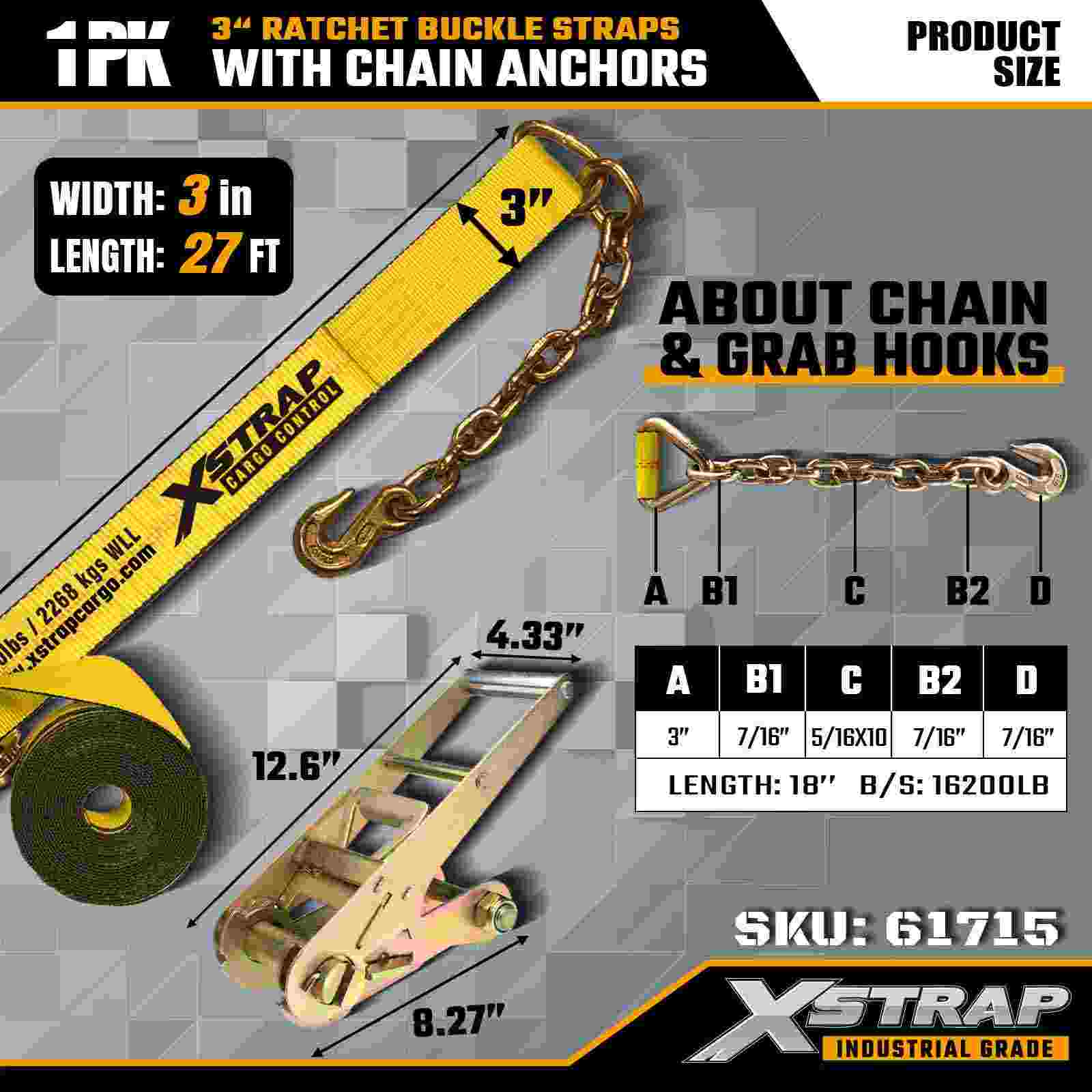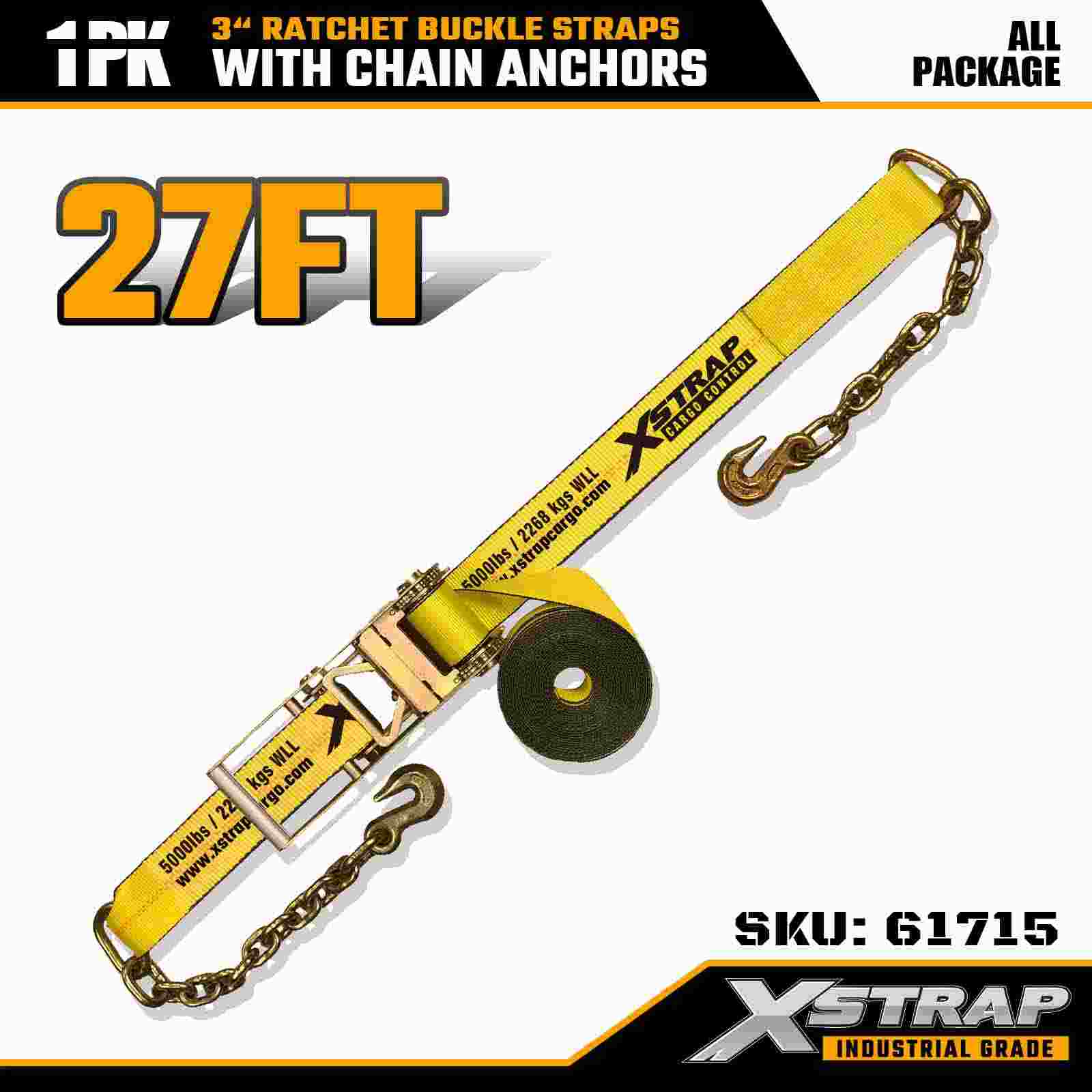 Xstrap 61715 3" x 27 fod skraldespændestropper (1-pakke) – Kædeankre, 5.000 lbs belastningskapacitet, 15.000 lbs brudstyrke. Disse stropper er designet til kraftig lastkontrol og kombinerer industrikvalitetsbånd i lastbil- og anhængerkonstruktioner, kæde- og anhængerkonstruktioner med maksimal sikkerhed for transport, kæde og anhænger.