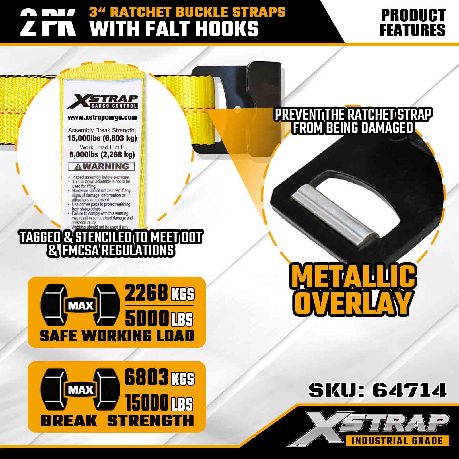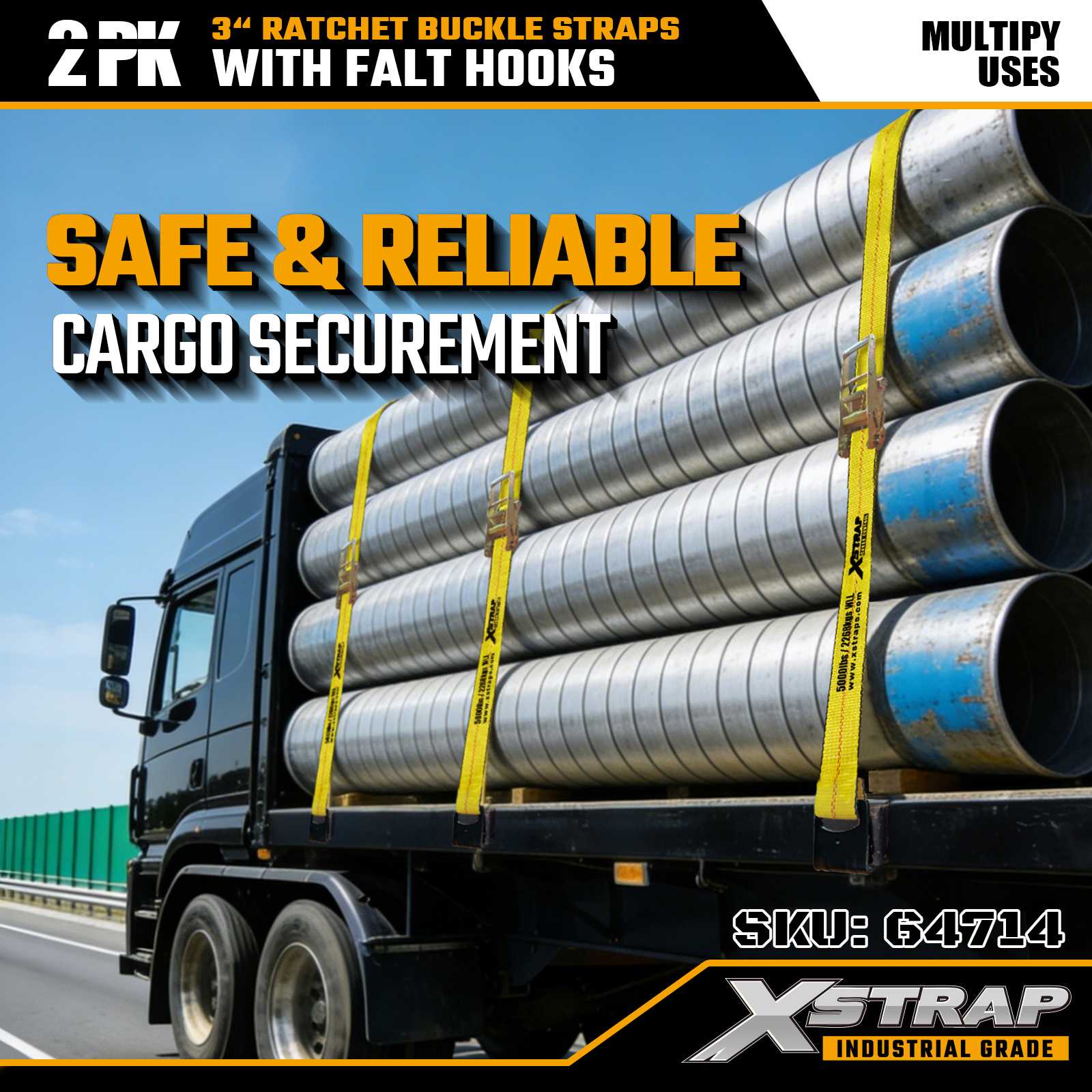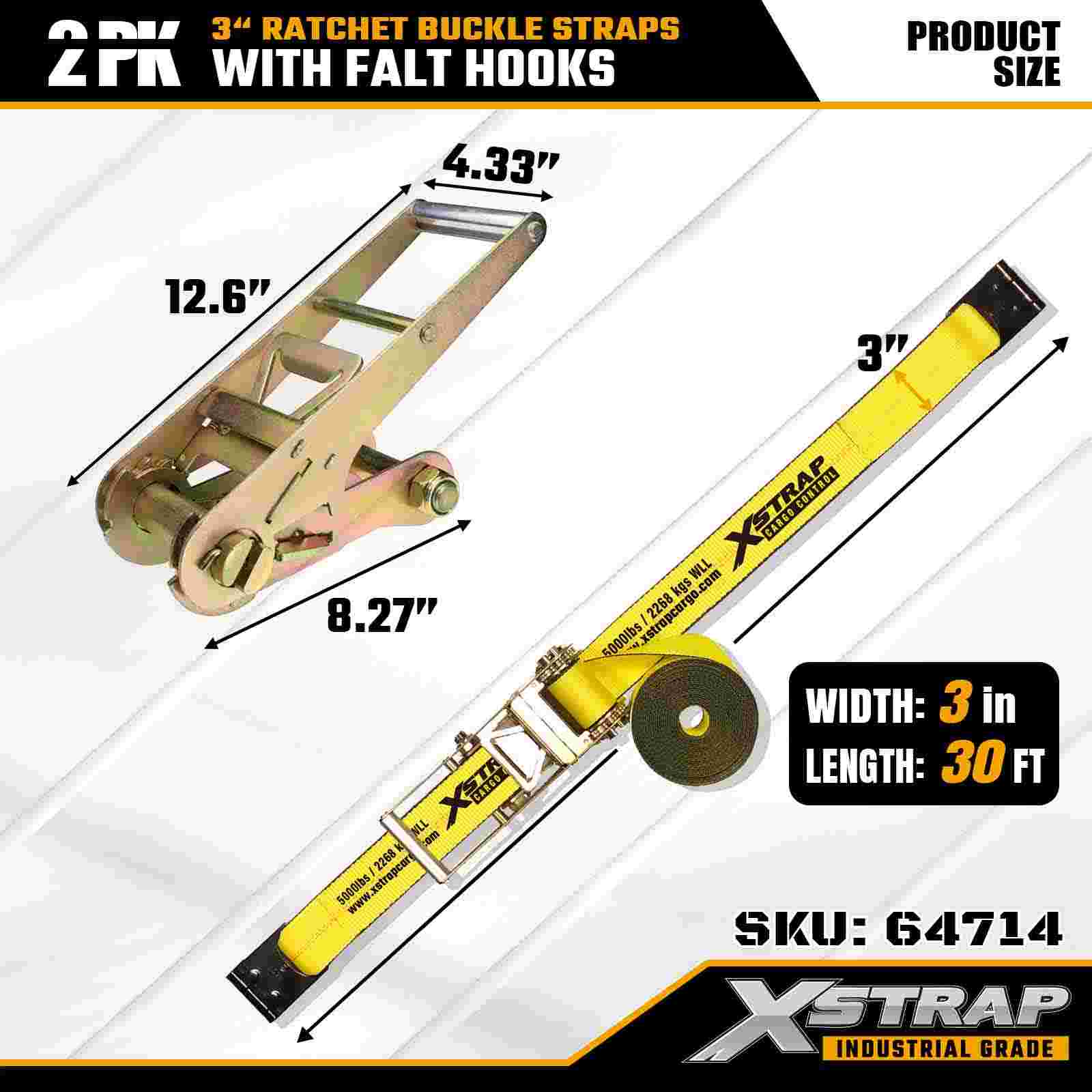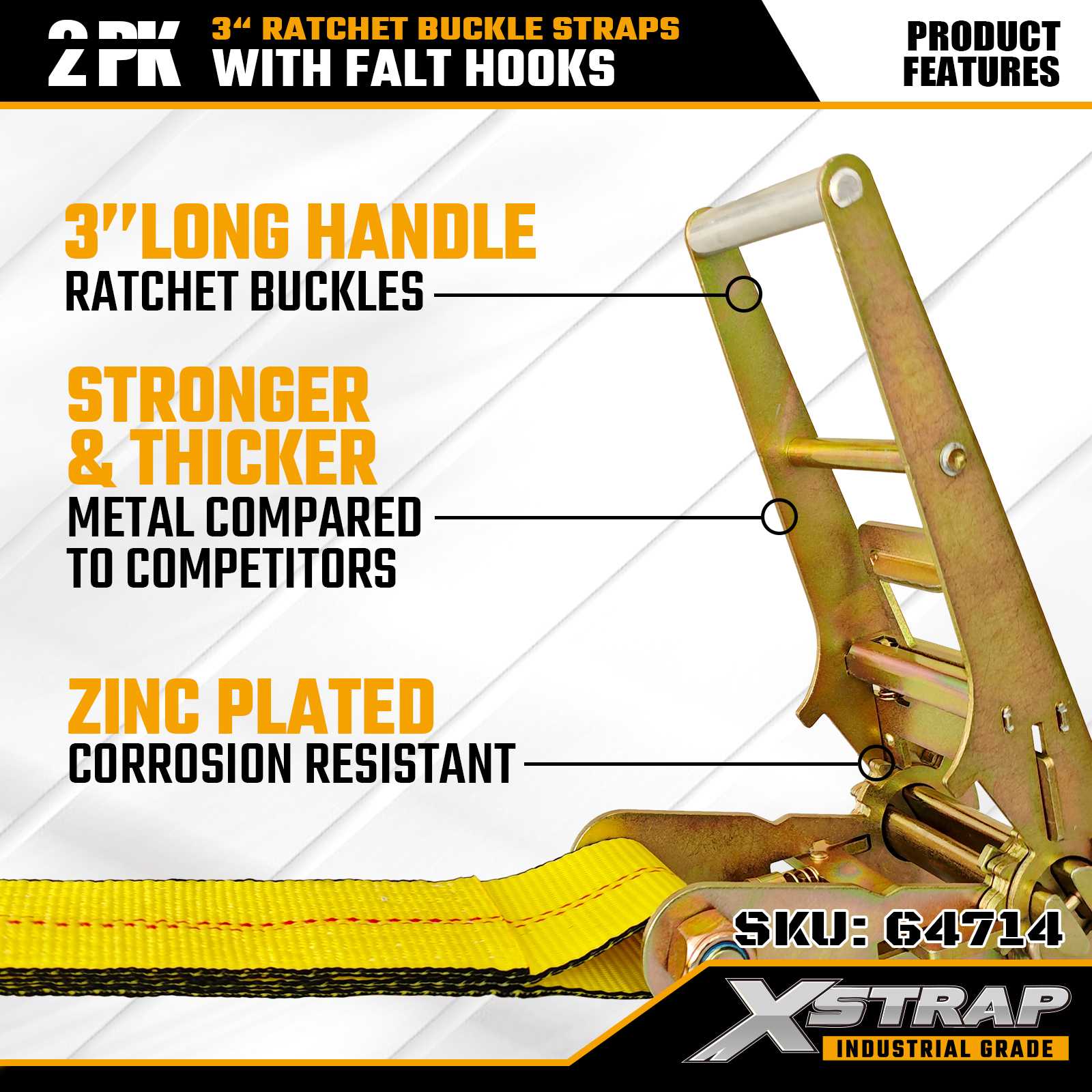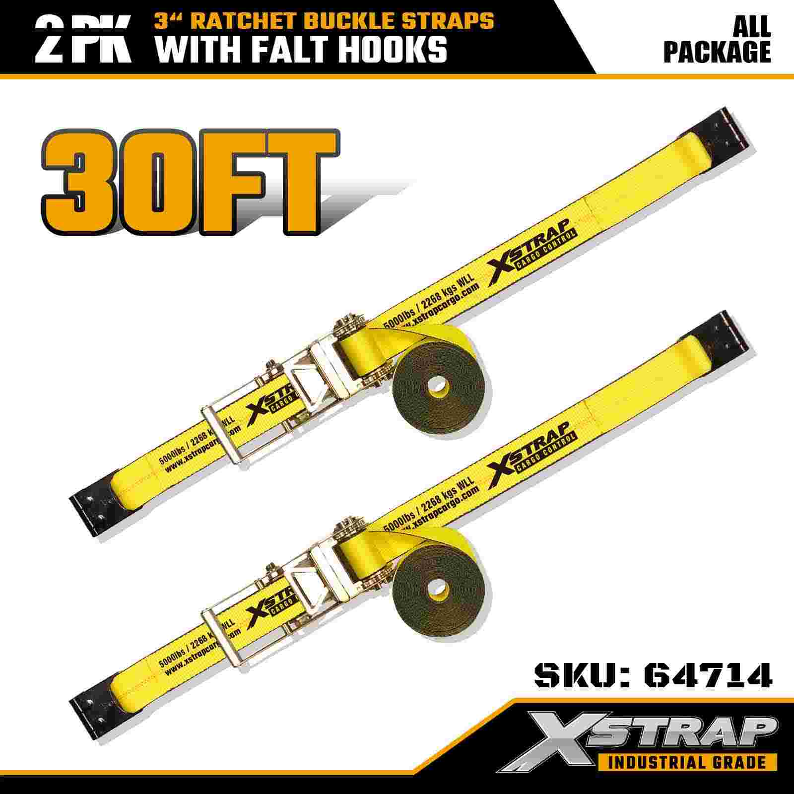 Xstrap 64714 3" x 30 ft skraldespændestropper (2-pak) – Flade kroge, 5.000 lbs lastekapacitet, 15.000 lbs brudstyrke. Disse kraftige stropper er designet til professionel lastkontrol og giver udvidet rækkevidde og dobbeltpakkede lastbiler og bekvemmeligheder til industri- og trailertransport.