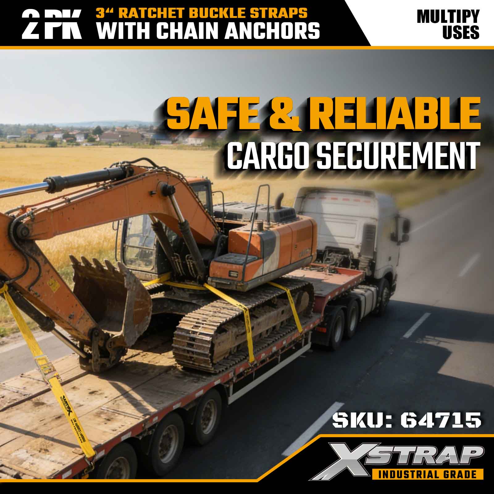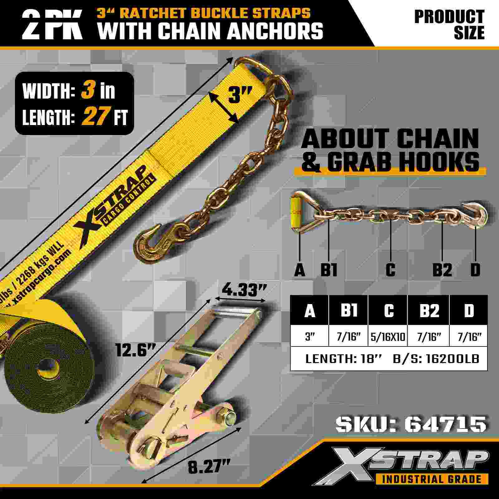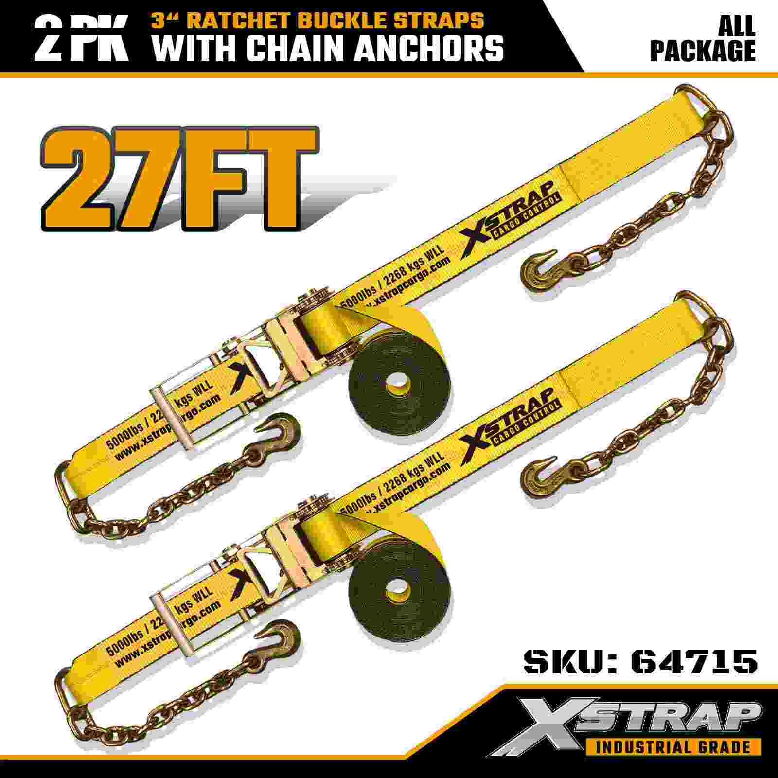 Xstrap 64715 3" × 27 ft skraldespændestropper (2-pak) – udstyret med kraftige kædeankre, konstrueret til krævende lastmiljøer. Med en arbejdsbelastningsgrænse på 5.000 lbs og 15.000 lbs brudstyrke leverer disse stropper stabile, stabile, flade bånd og en professionel, stabil maskine-ydeevne. transport og industriel transport.