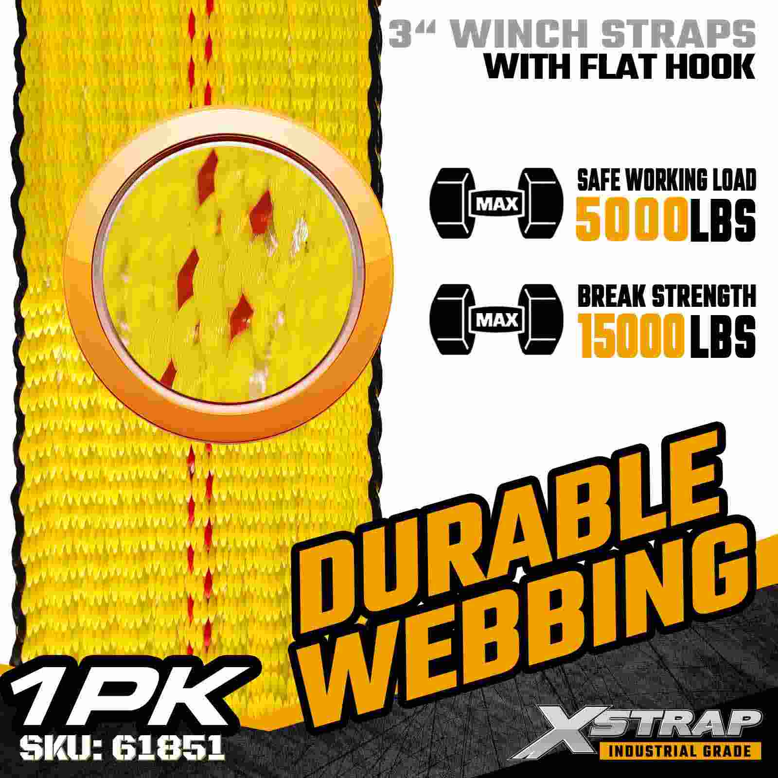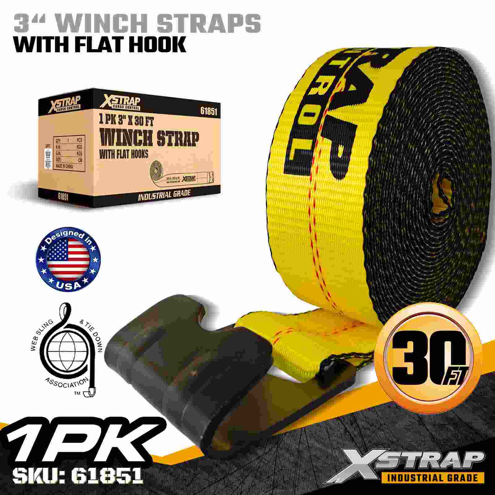Xstrap 61851 3" × 30 fod standard spilstrop er en kraftig lastsikringsrem, der er udviklet til fladvogne og transport med høj kapacitet. Med en forstærket flad krog og ekstra bred 3-tommer polyesterbånd leverer denne 3" spilstrop 5.000 lb, 0 lbs og Bred. Styrke Den er ideel til sikring af tømmer, stål, maskineri og industriel fragt under krævende transportoperationer.