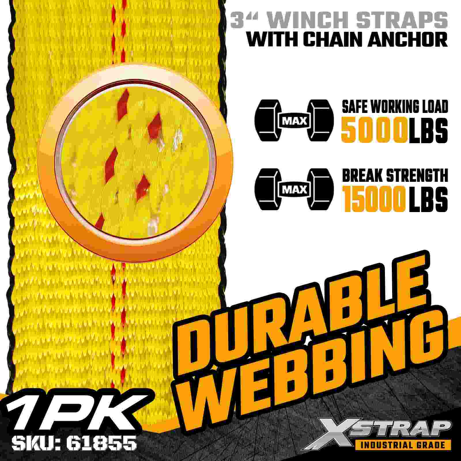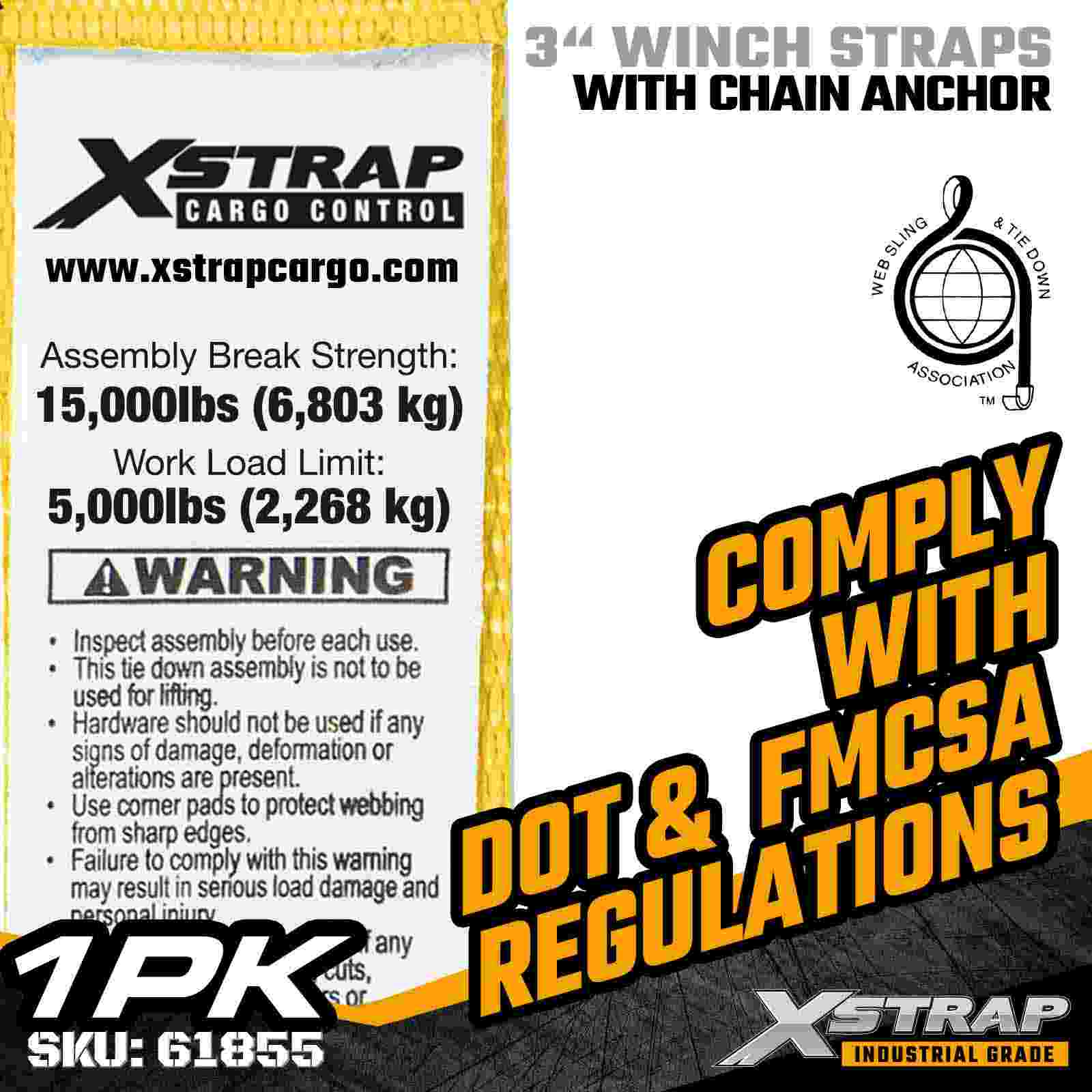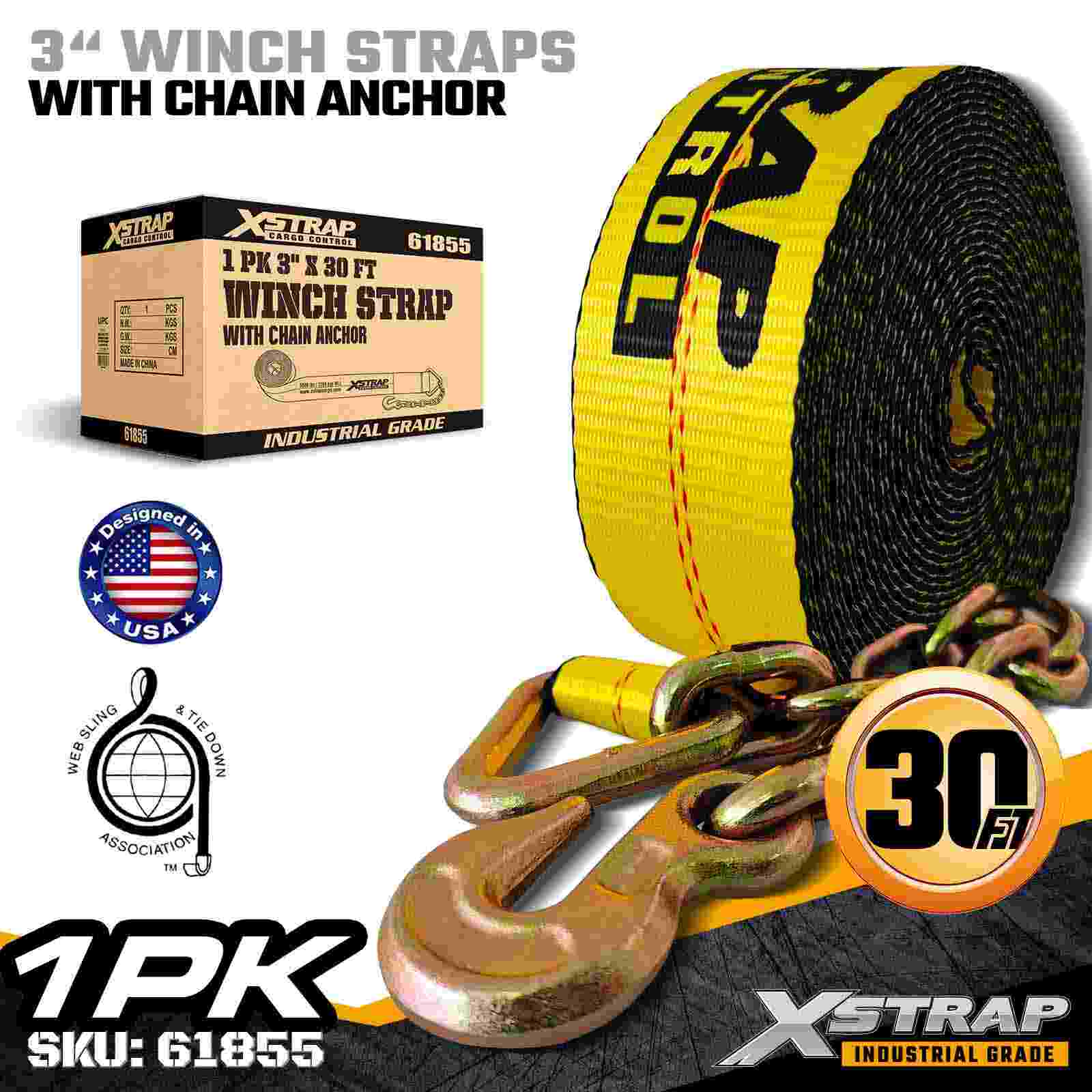 Xstrap 61855 3" × 30 ft standard spilstrop er en kraftig industriel lastsikringsrem designet til fladvogne og overdimensioneret gods. Udstyret med et smedet kædeanker og ekstra bredt 3" polyesterbånd, leverer denne 3" spilstrop en 5.000 lbs, 50 lbs og 50 arbejdsgrænse Styrke Den forlængede længde på 30 fod gør den ideel til at sikre bredere, højere eller uregelmæssigt formede laster, der kræver ekstra rækkevidde og stabilitet.