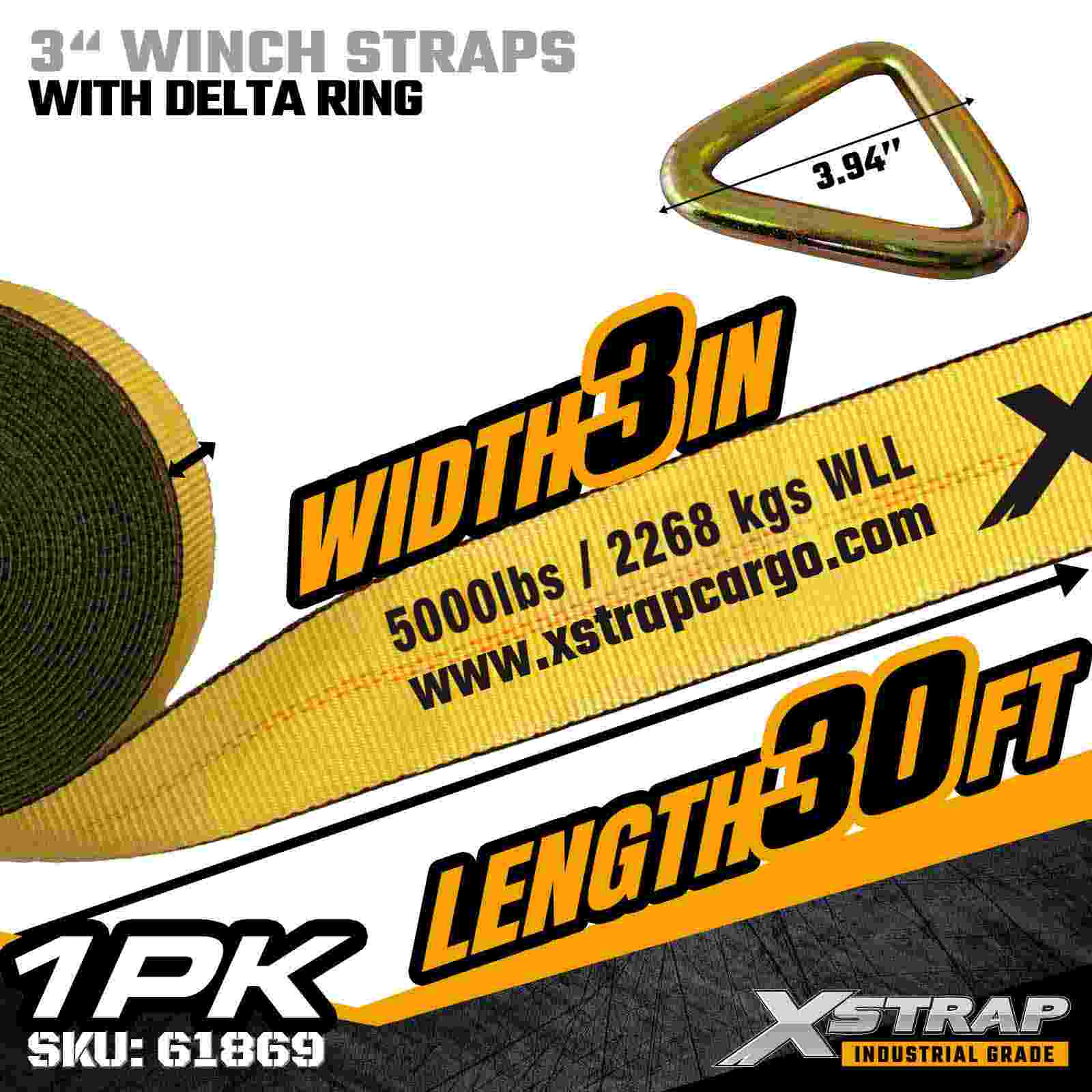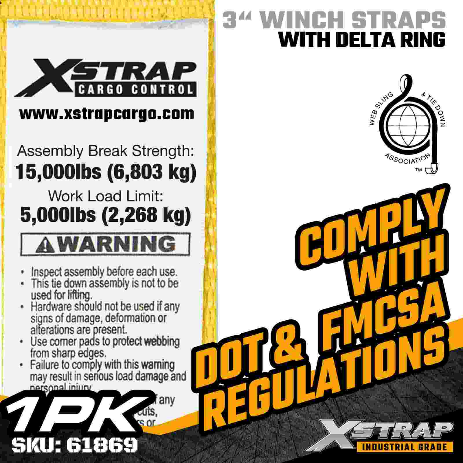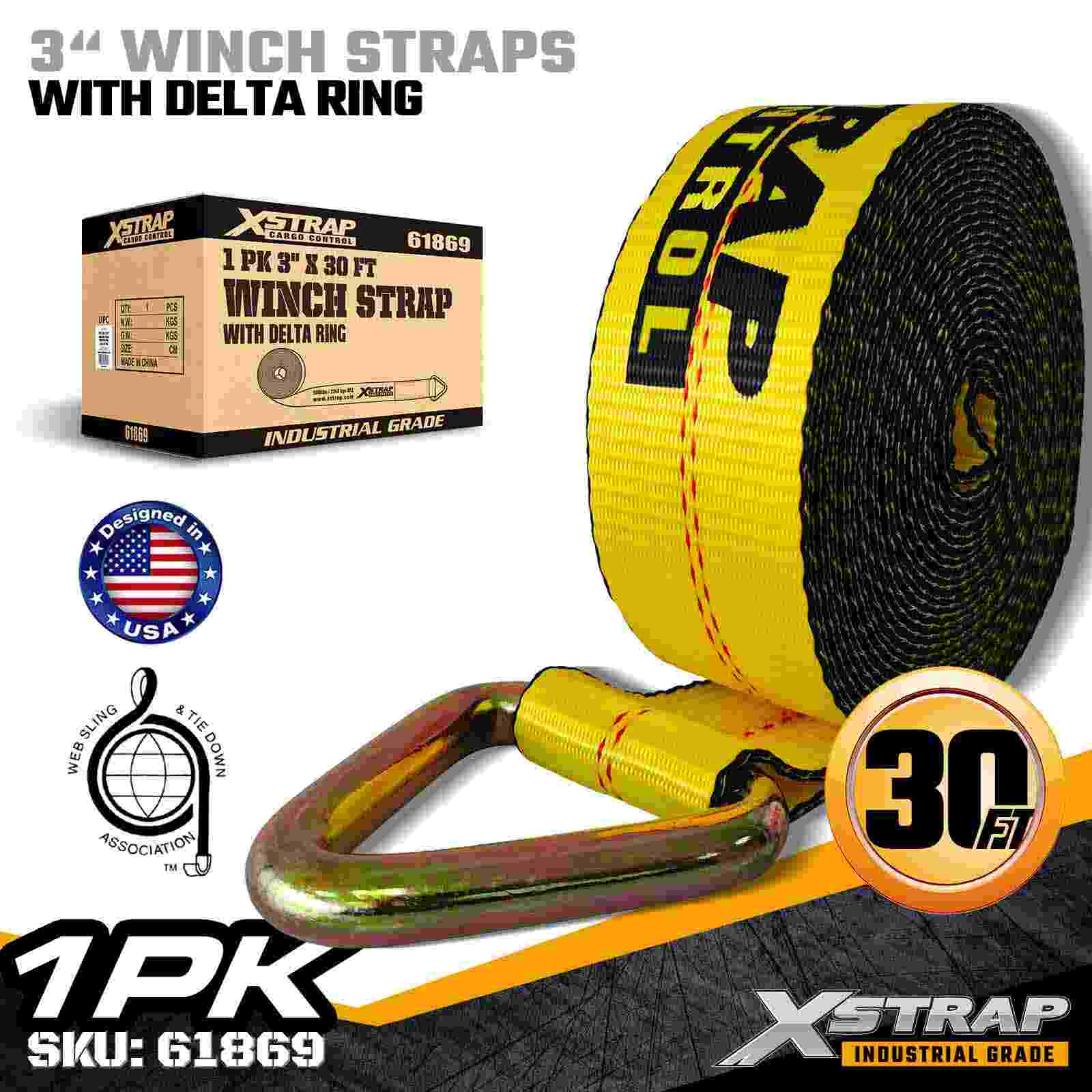Xstrap 61869 3" × 30 ft standard spilstrop er en kraftig lastsikringsrem, der er udviklet til fladvogne og højkapacitetstransport. Med en forstærket Delta-ring og ekstra bred 3-tommer polyesterbånd leverer denne 3" spilstrop 5.000 lbs, 00 lbs og 1.000 lbs. Styrke Den er ideel til sikring af overdimensionerede laster som tømmer, stål, maskineri og industriel fragt under krævende transportoperationer.
