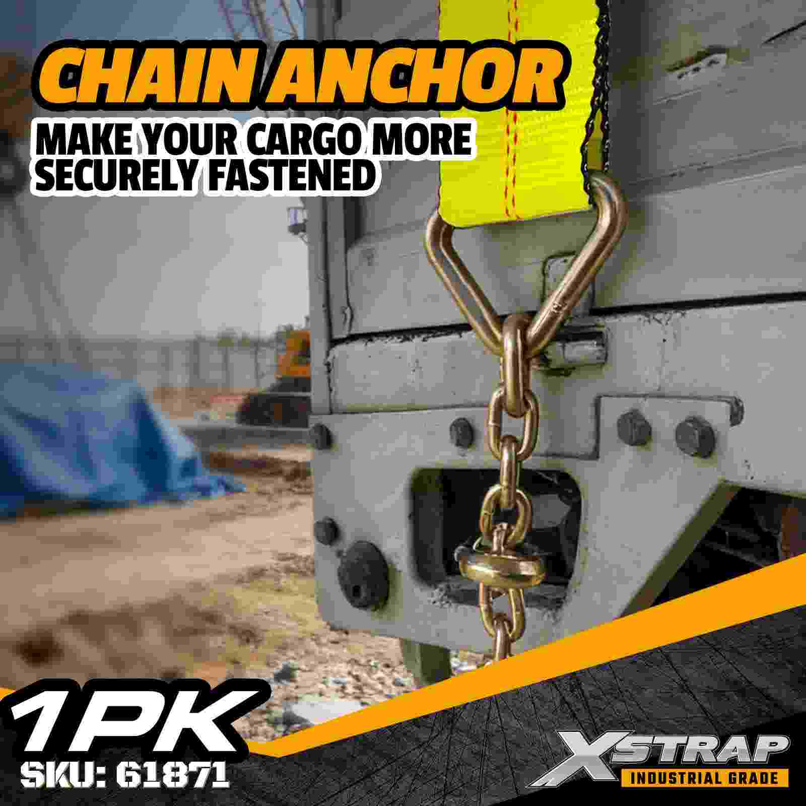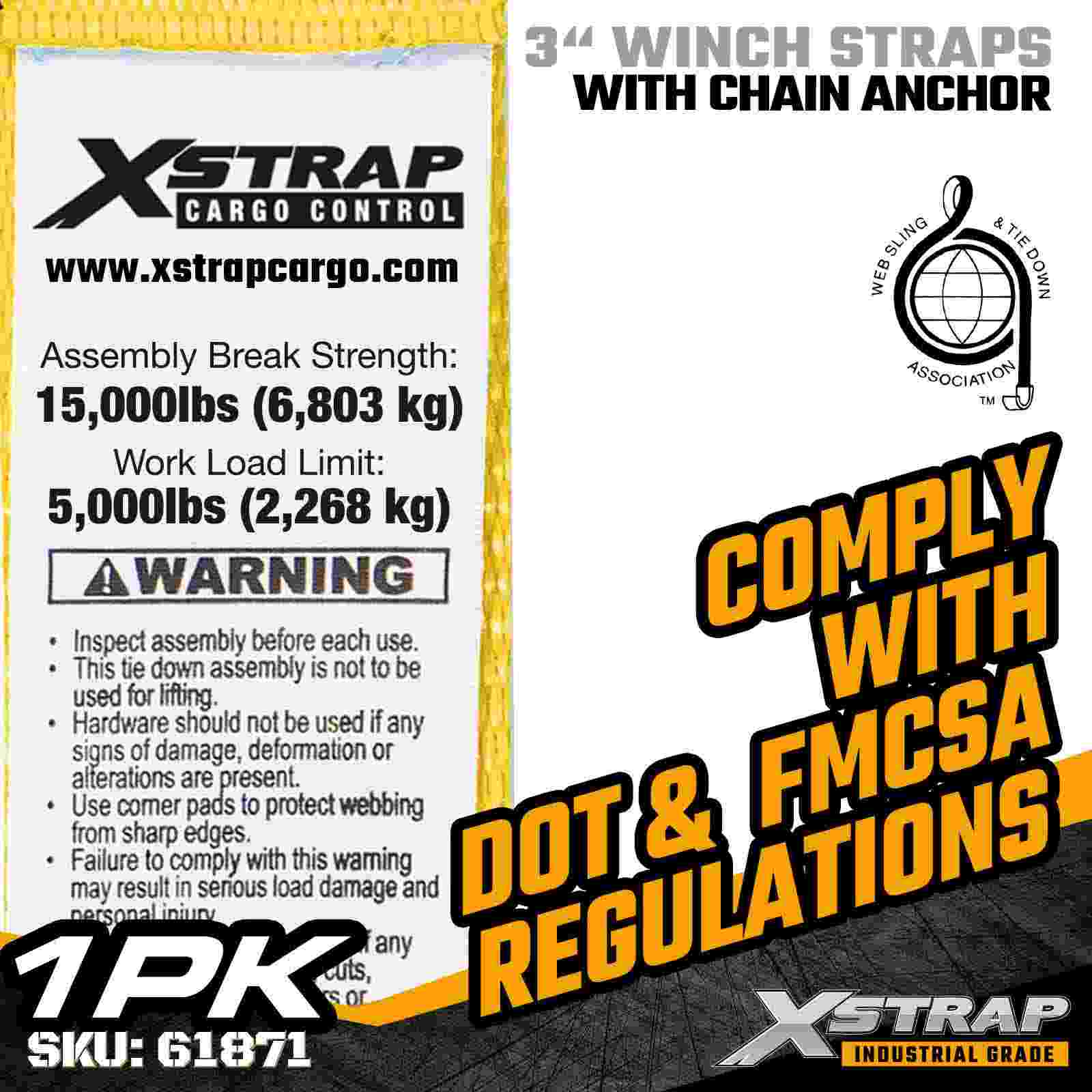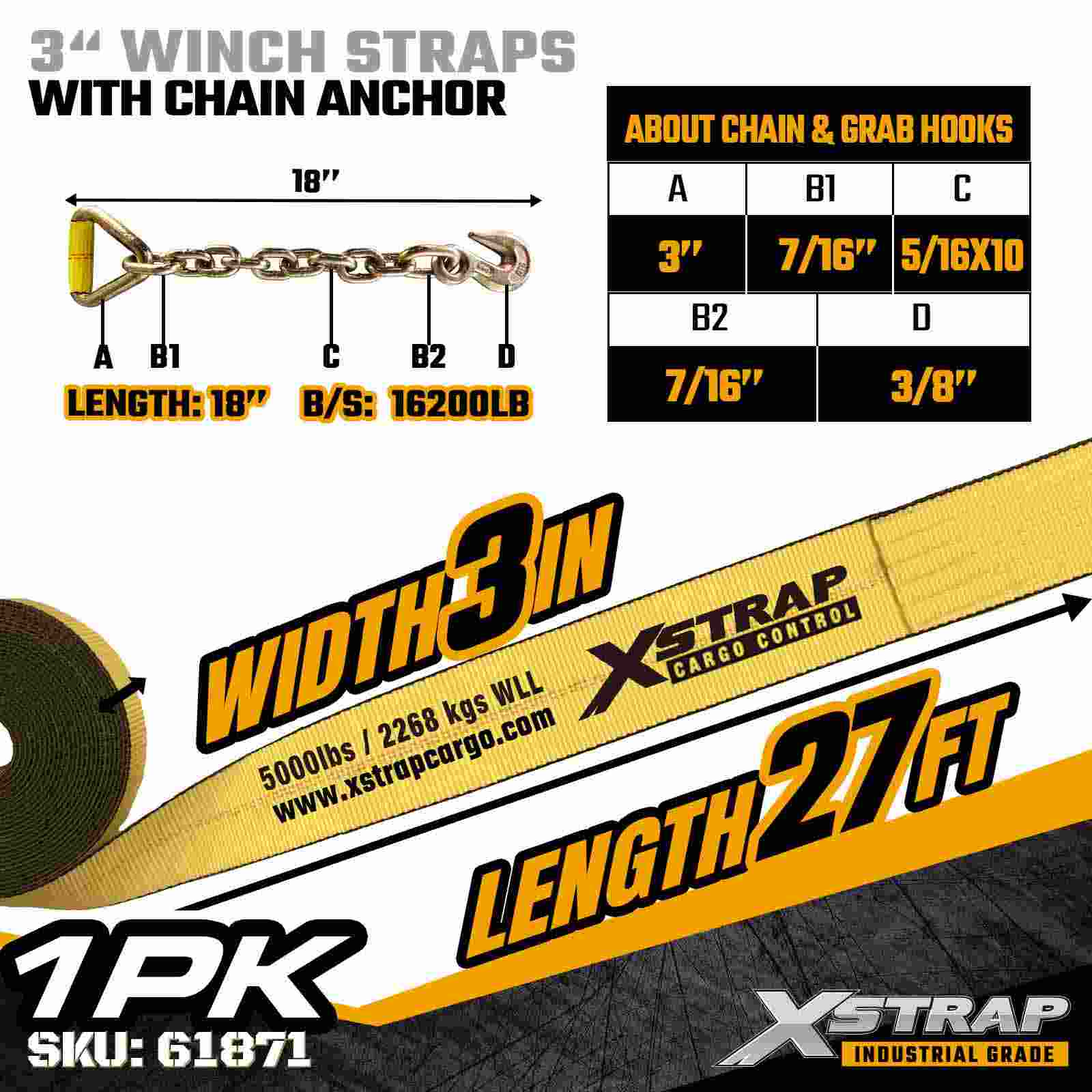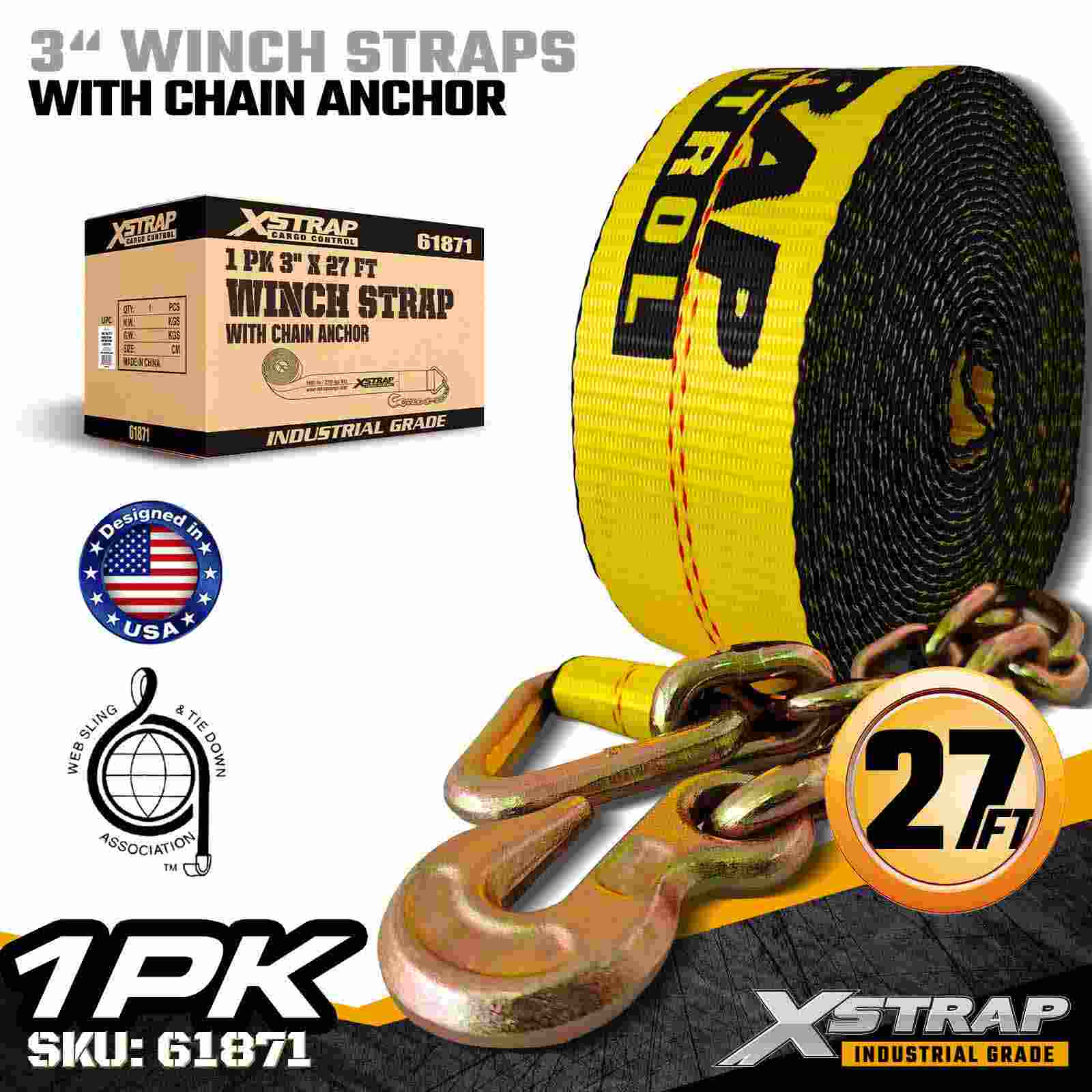 Xstrap 61871 3" × 27 ft standard spilstrop er konstrueret til kraftig lastsikring på fladvogne. Med et smedet kædeanker og ekstra bred 3-tommer polyesterbånd leverer denne 3" spilstrop en 5.000 lbs arbejdsbelastningsgrænse, den er designet til 1 lbs Break- og Breakth Limit. krævende industrielle applikationer, hvor der kræves maksimal holdestyrke og stabilitet.