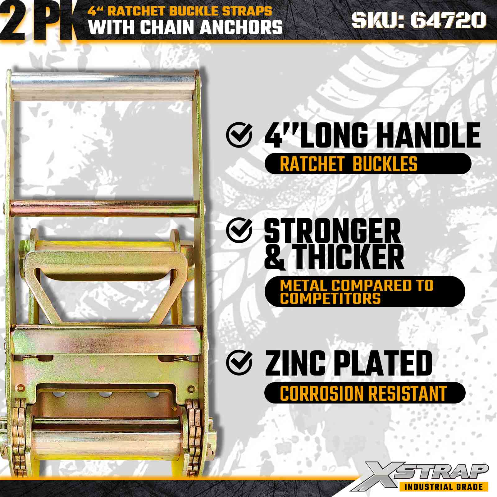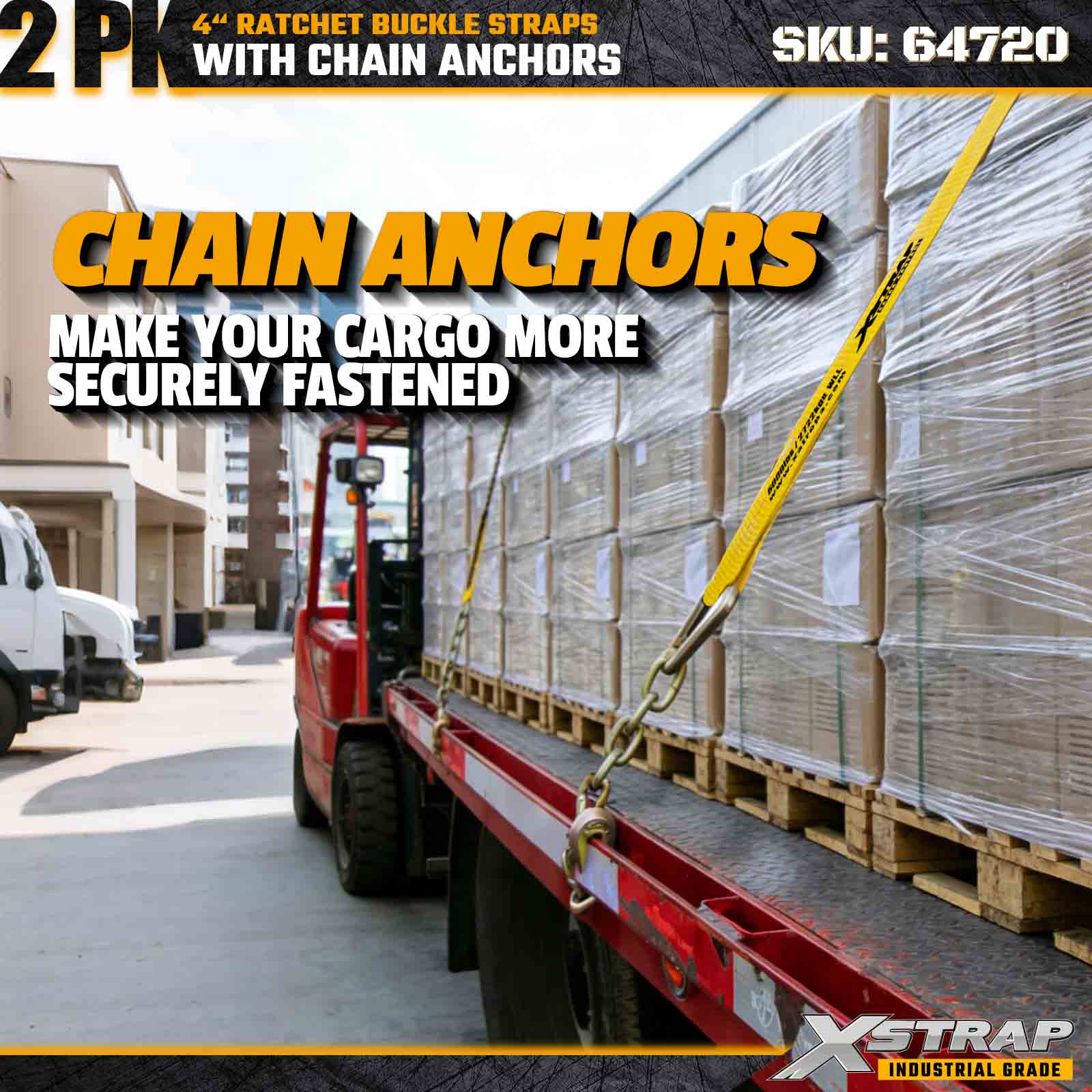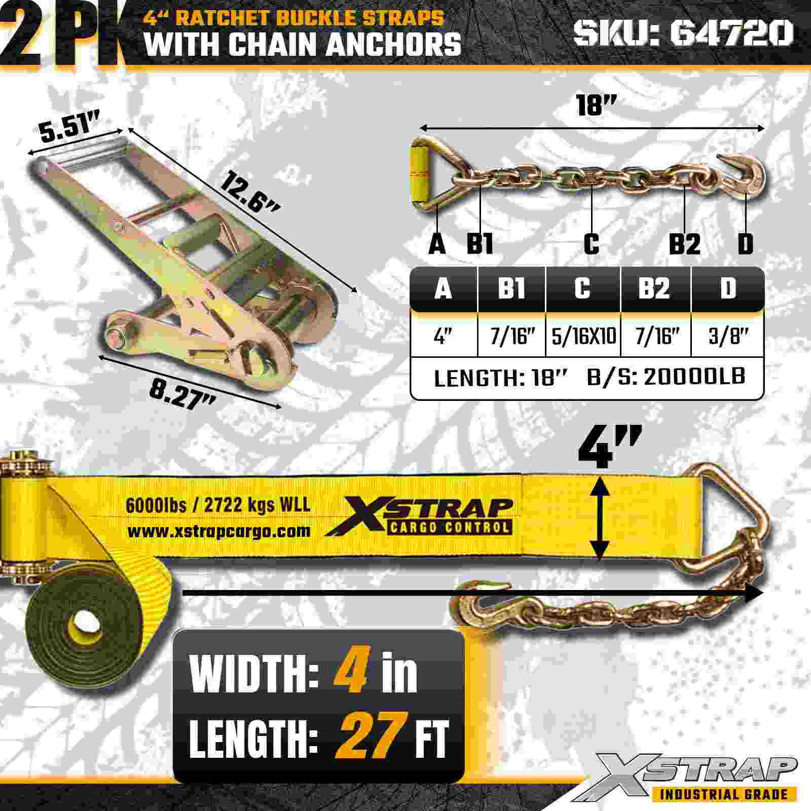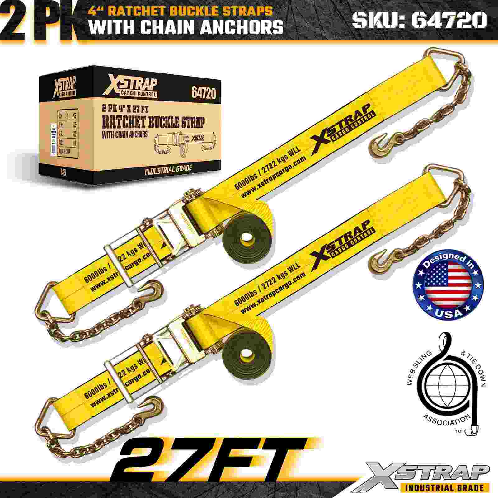 Xstrap 64720 4" × 27 ft skraldespændestropper (2-pak) er konstrueret til kraftig lastsikring og har robuste kædeankre og en forstærket skraldemekanisme. Med en arbejdsbelastningsgrænse på 6.000 lbs og 18.000 lbs er disse flade straps-, habedstrammere ideelle maskintransport, stållaster og industrielle lastanvendelser, der kræver maksimal styrke og pålidelighed.