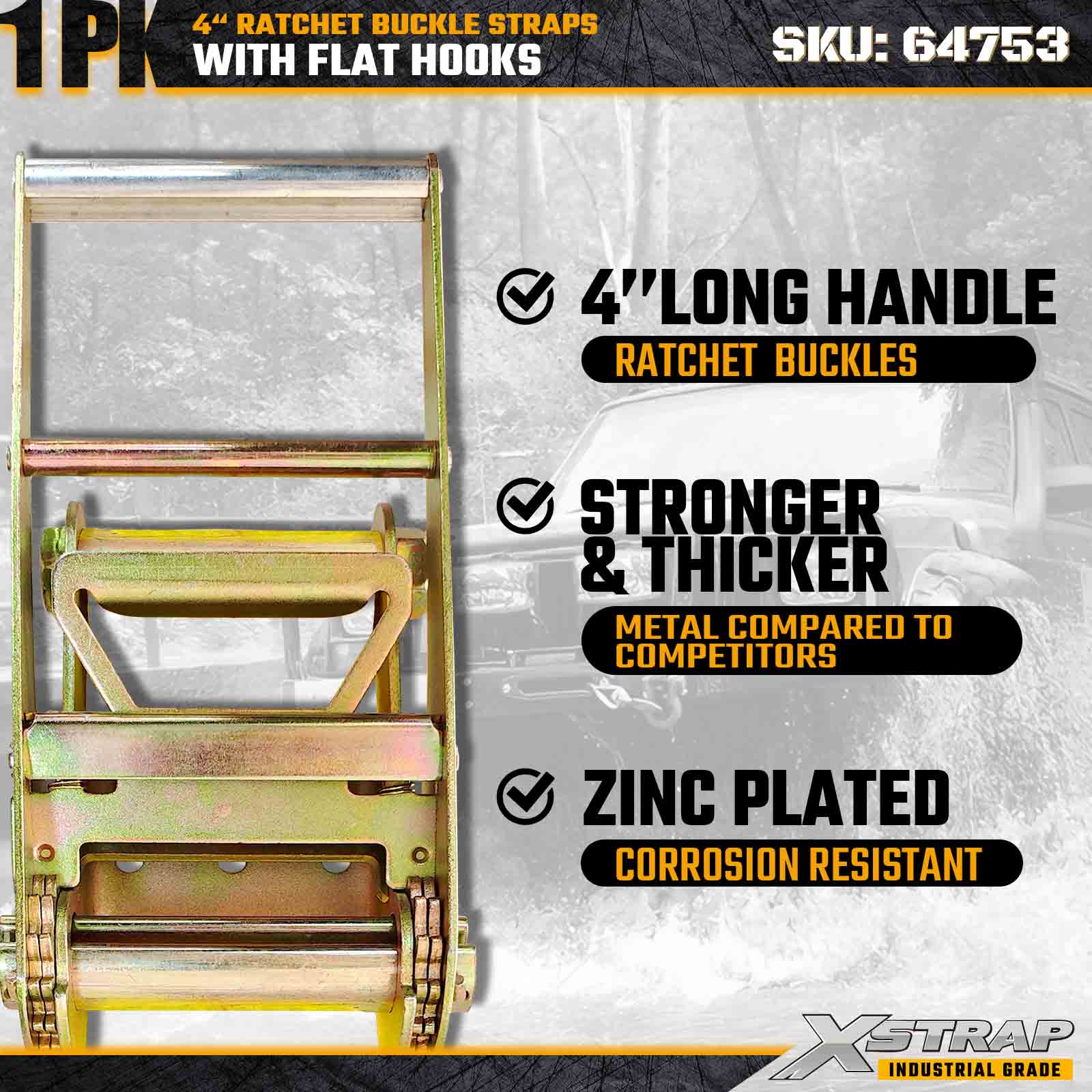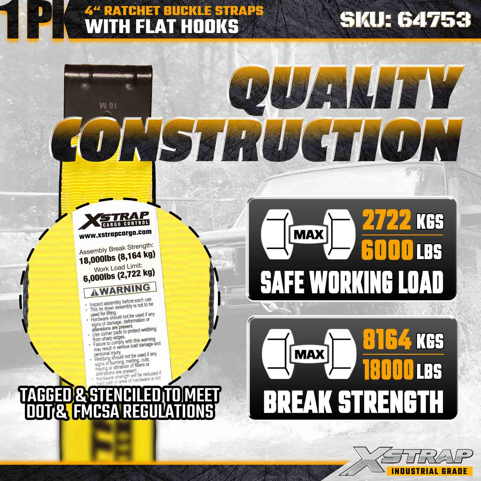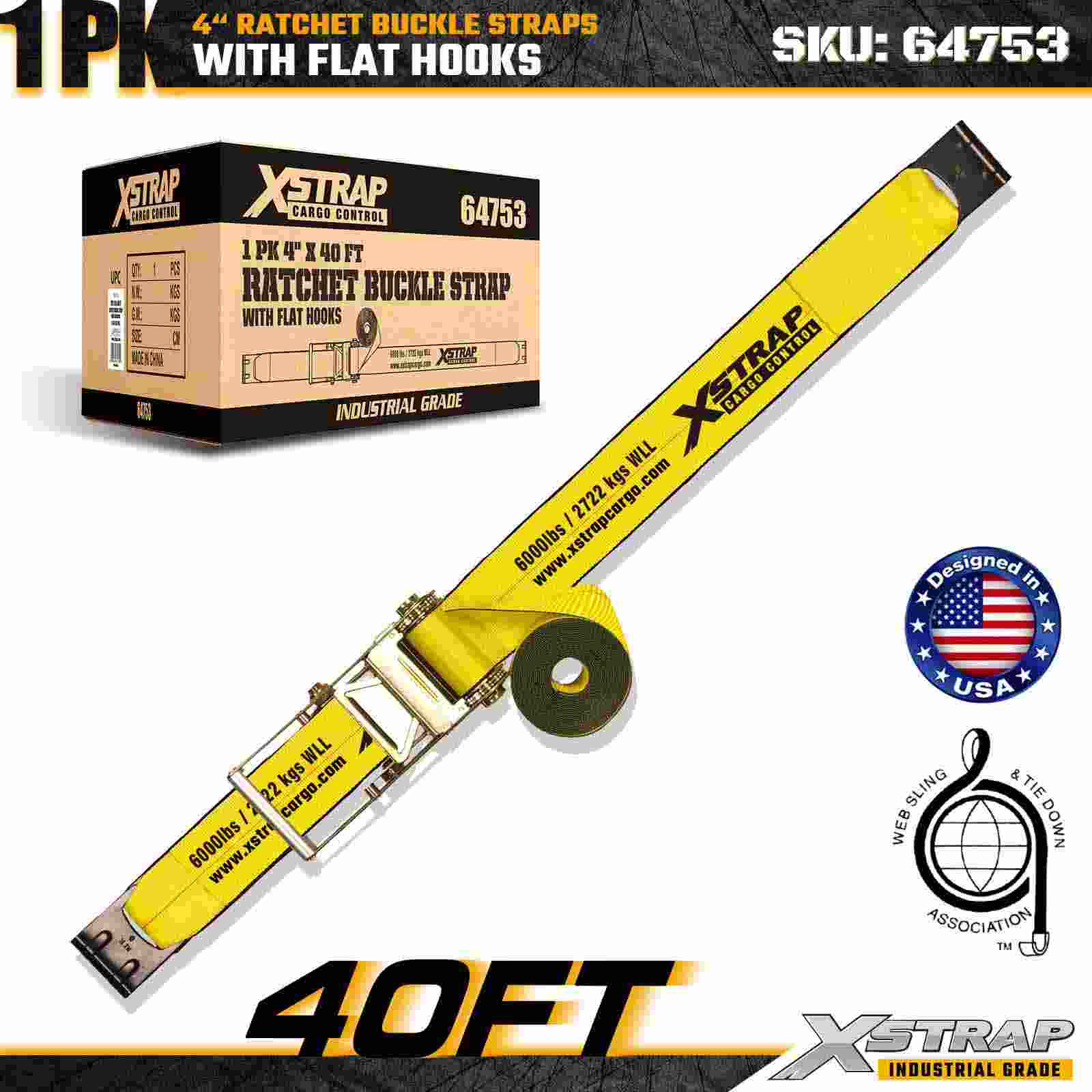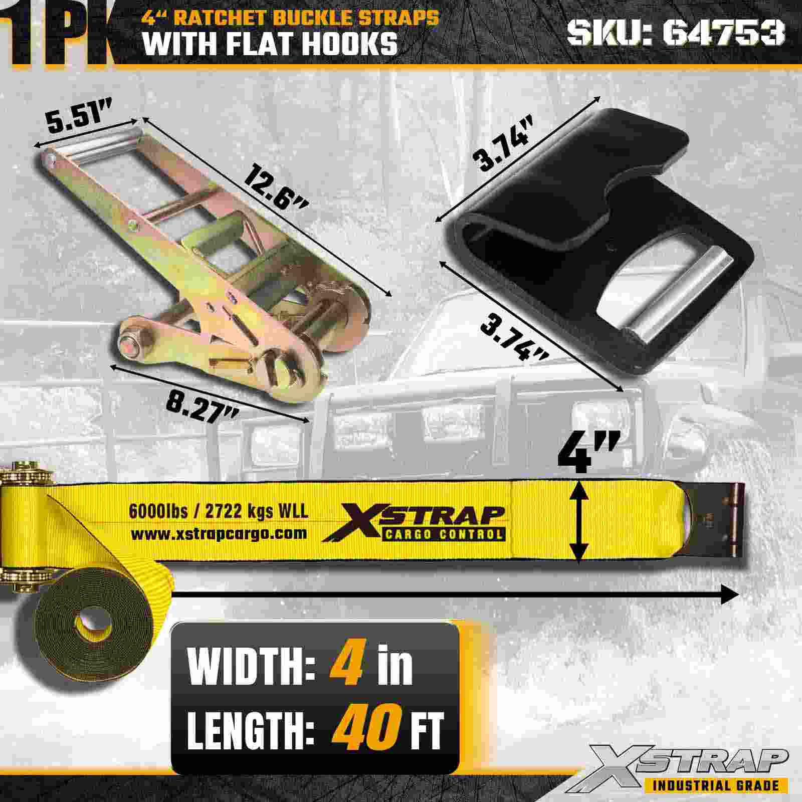 Xstrap 64753 4" × 40 ft skraldespændestrop (1-pakke) er designet til kraftig lastsikring og har forstærkede flade kroge og en holdbar skraldemekanisme. Med en arbejdsbelastningsgrænse på 6.000 lbs og 18.000 lbs er denne ekstra stærk fladskrue ideel til brudstyrke overdimensionerede laster, maskintransport og industrielle lastanvendelser.