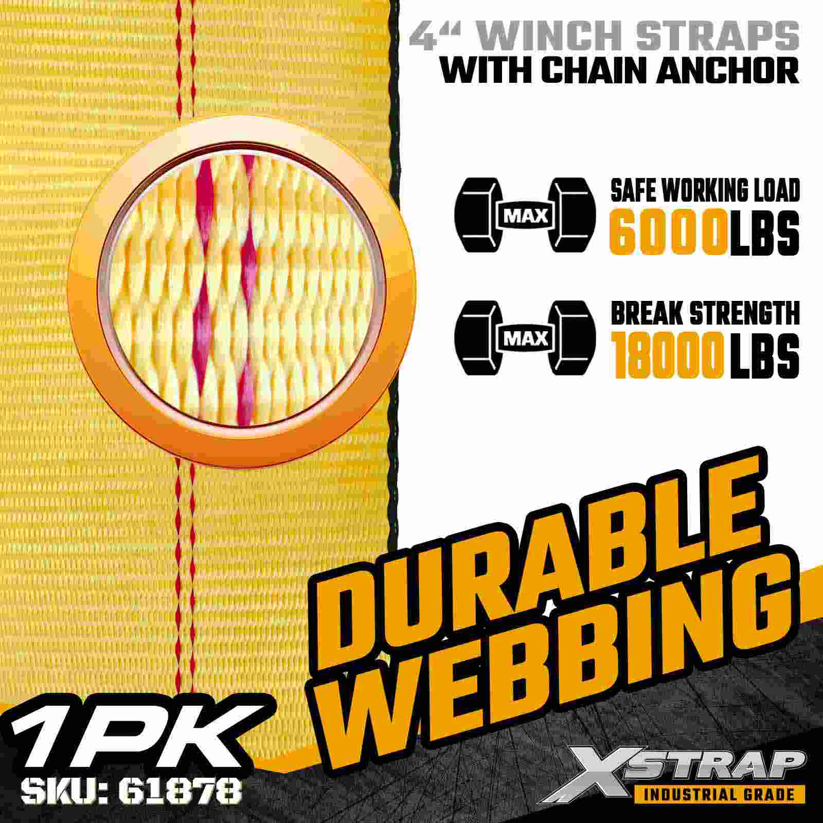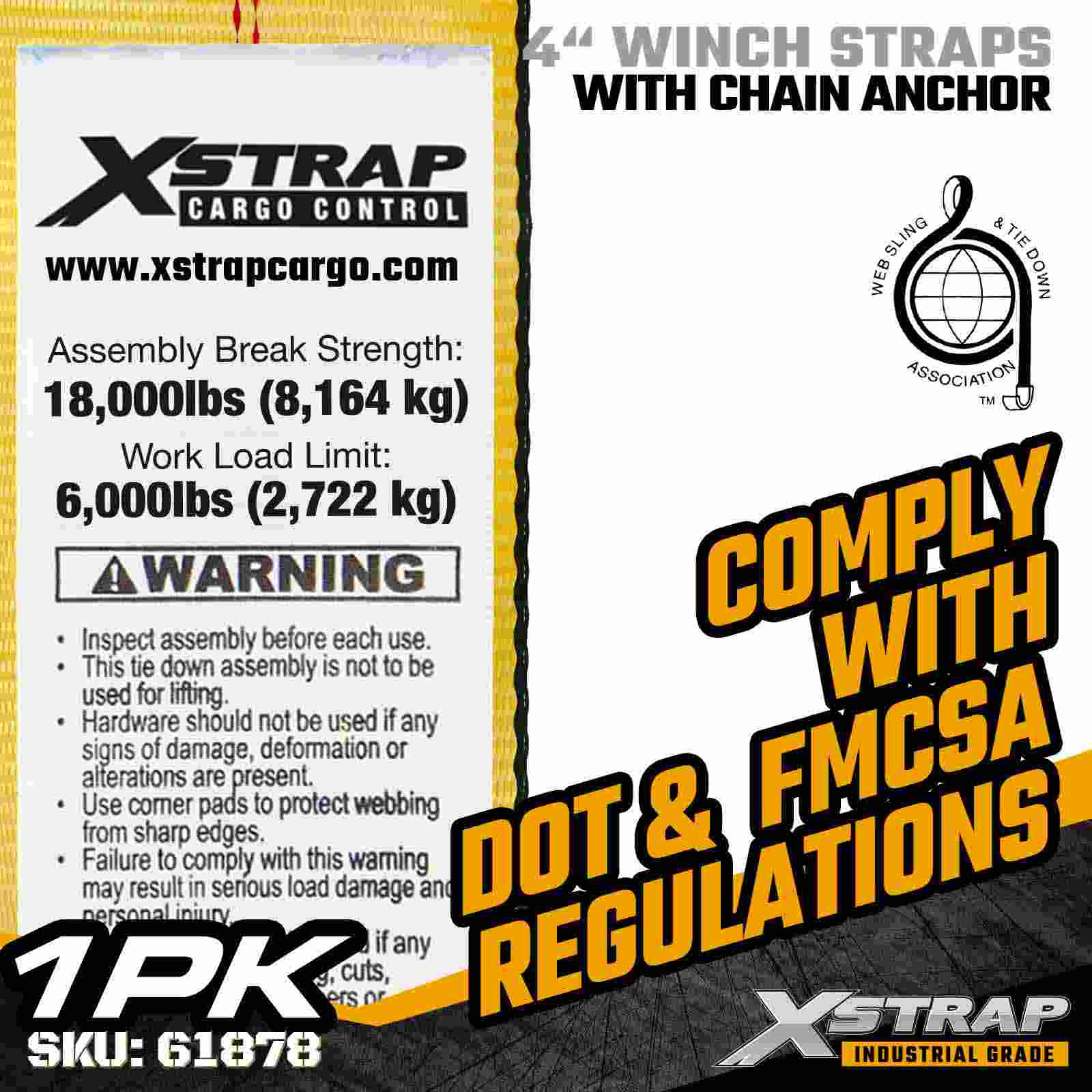 Xstrap 61878 4" × 27 fod standard spilstrop er en kraftig industriel lastsikringsrem, der er udviklet til fladvogne og ekstreme belastningsforhold. Med et smedet kædeanker og ultrabredt 4-tommers polyesterbånd, leverer denne 4" spilstrop en 6.000 lbad og Breaking 180 lbs. Styrke Kædeanker-designet giver uovertruffen greb og holdbarhed, hvilket gør det ideelt til sikring af stål, maskiner og anden højspændingsfragt.