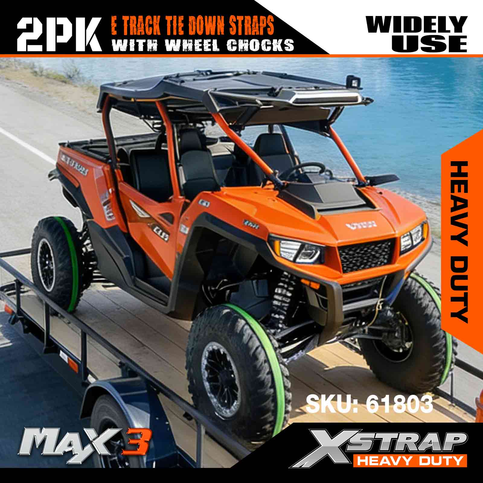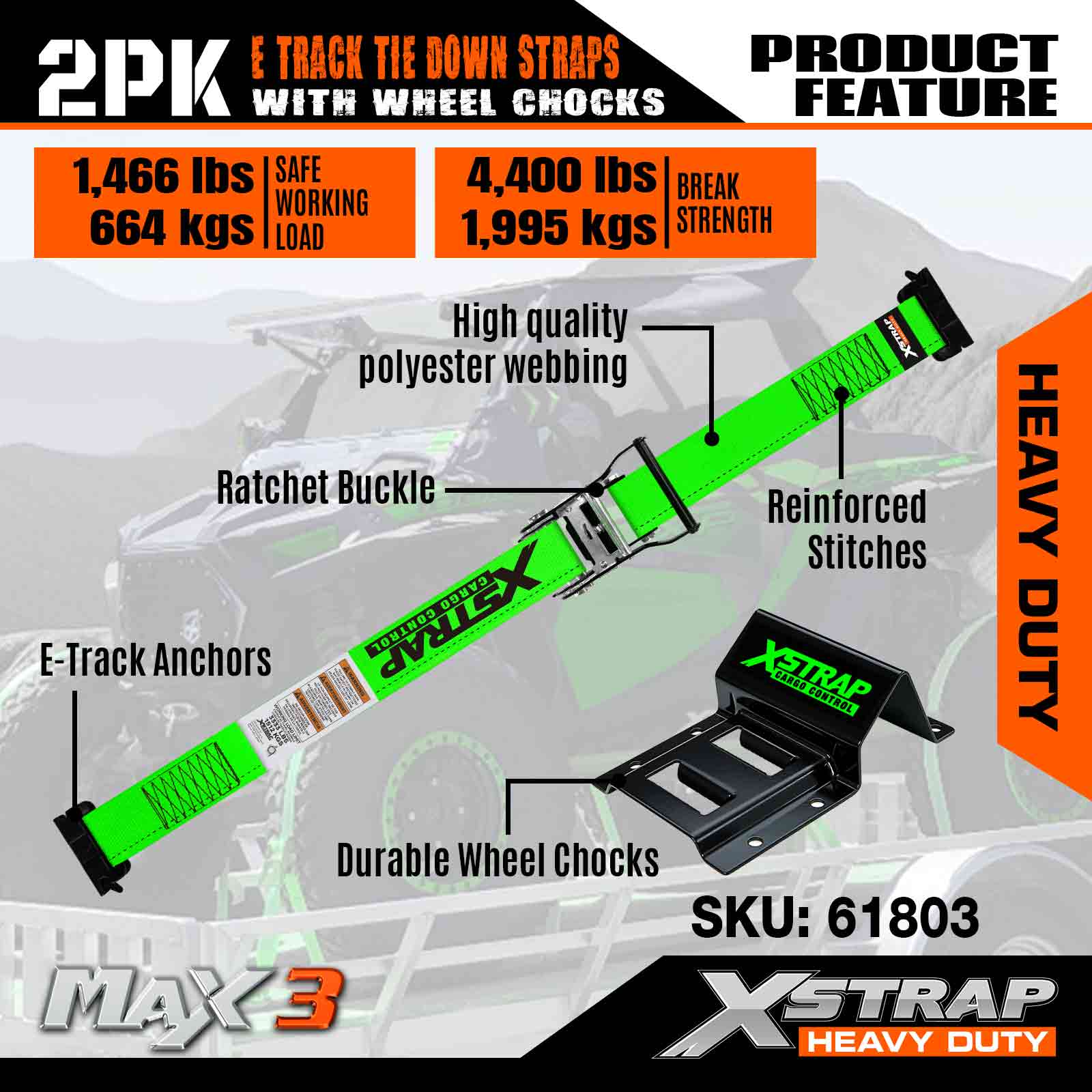 - Ubesværet installation - Bare kør din ATV op og over stopklodserne installeret på gulvet, indtil dækkene passer tæt ind imellem dem. Vikl derefter E-Track-remmene rundt om dækkene og klik dem sikkert ind i E-Track-åbningerne på hjulklodserne. Det er en ligetil proces, der sikrer hurtig og nem opsætning til sikring af dit køretøj.