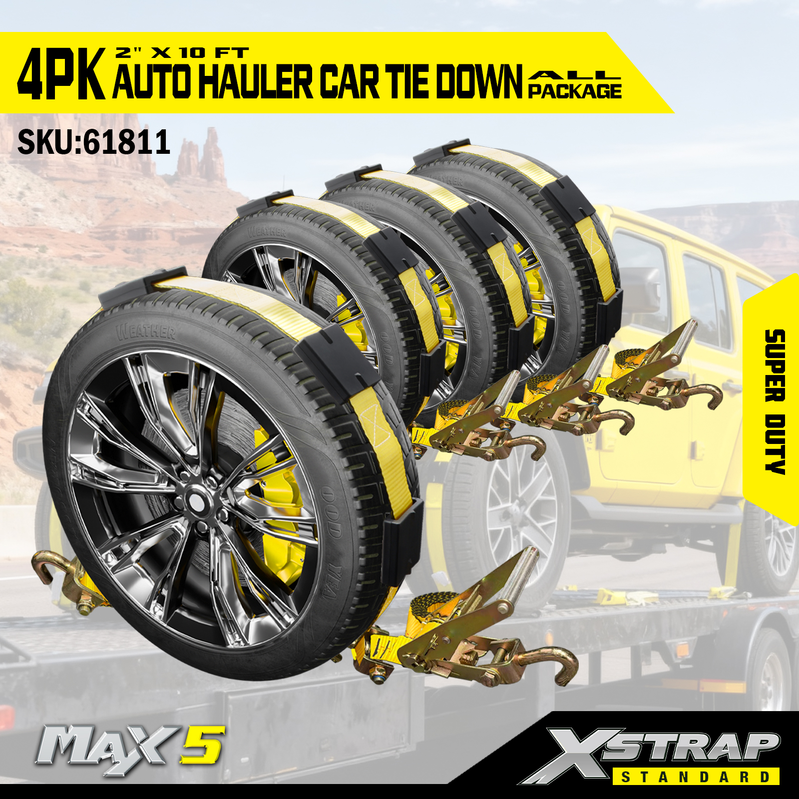 - Komponenter med industriel styrke - Hver rem inkluderer tre kroge, en rachetstrammer og tre gummidækklamper og gør det muligt for køretøjet at køre på sin egen affjedring, hvilket eliminerer stødoverførsel. Løgkrogene passer ind i standard ''pooch-huller'' eller ''stjernehuller'', og stroppen omgiver hjulet og spænder væk fra