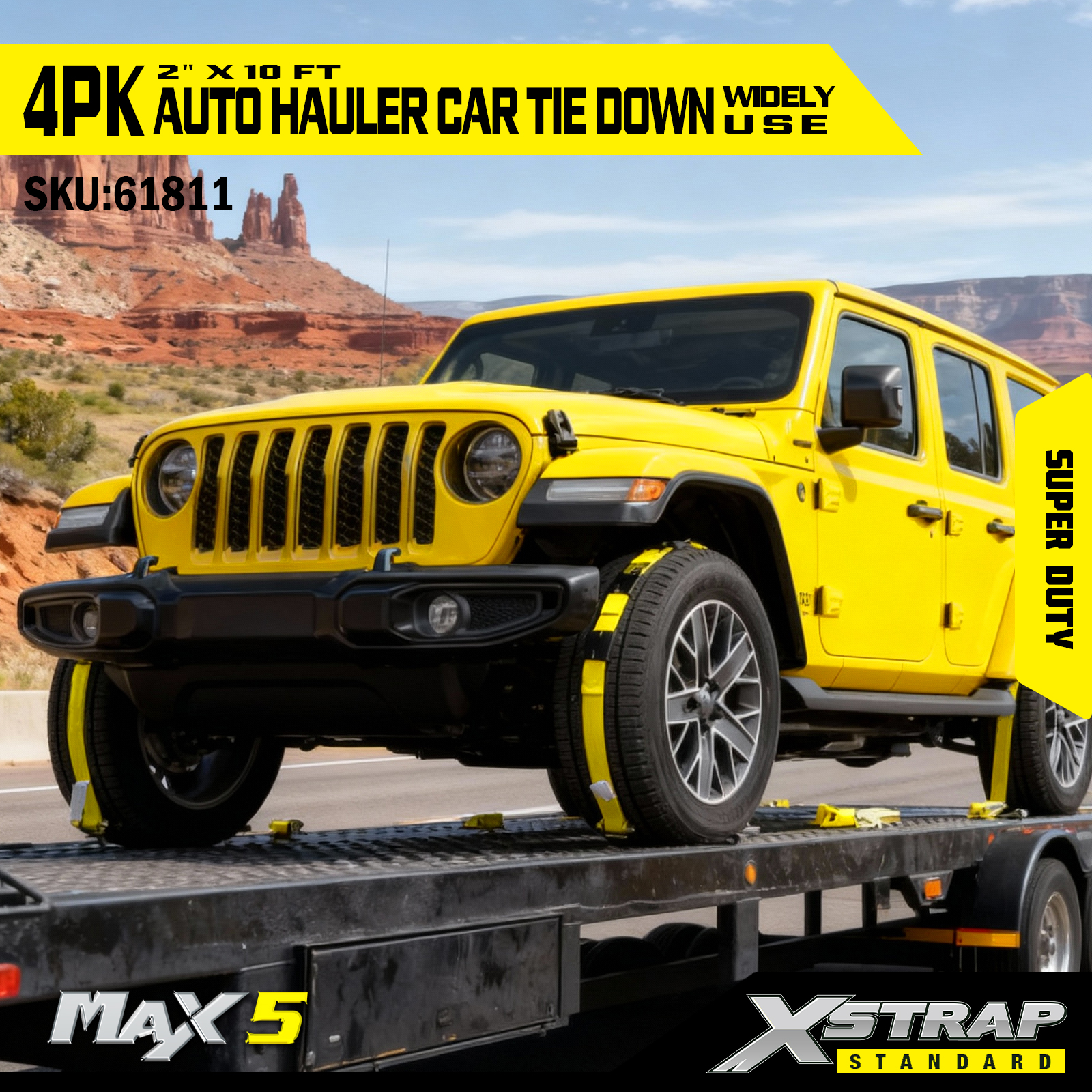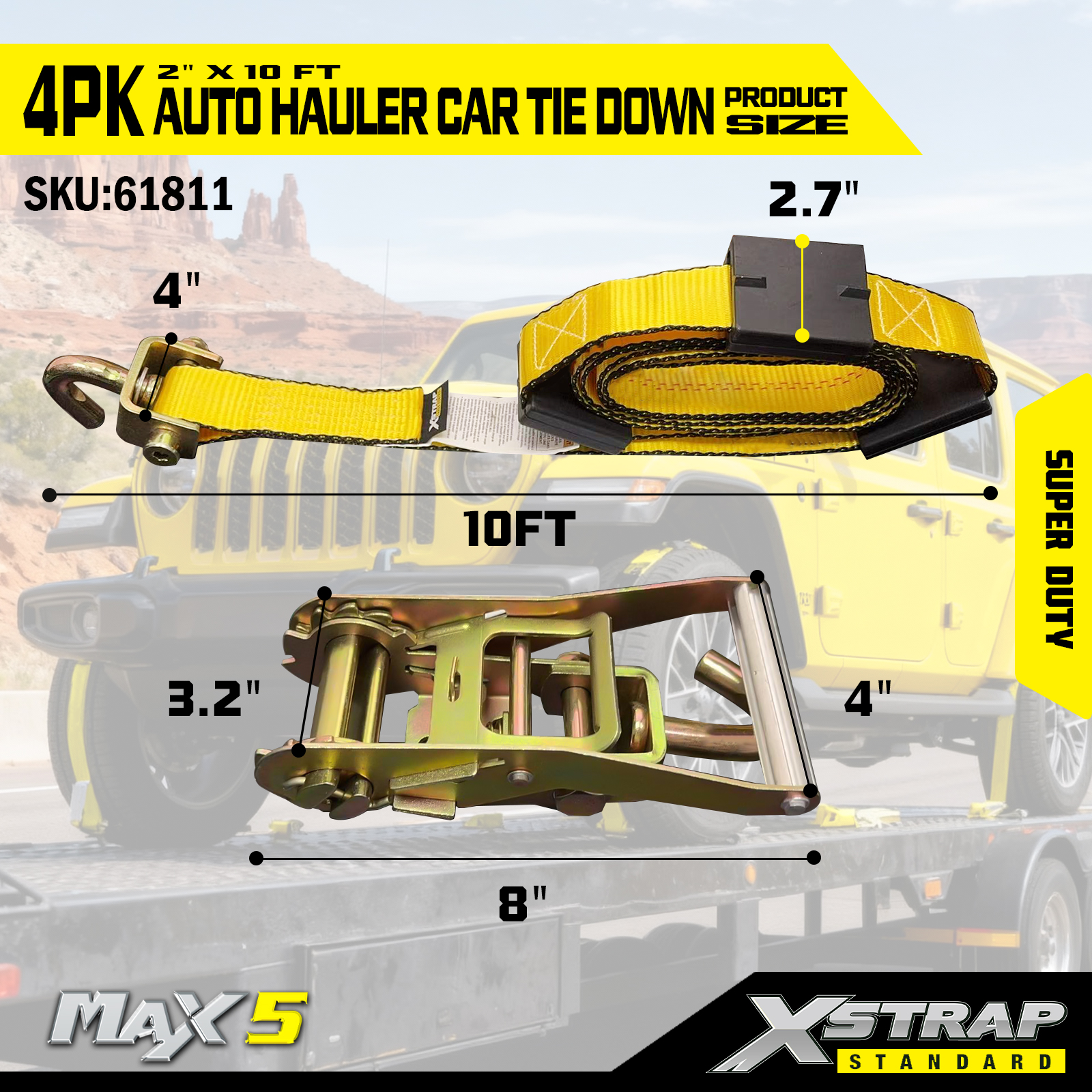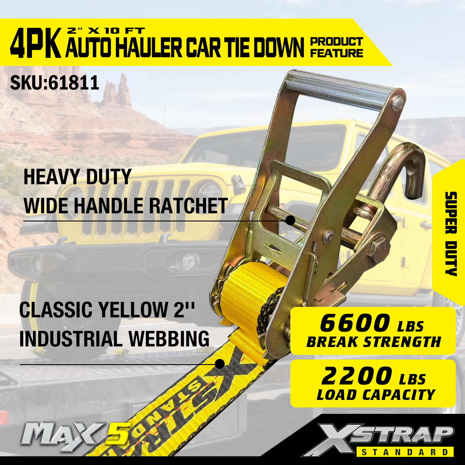 - Super Duty Ydeevne: Hver rem har en sikker arbejdsbelastning på 2.200 Sikker arbejdsbelastning er stemplet på advarselsskiltet på hver fastspændingsremme for nem inspektion, den er bygget til at håndtere tunge køretøjer og krævende transportscenarier.