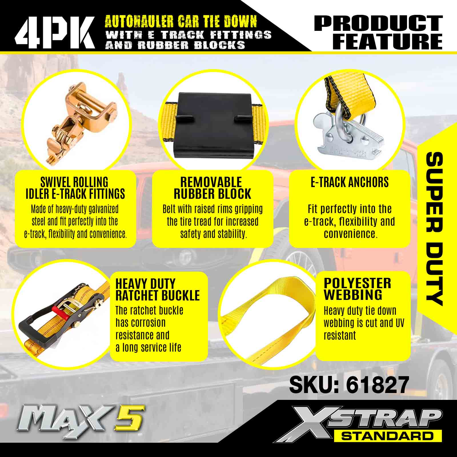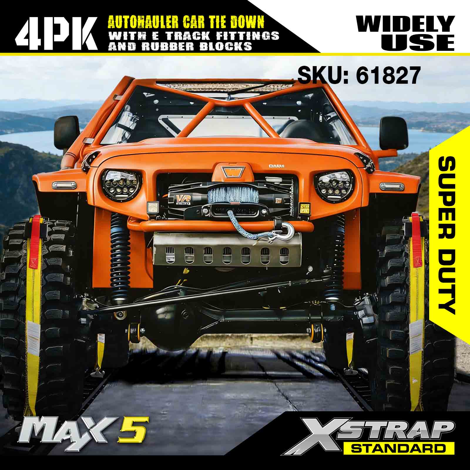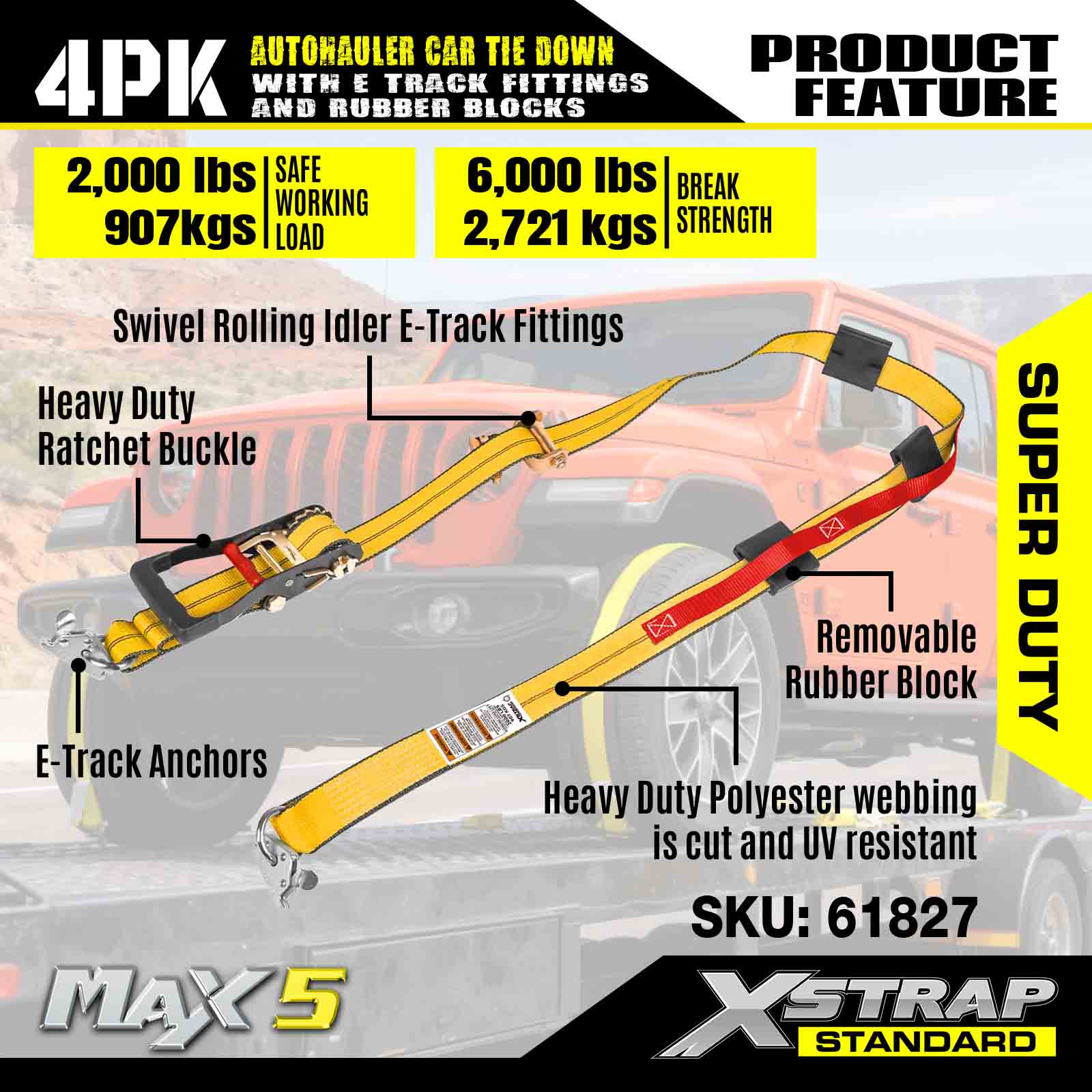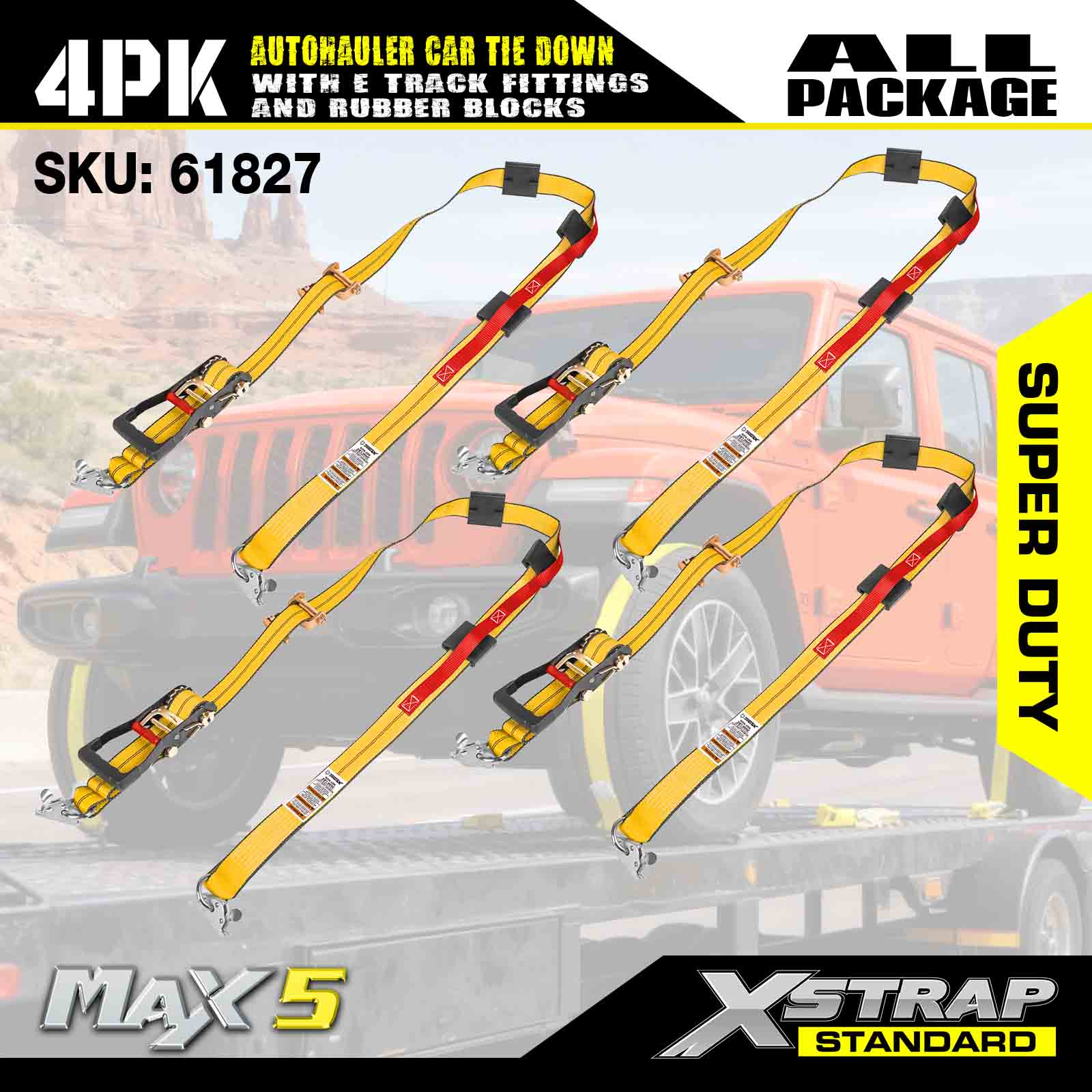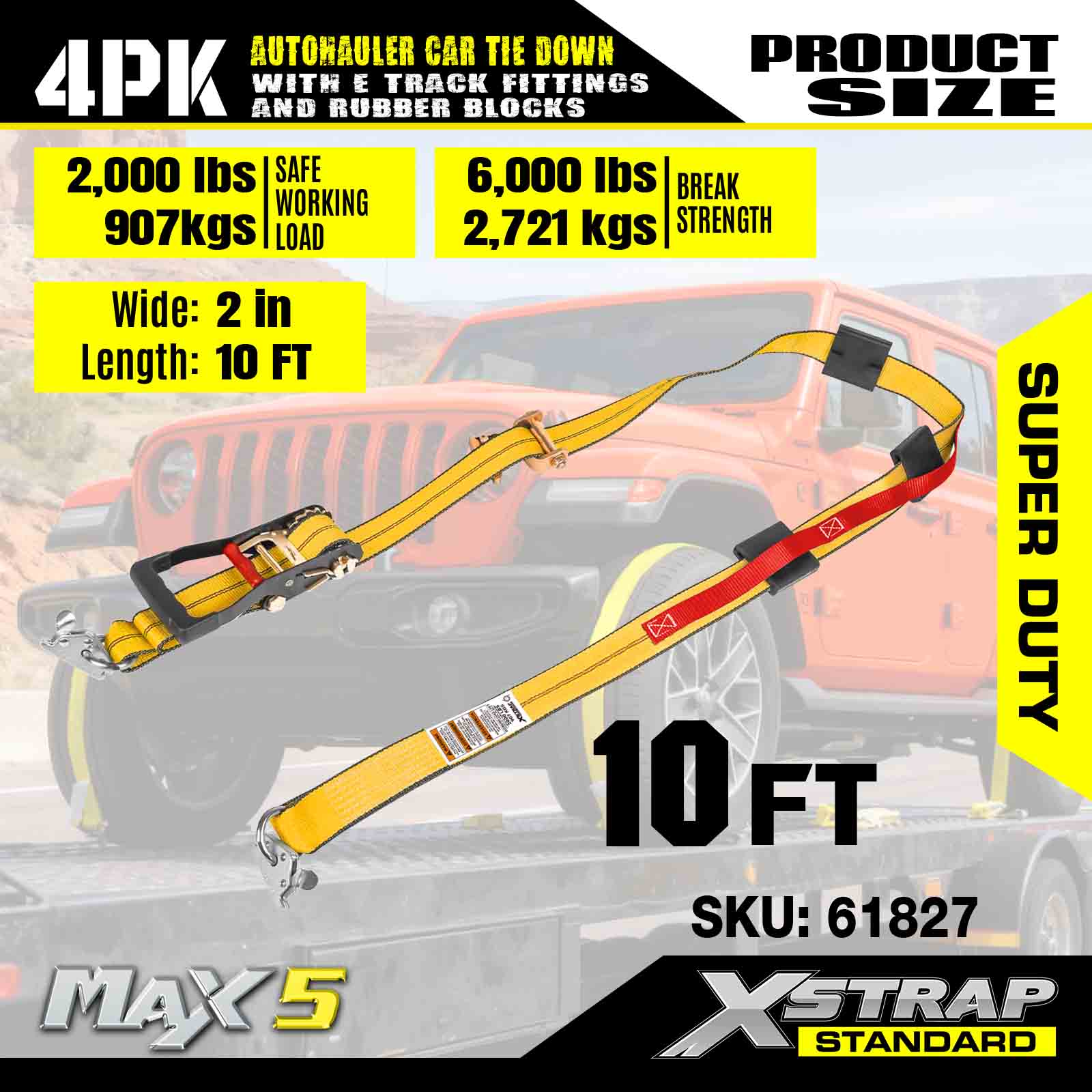 Xstrap Xstrap E Track Dækstropper til Trailer Heavy Duty 2" x 10" Auto Hauler Strap-6.000lb garanteret brudstyrke-(4) Premium Vehicle Tie Down Kit med gummiklodser Hjulbindinger til lastbil, UTV