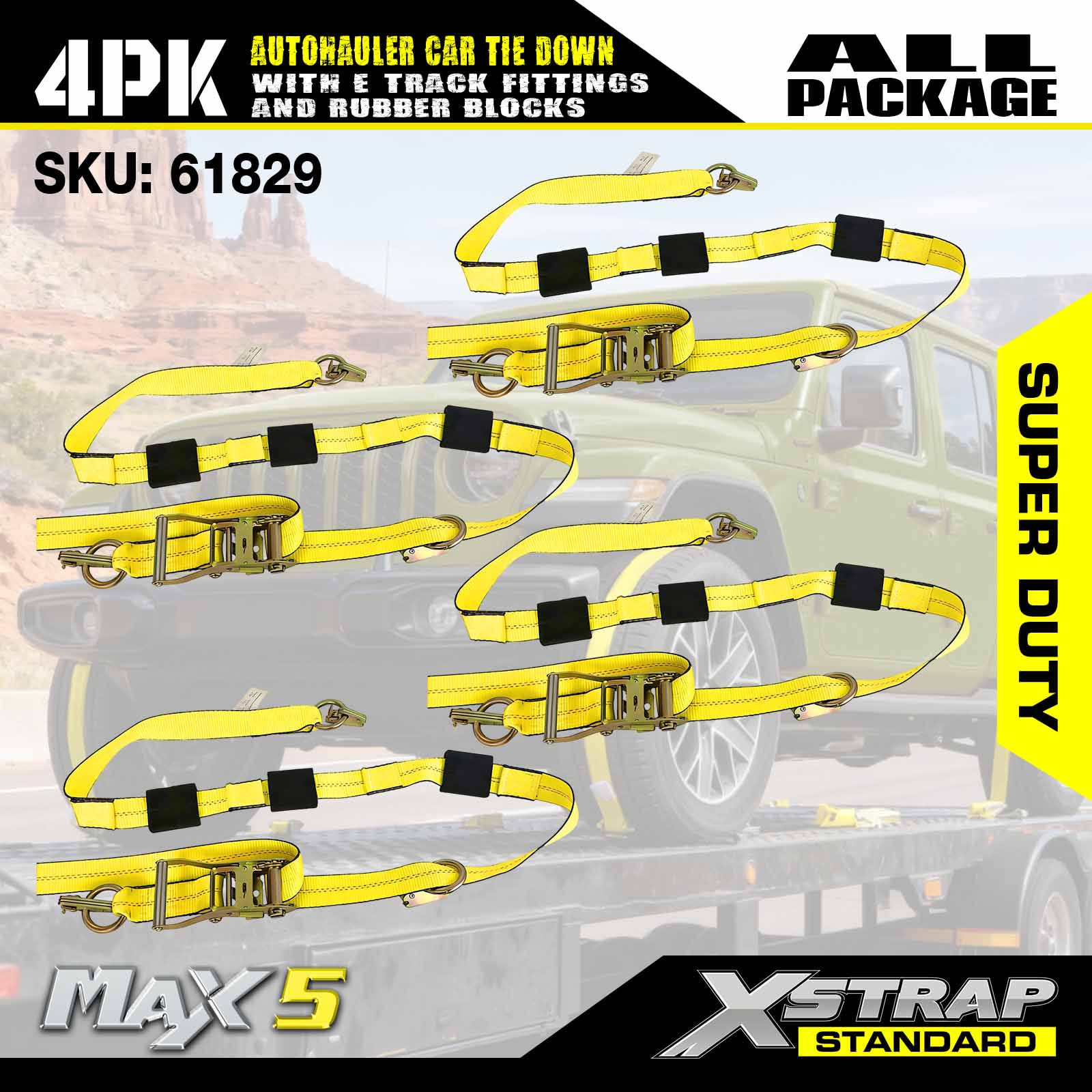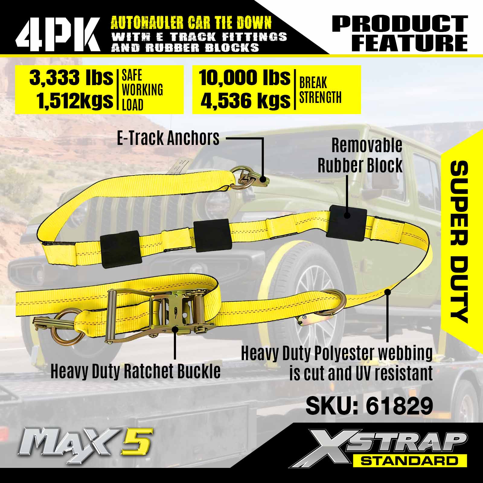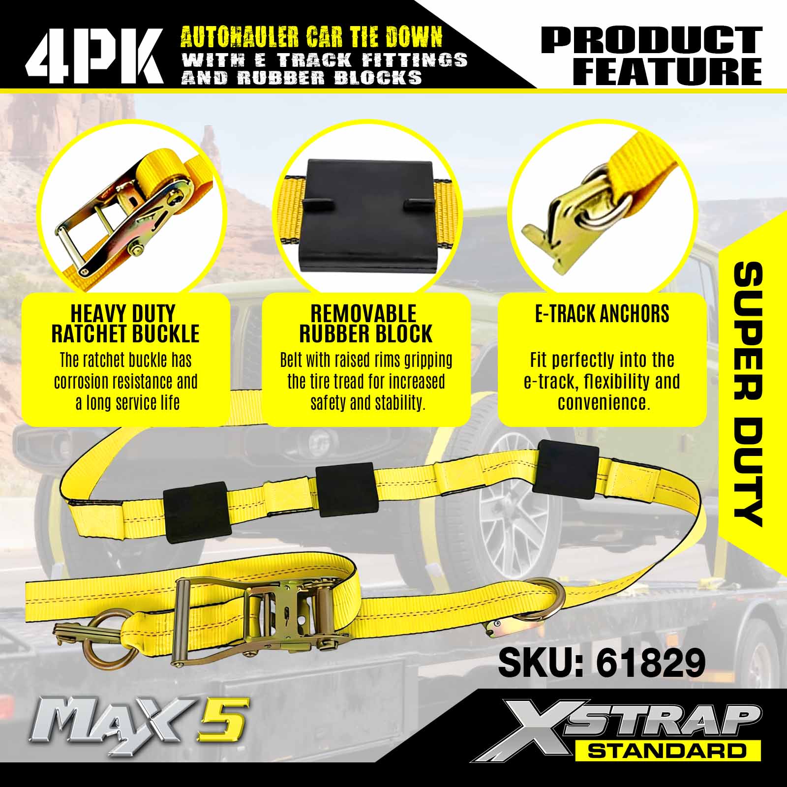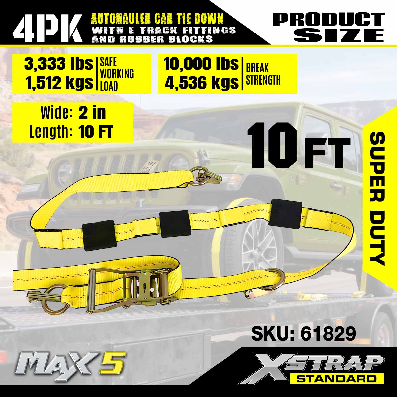 - Sikkerhed og alsidighed: Designet med en arbejdsbelastningsgrænse på 3.333 lbs og en brudstyrke på 10.000 lbs, disse køretøjsremme opfylder DOT- og CVSA-standarder, giver uovertruffen sikkerhed til dine biler, ATV'er, UTV'er og racerbiler på enhver trailer