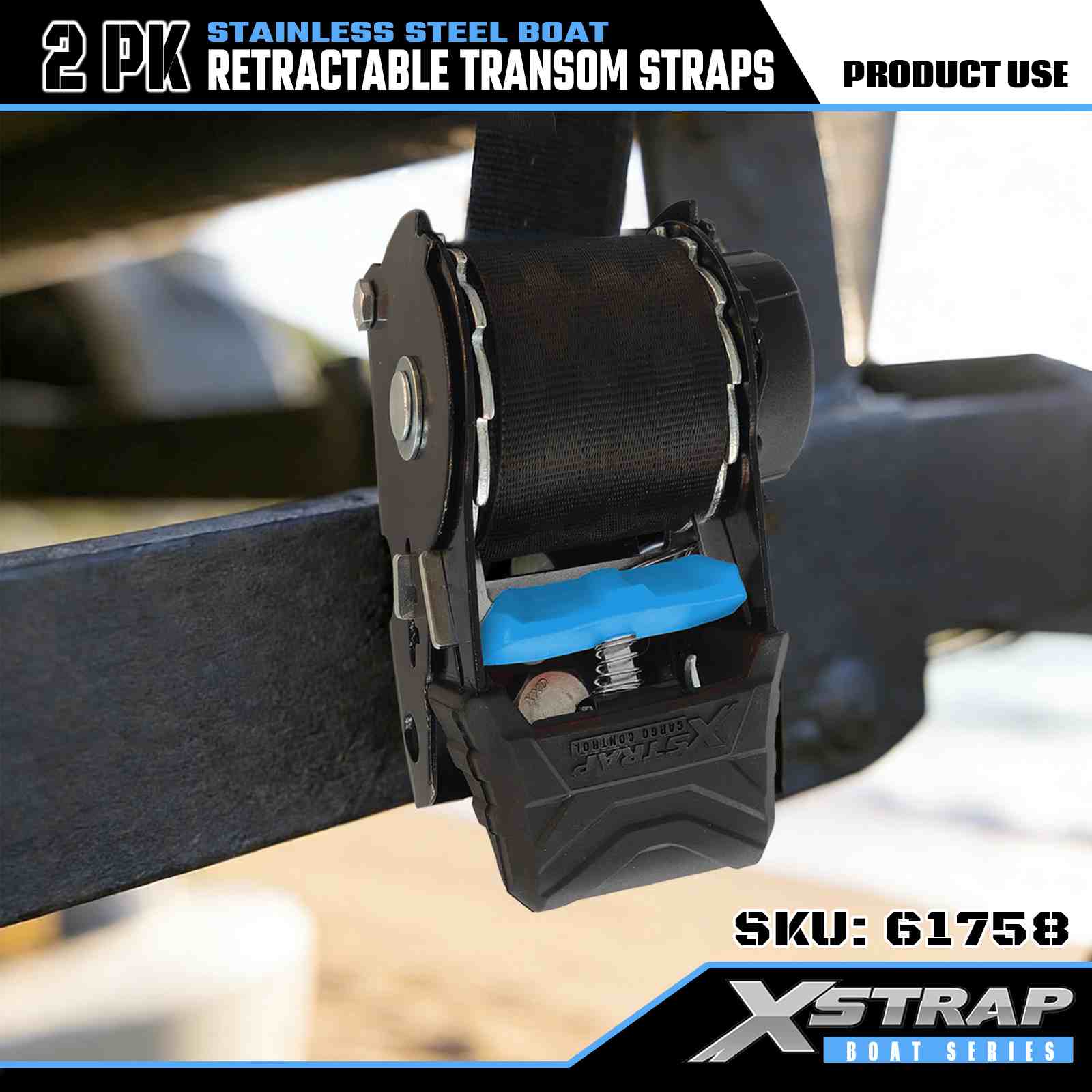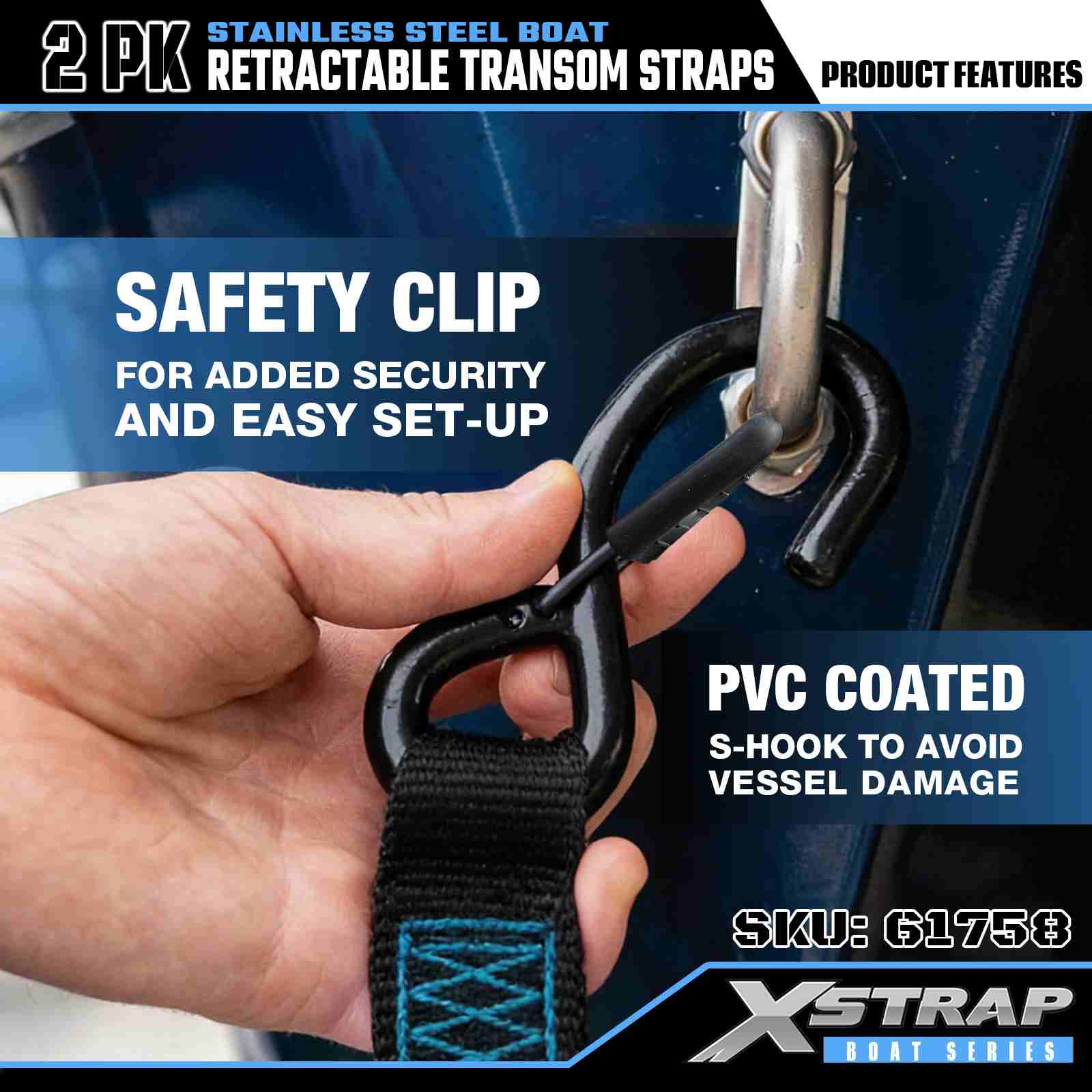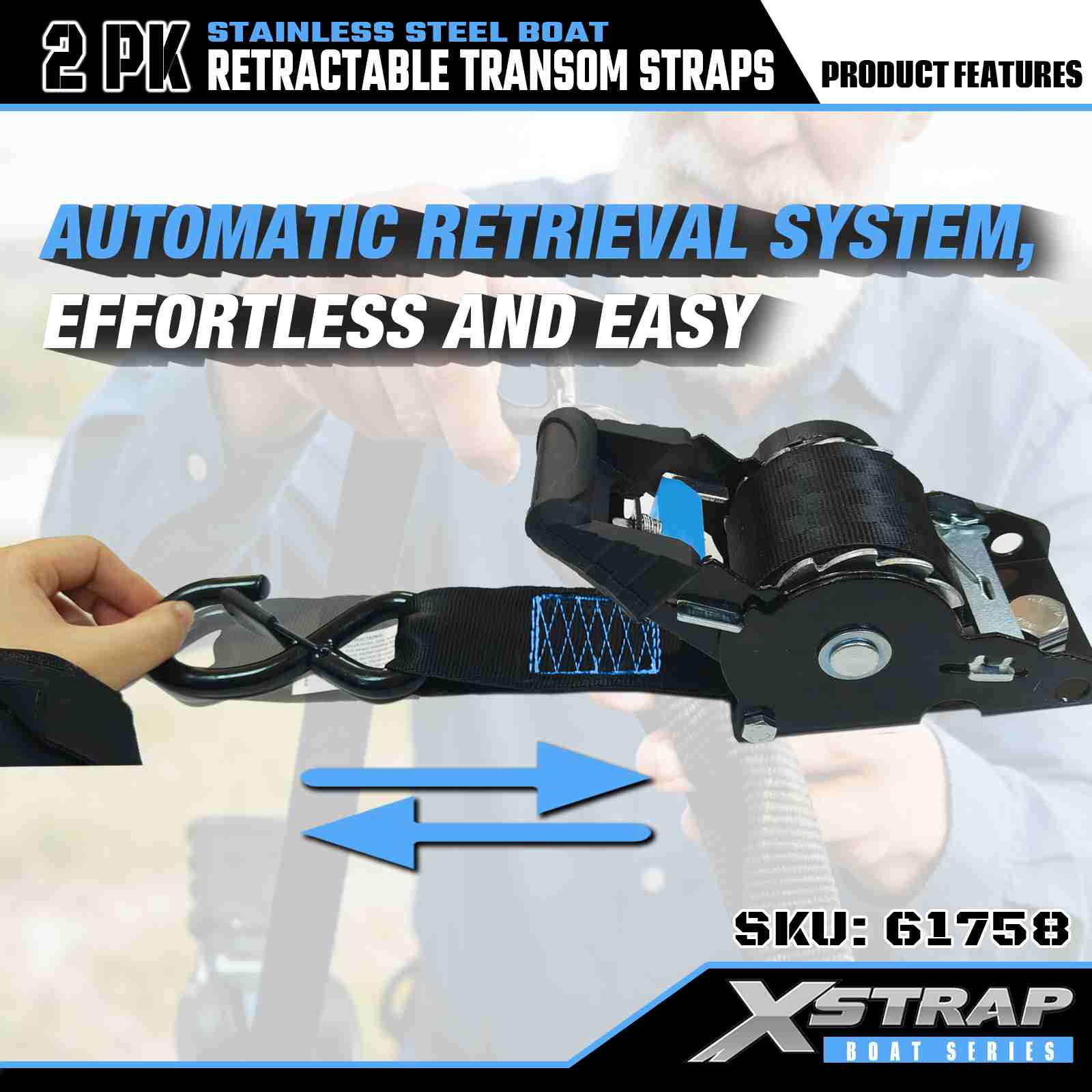 Xstrap 2PK Boat Retractable agterspejletsstrop med Safety S kroge, 2" x 3,6" Polyester Tie Down Strap Indtrækbar rem, 1000lbs Kapacitet Cargo Surring Sikringsstropper med Safety S krog til den seriøse professionelle til at sikre fragttrailer, fladvogn, skibåd, lille bil.