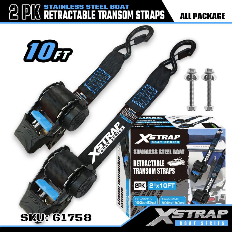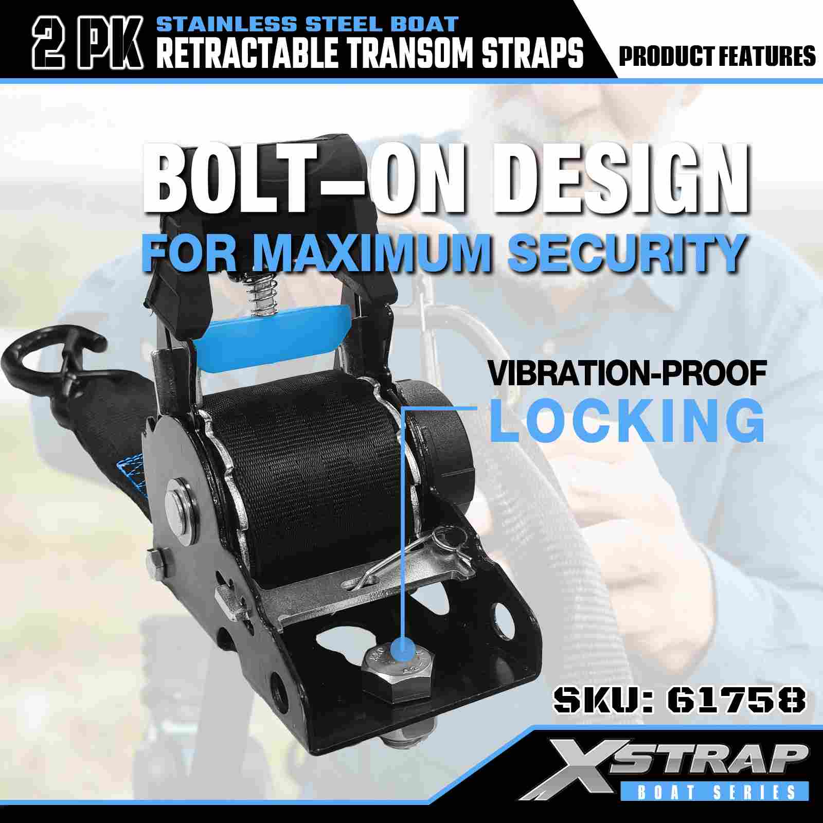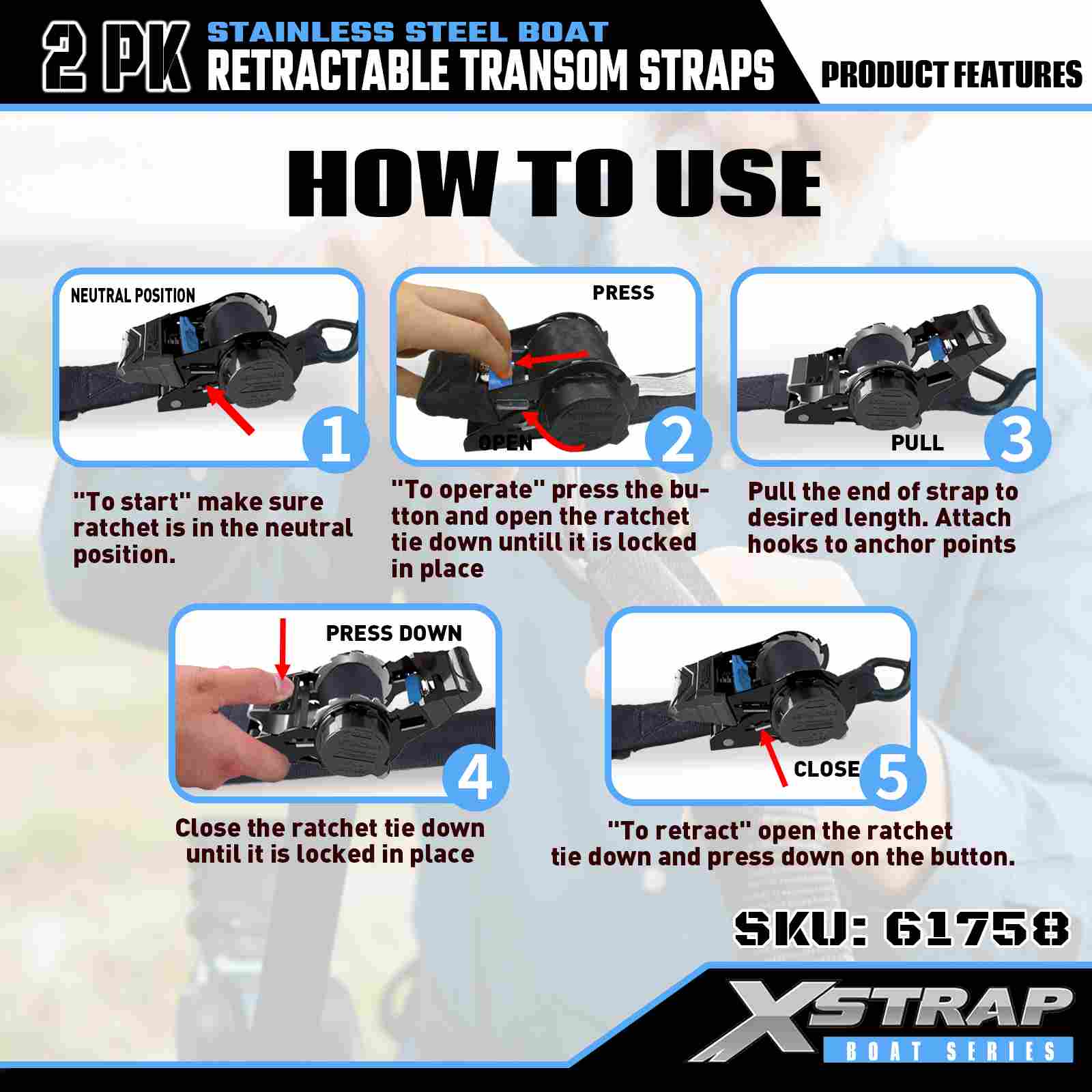 Xstrap 2PK Boat Retractable agterspejletsstrop med Safety S kroge, 2" x 3,6" Polyester Tie Down Strap Indtrækbar rem, 1000lbs Kapacitet Cargo Surring Sikringsstropper med Safety S krog til den seriøse professionelle til at sikre fragttrailer, fladvogn, skibåd, lille bil.
