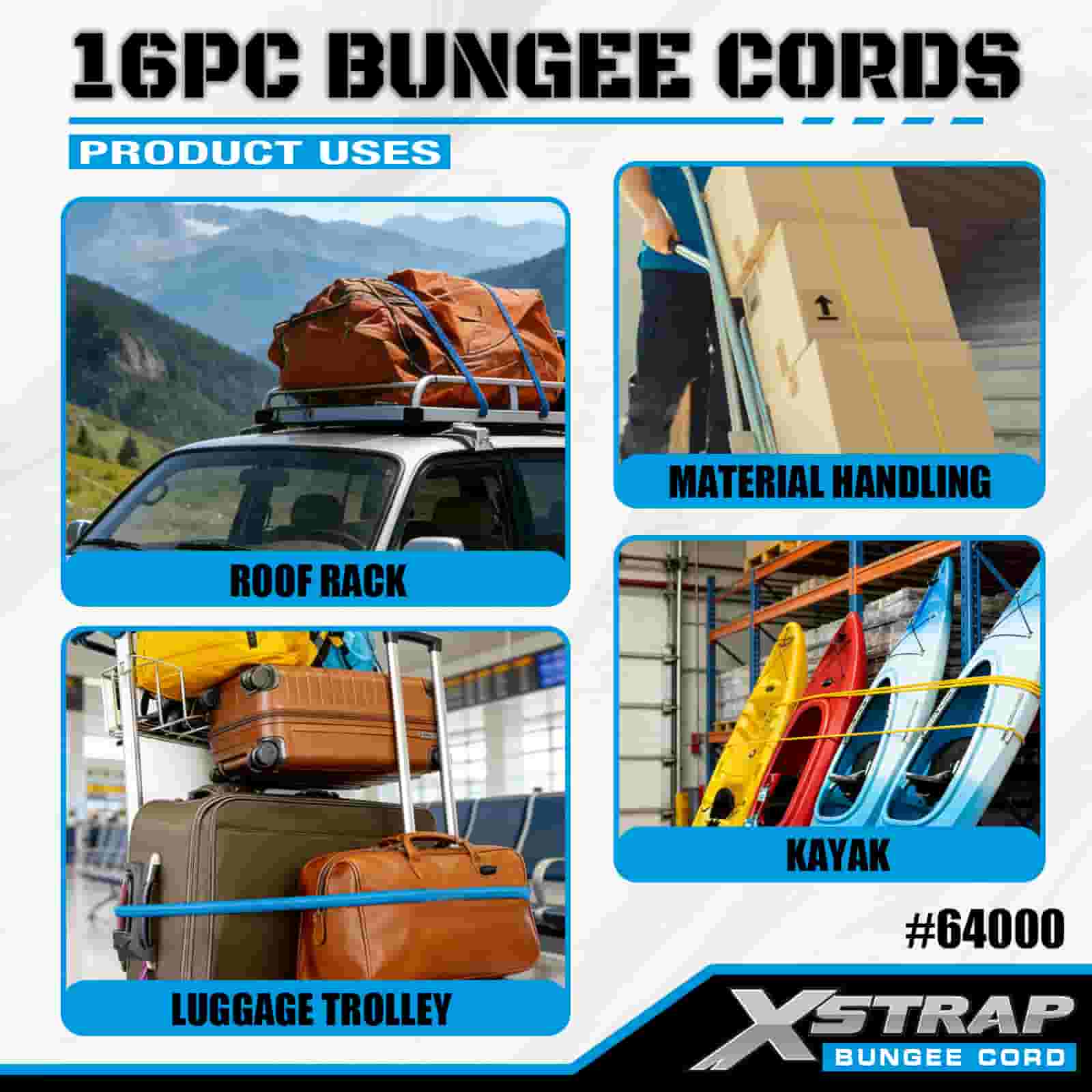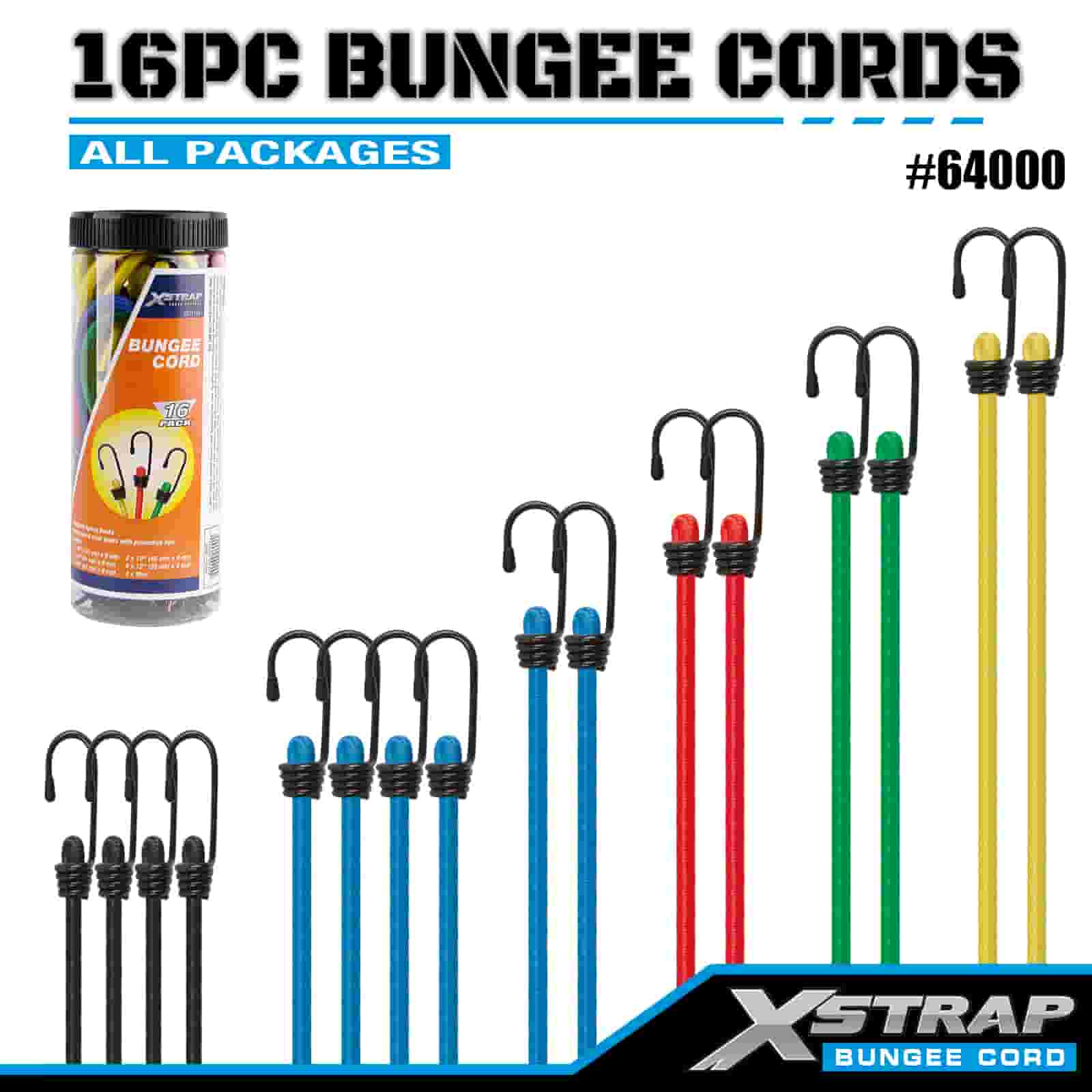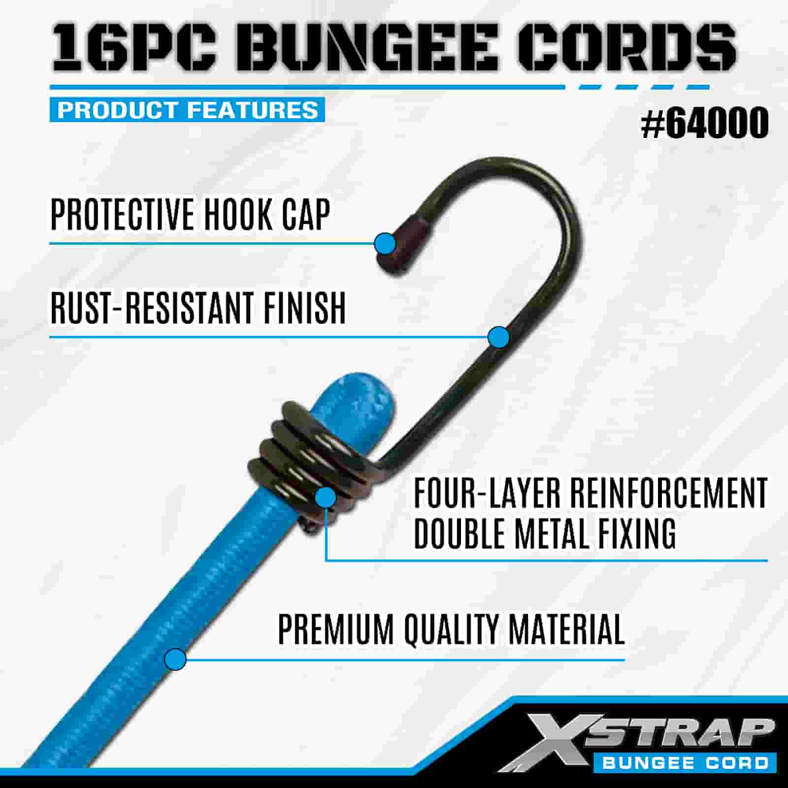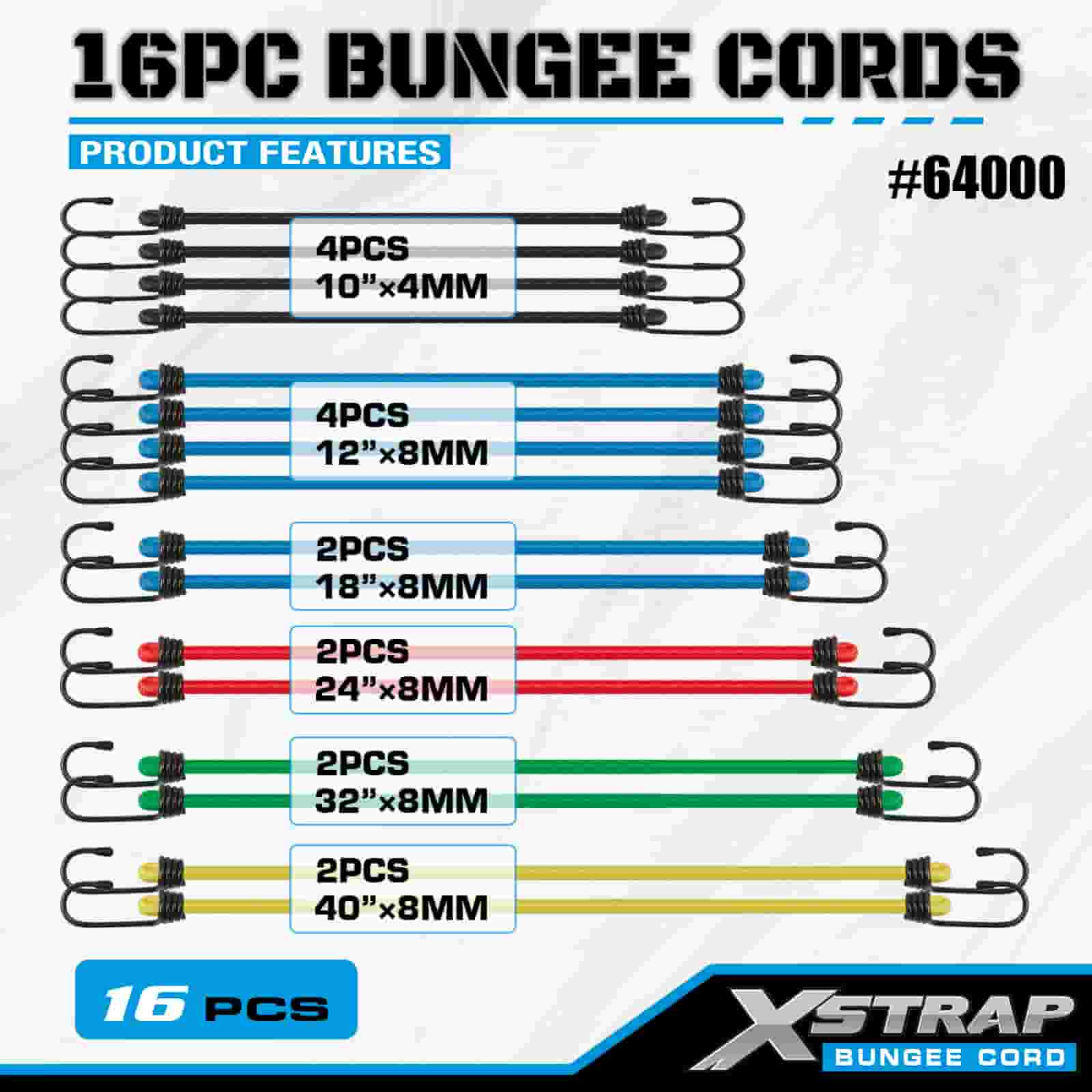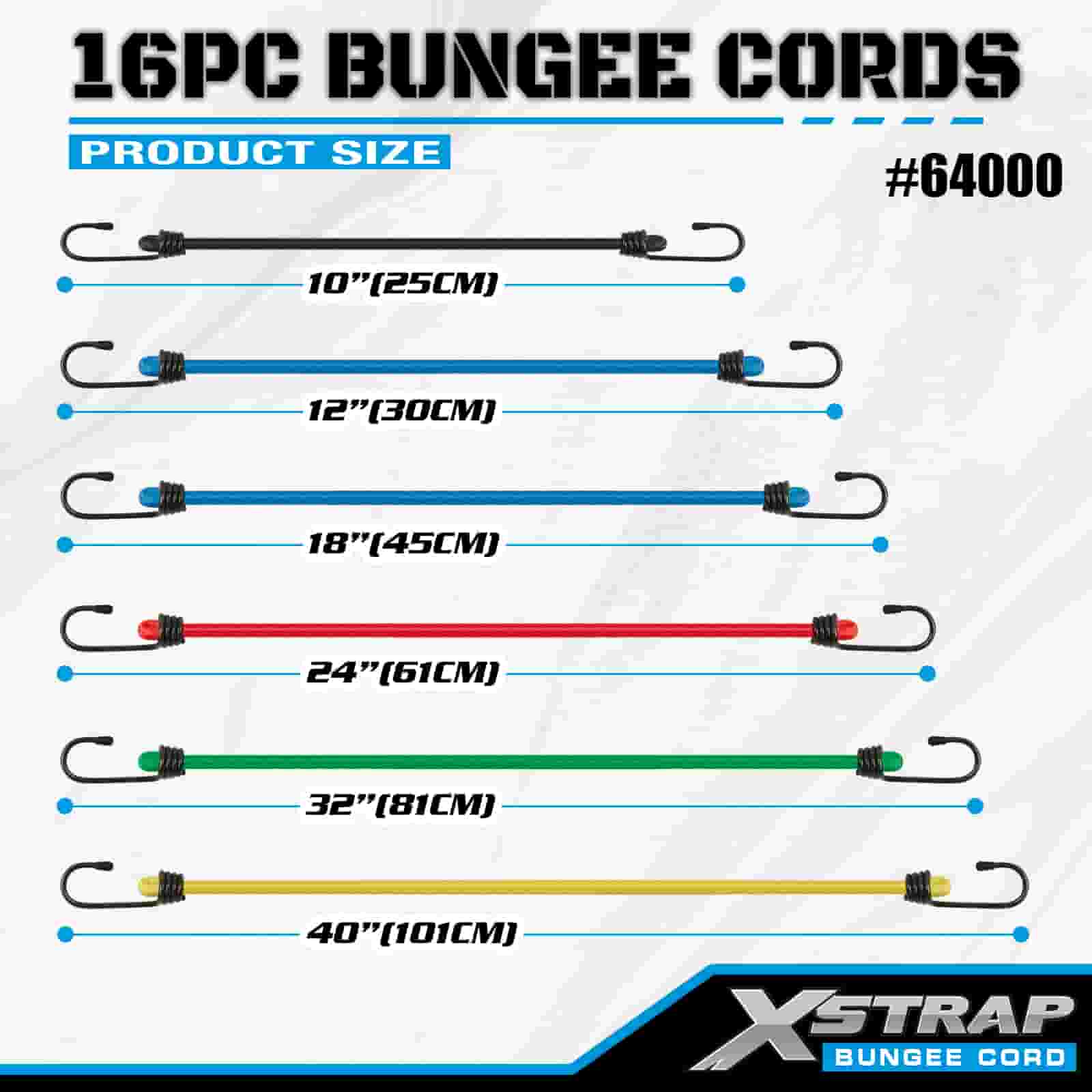 Xstrap 16PK 16PK Bungee Cords Sæt 8mm x 12"/18"/24"/32"/40"; 4mm x 10" MINI Bungee, 44-55 lbs brudstyrke med vinylbelagte stålkroge med beskyttende spidser og standdard fjederkroge.