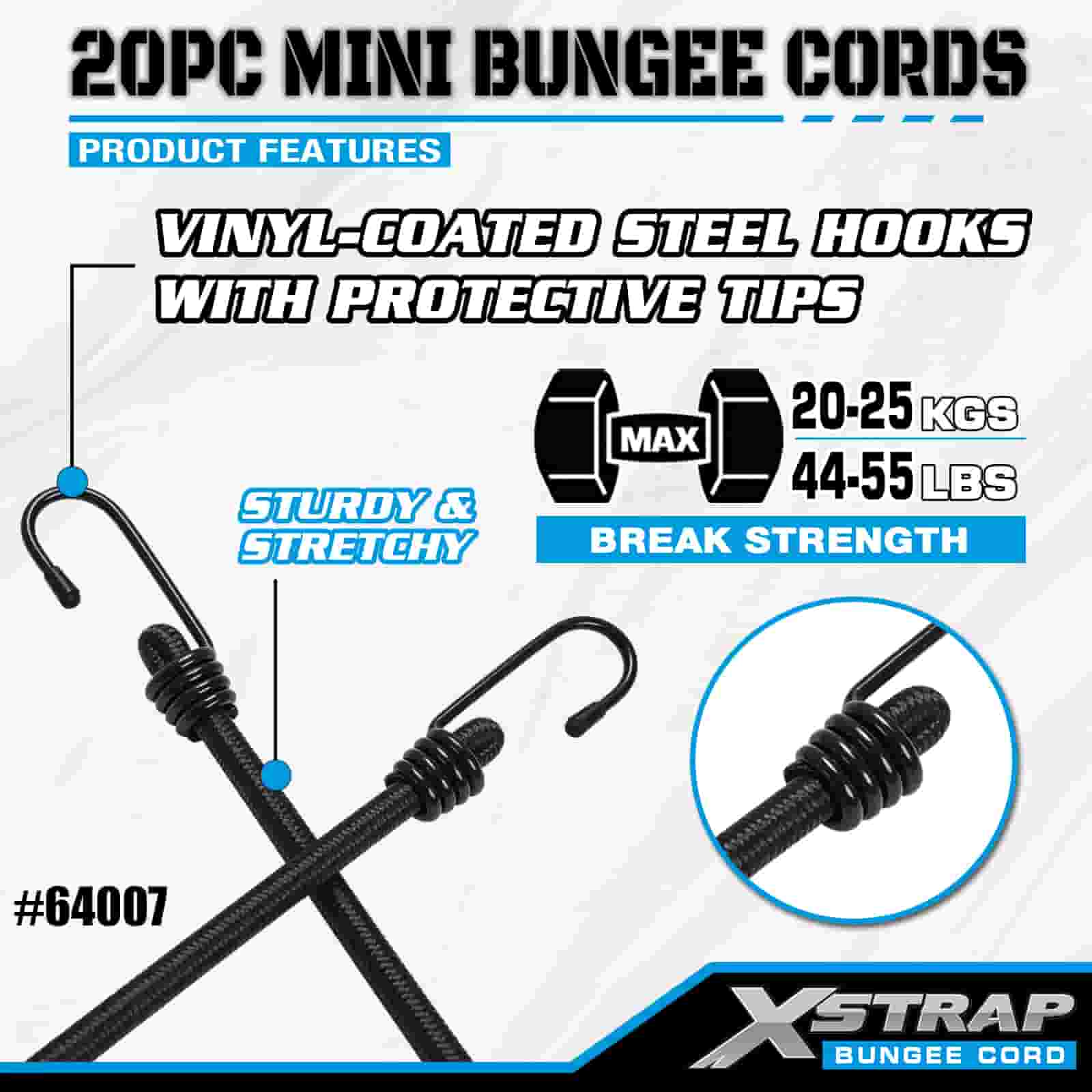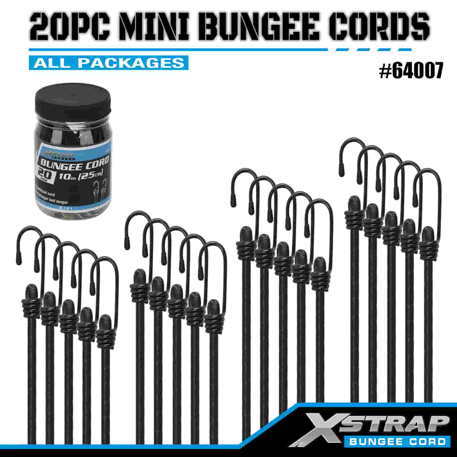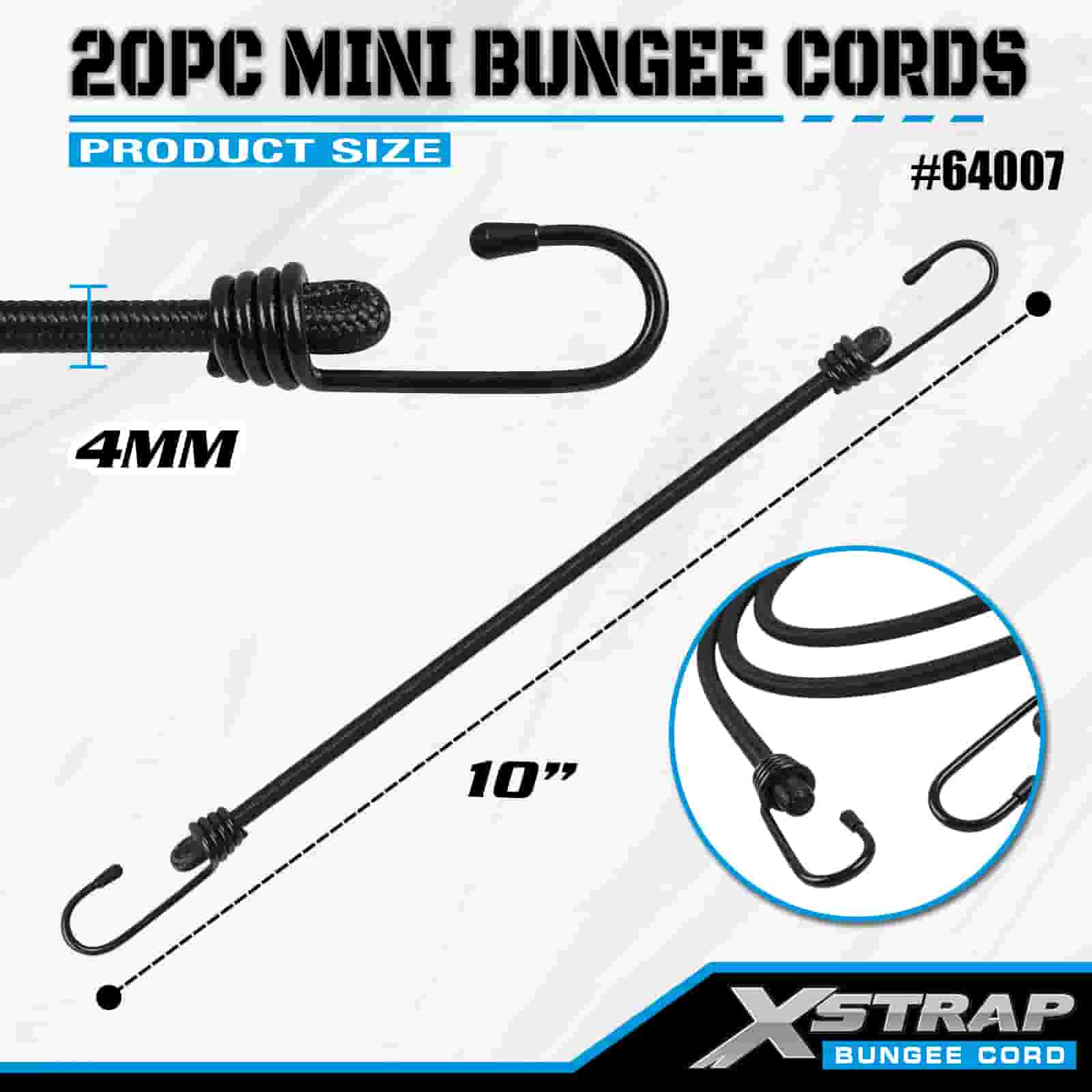 Xstrap 20PK MINI Bungee Cords 4 mm x 10", 44-55 lbs brudstyrke med stålkroge med beskyttende spidser og standard fjederkroge.