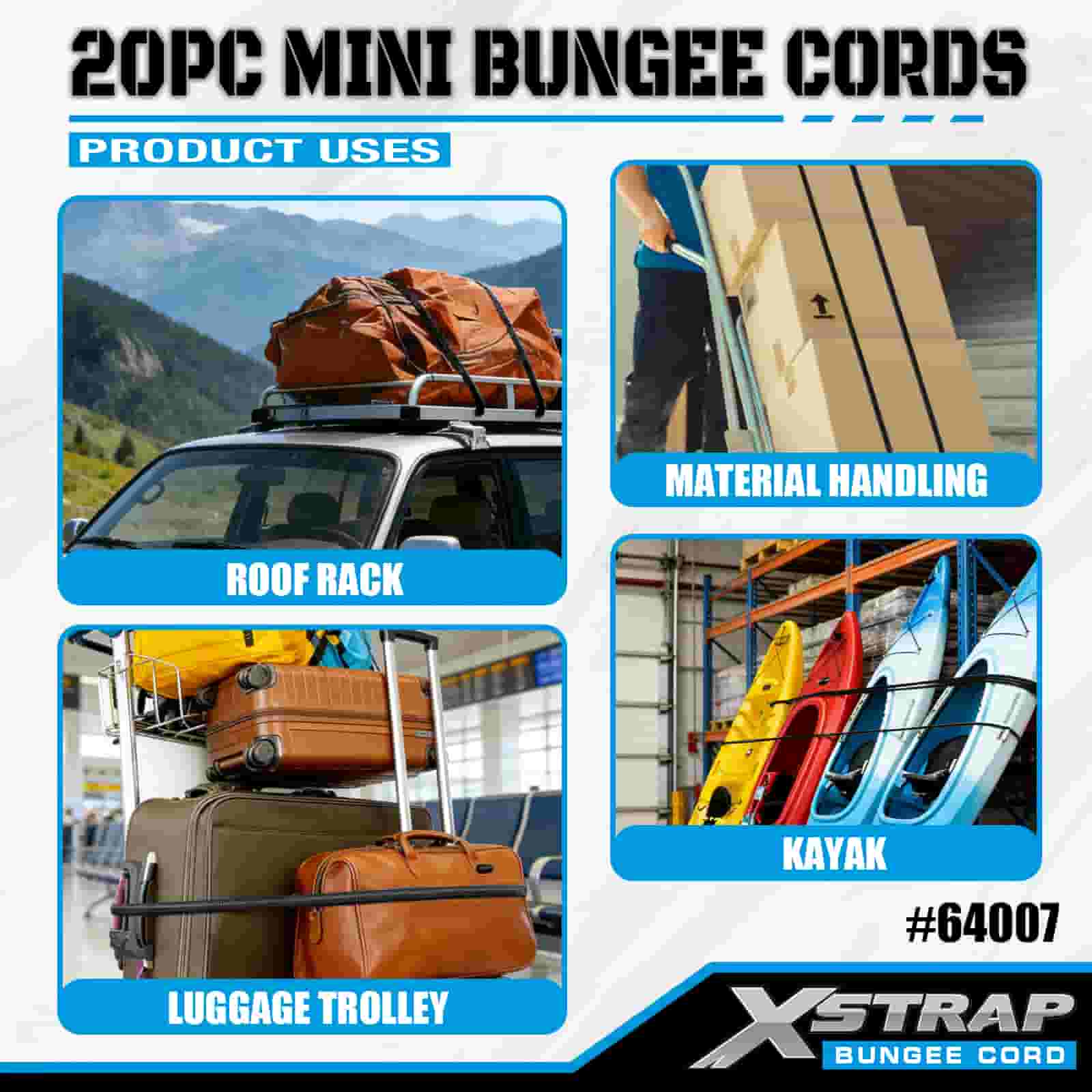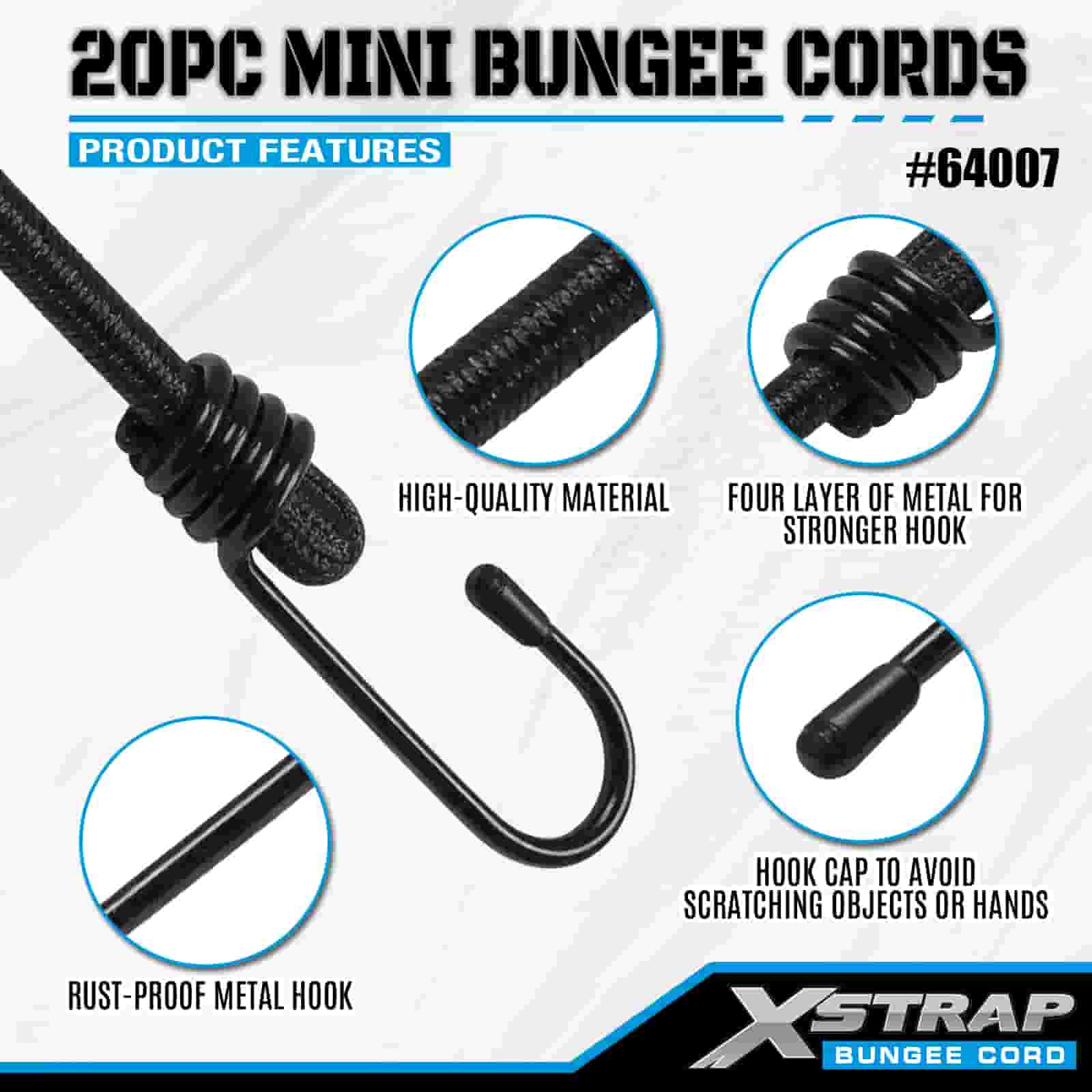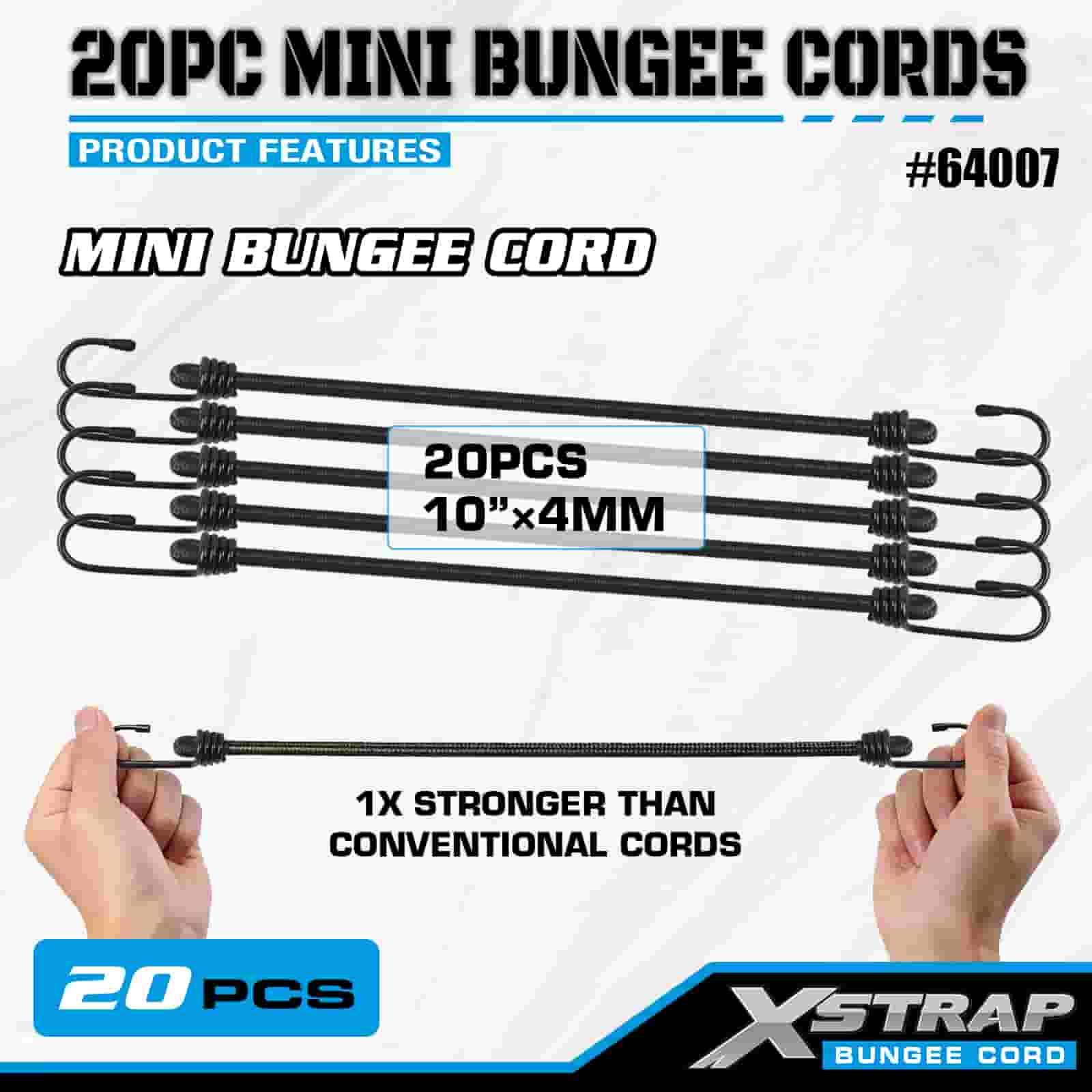 Xstrap 20PK MINI Bungee Cords 4 mm x 10", 44-55 lbs brudstyrke med stålkroge med beskyttende spidser og standard fjederkroge.