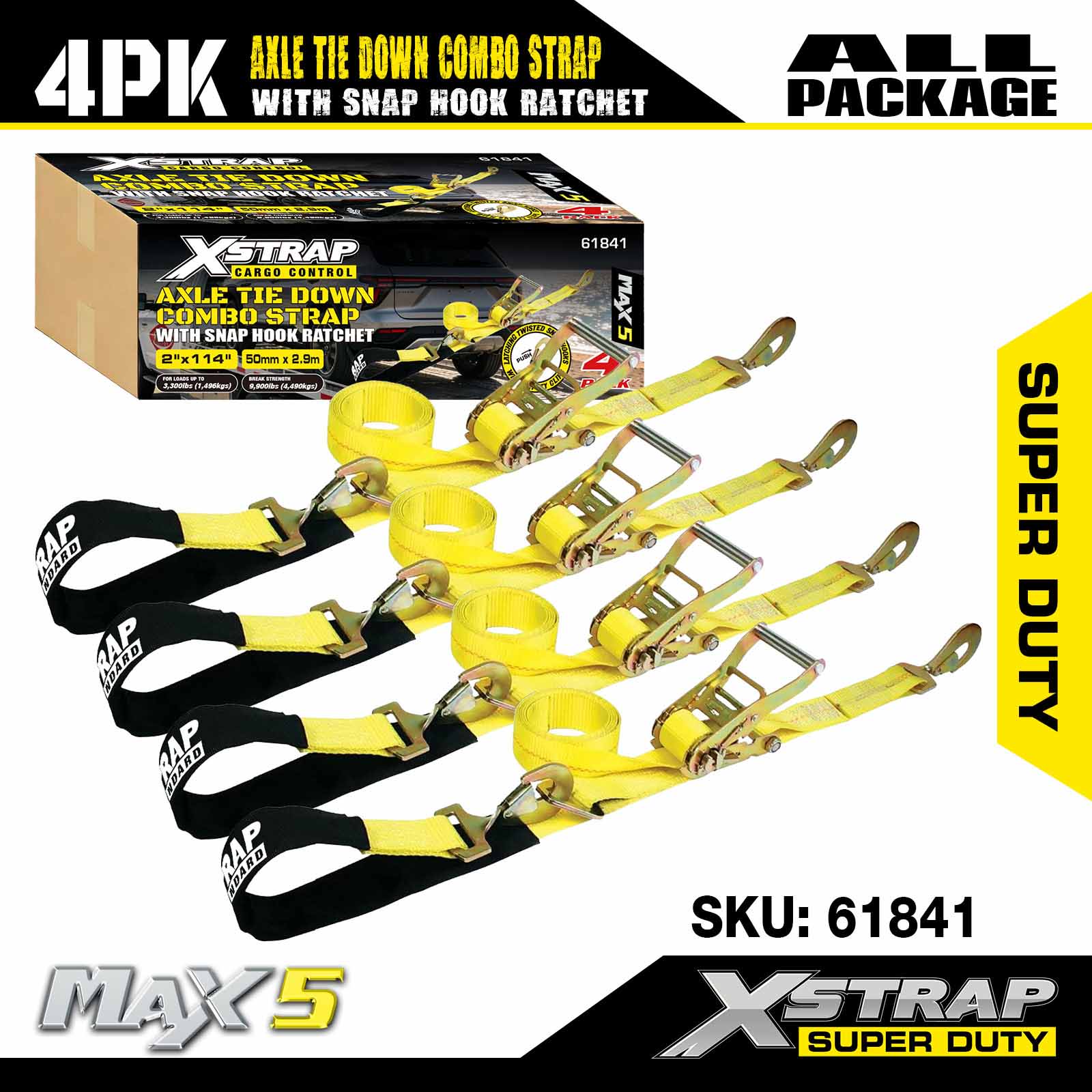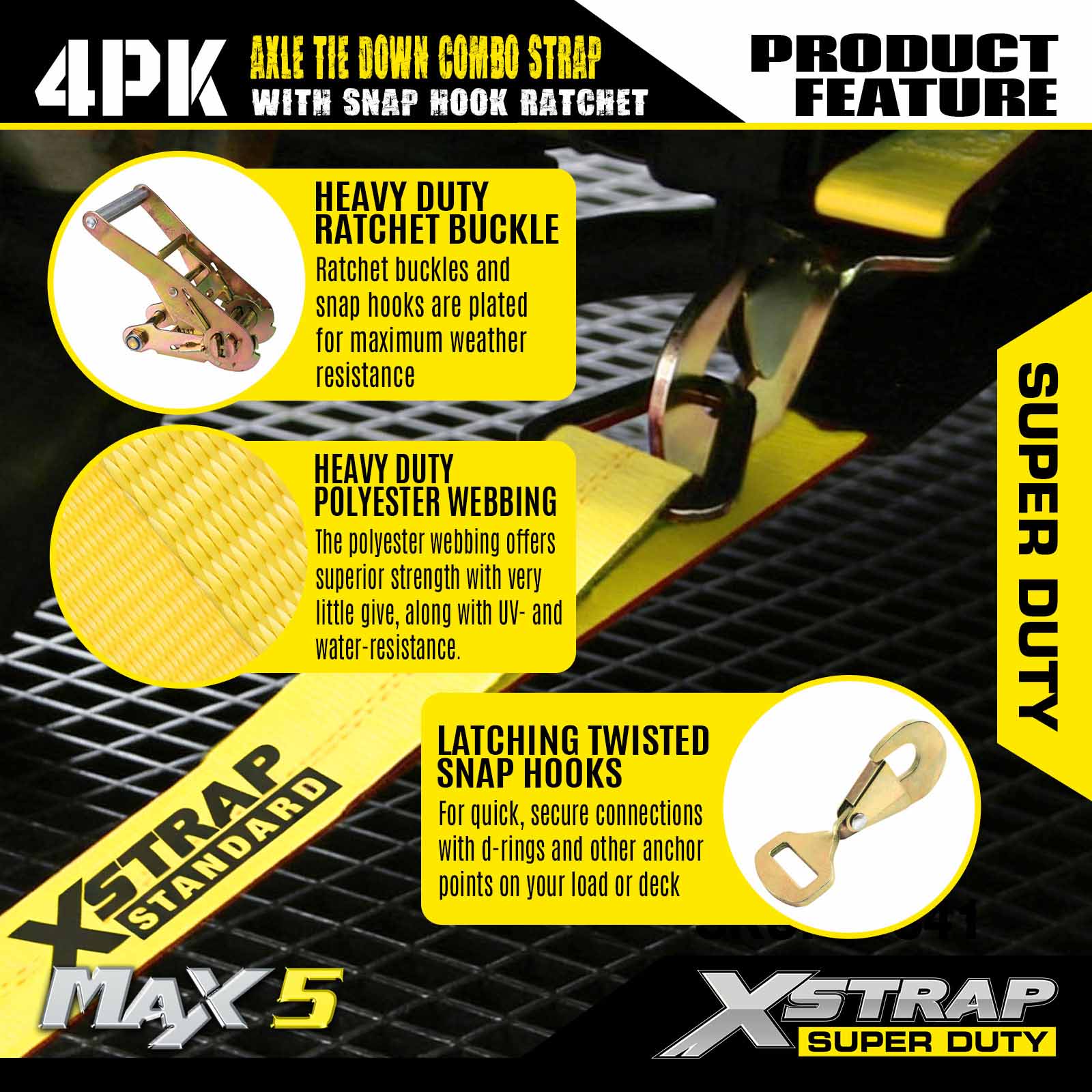Xstrap Heavy Duty Ratchet Tie Down stropper - 4-pack biltransportsæt med snapkroge - 10.000 lbs Break Strength - Professionel kvalitet køretøj Tie Downs