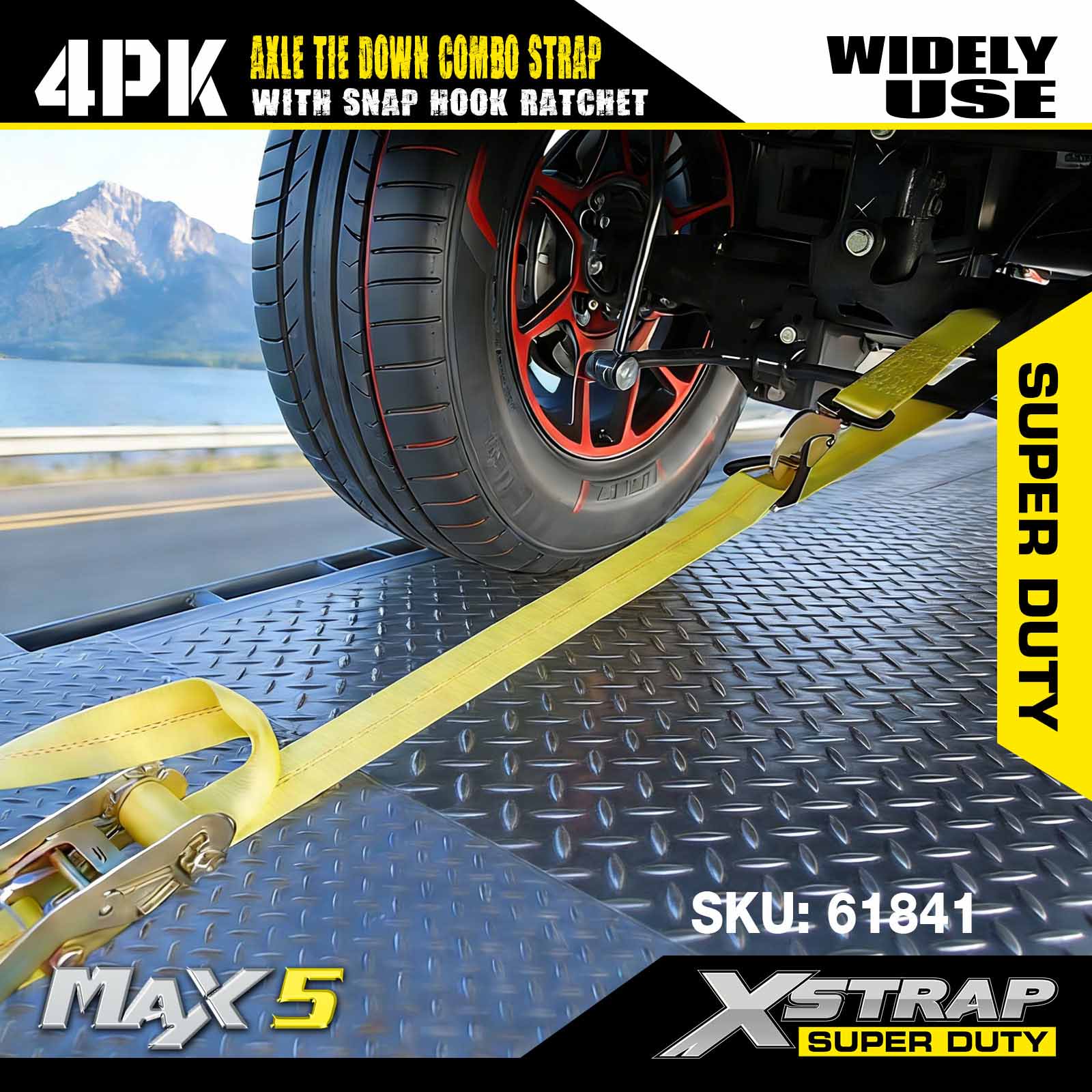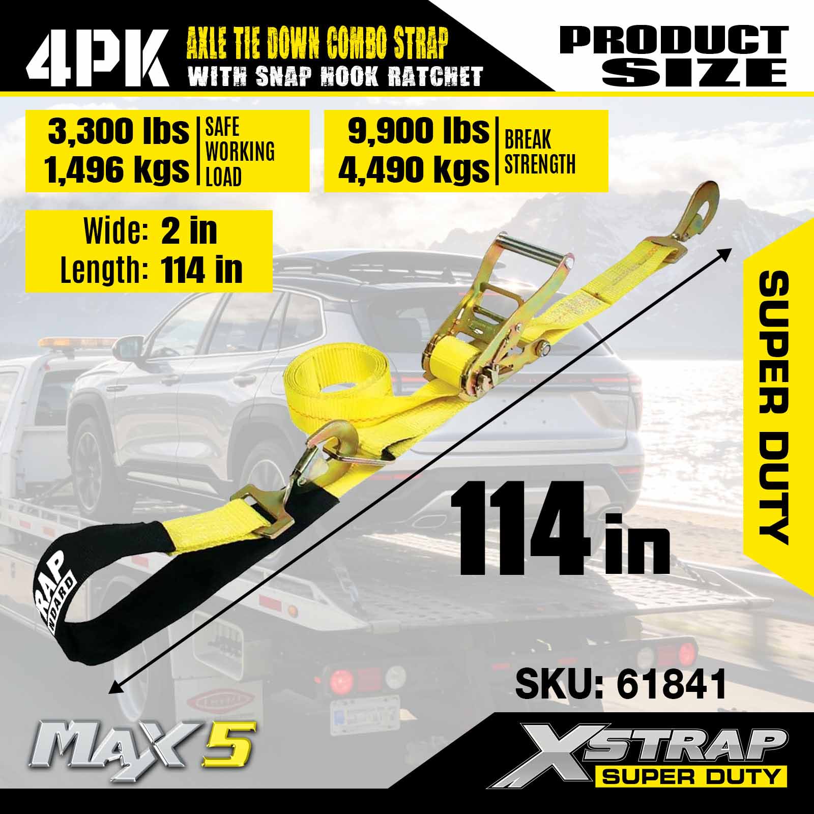- 4 pakke 114" akselremme: Alsidige automatiske lasso-bindinger bruges til at gå gennem fælgene på det transporterede køretøj, og kan også fastgøres til enhver solid del af hjulet, akslen eller rammen.