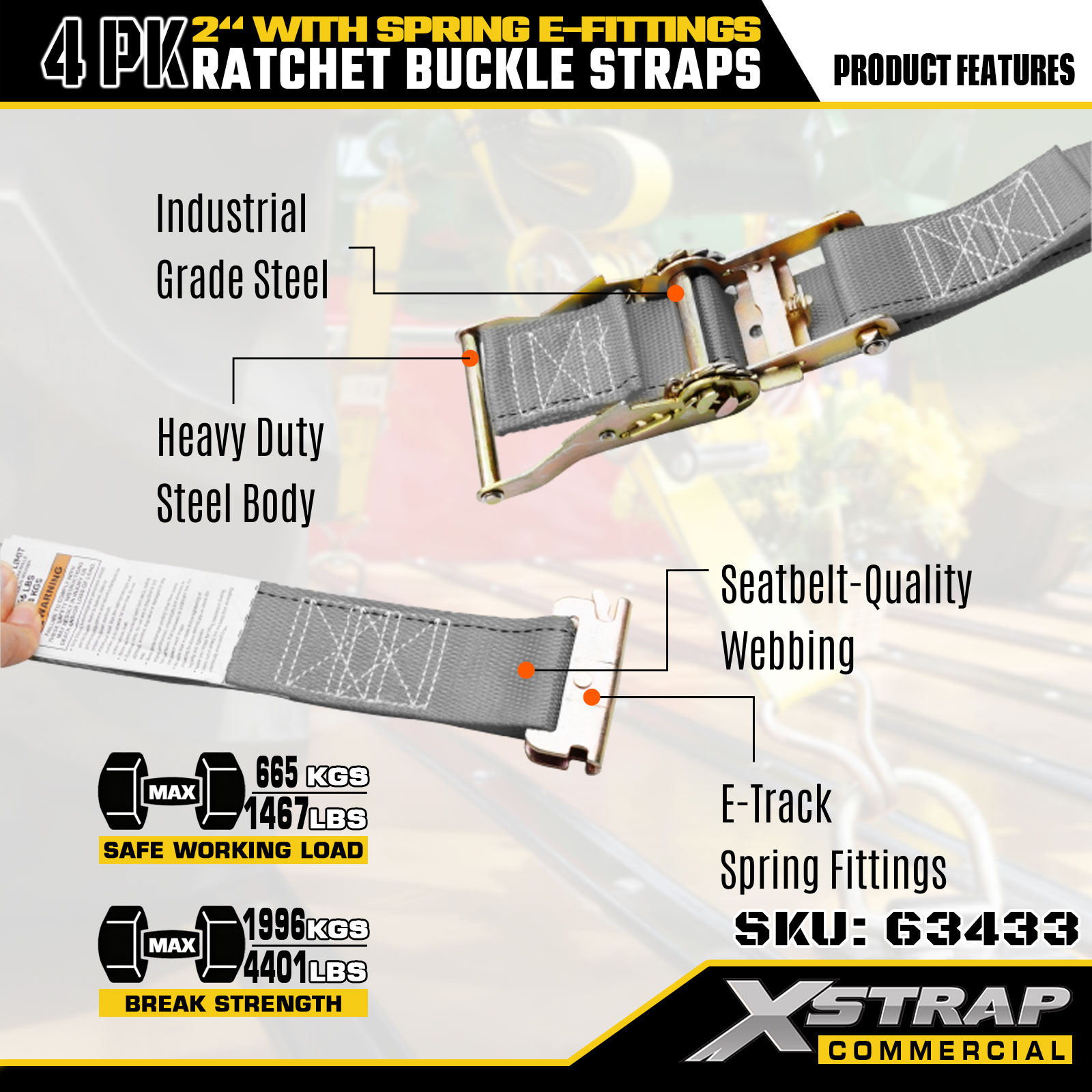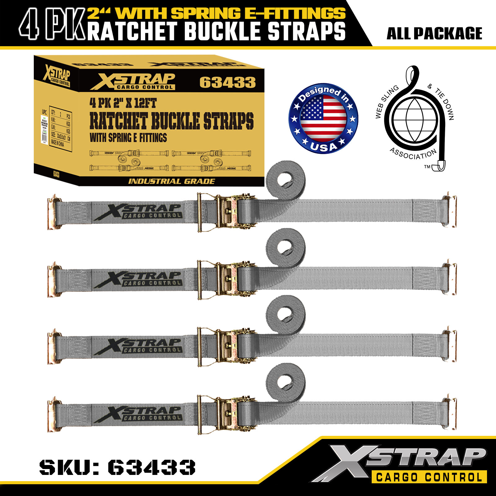 Xstrap 4-pack skralde-bindingsstropper, 2" x 16" polyester lastsikringsstropper, 1467 lbs sikker arbejdsbelastning og 4401 lbs brudstyrke, med metal E-kroge til lastbil, plæneklipper, ATV'er2. Produktspecifikation: