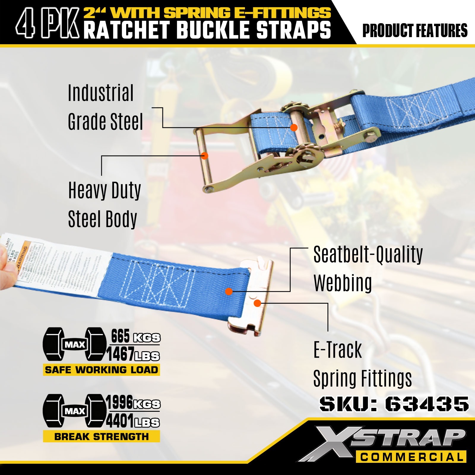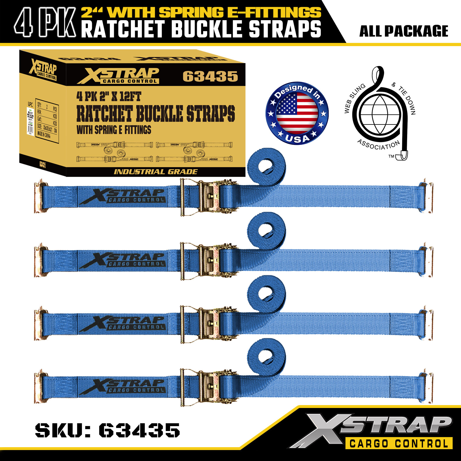 Xstrap 4-pack skraldebindingsstropper, 2" x 12" polyester lastsikringsstropper med fjeder-e-fittings, 1467 lbs sikker arbejdsbelastning (SWL) & 4401 lbs brudstyrke, til lastbiler, plæneklippere, ATV'er