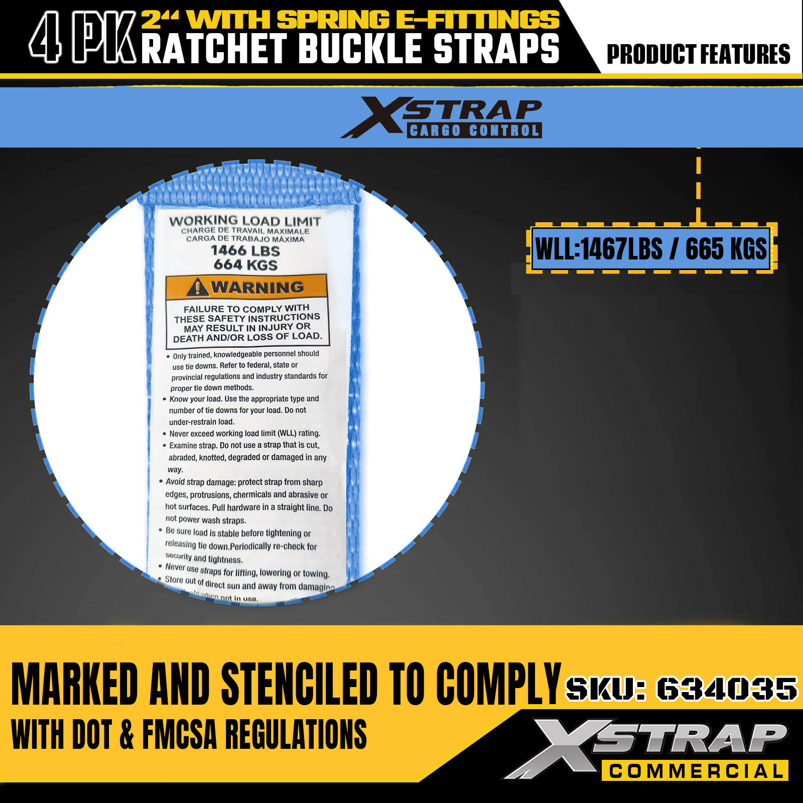 - Tydelige SWL- og brudstyrkemærker til overbelastningsforebyggelse: Hver rem er tydeligt mærket med en 1467LBS sikker arbejdsbelastning (SWL) og 4401LBS maksimal brudstyrke, hvilket giver vigtige sikkerhedsoplysninger for at forhindre overbelastning.