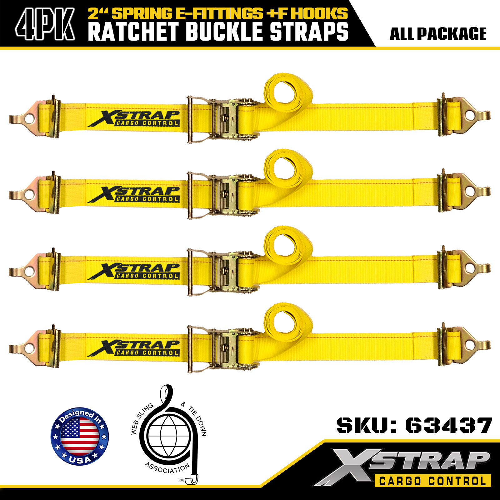 Xstrap 4-pack kraftige skraldebindingsstropper, 2" x 12" Højstyrkepolyester med fjeder E-fittings og F-kroge, 733 lbs Heavy Duty Cargo Tie Downs til trailere Lastbiler Varevogne og motorcykler