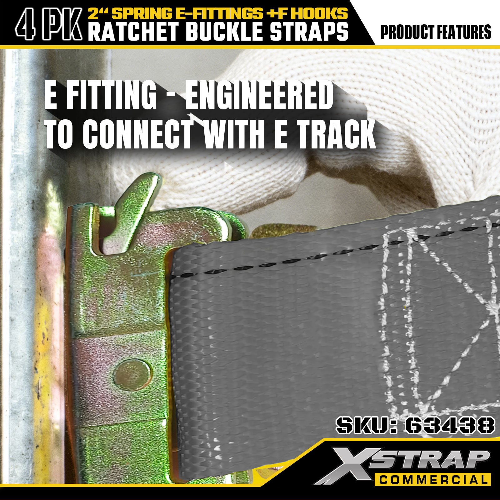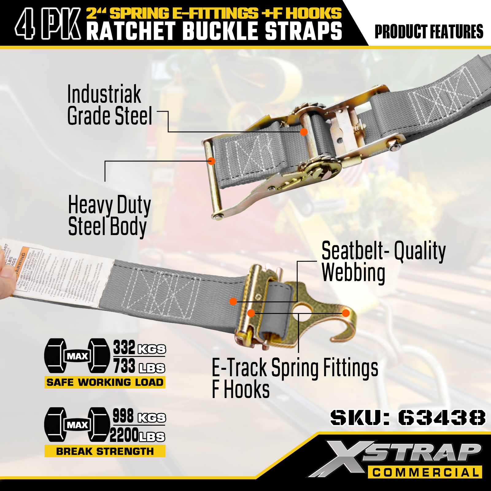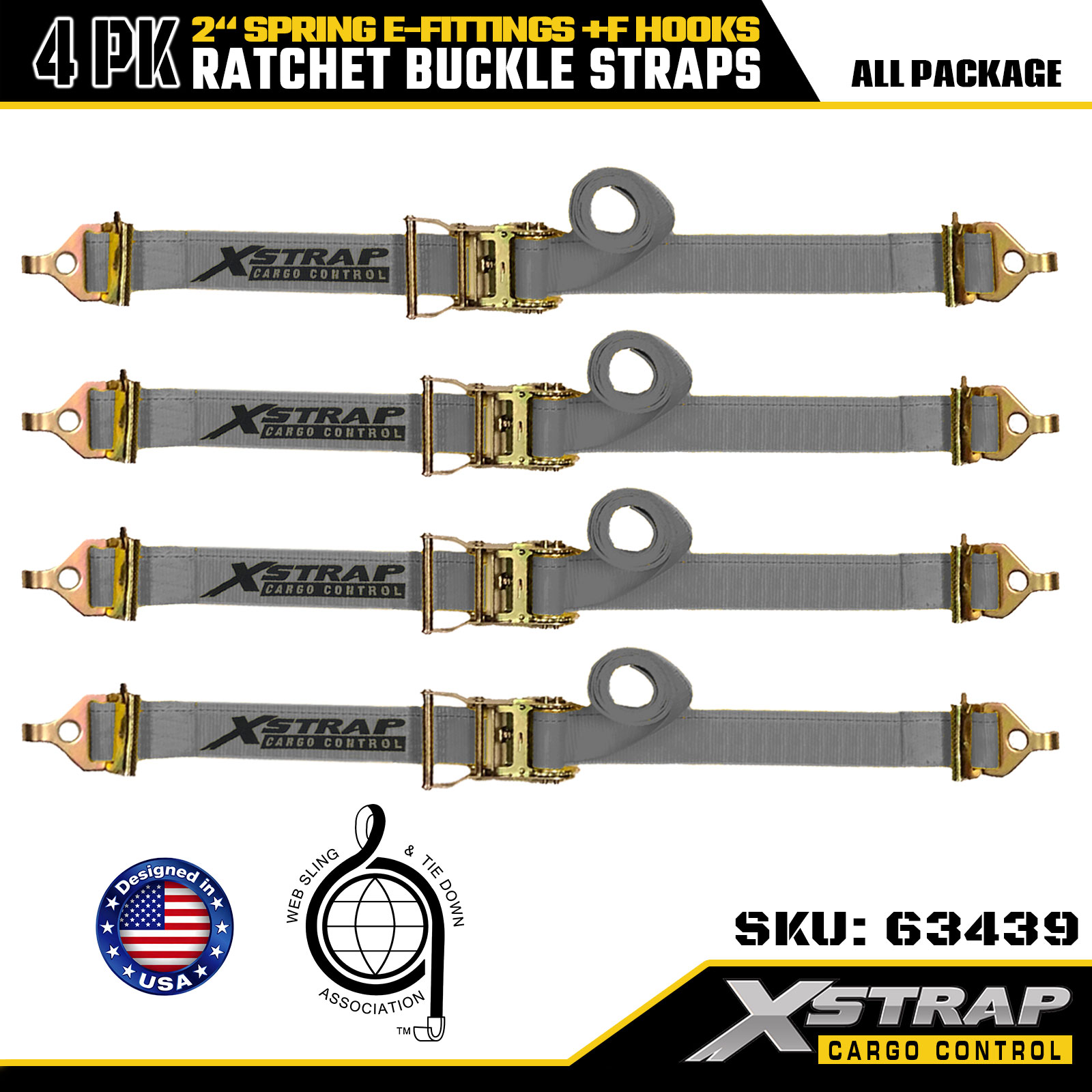 Xstrap 4 Pack 2" x 16" Skraldebindingsstropper - Grå polyester med fjeder-e-fittings & F-kroge, 733 lbs SWL til flytning, lastbil og almindelig godstransport