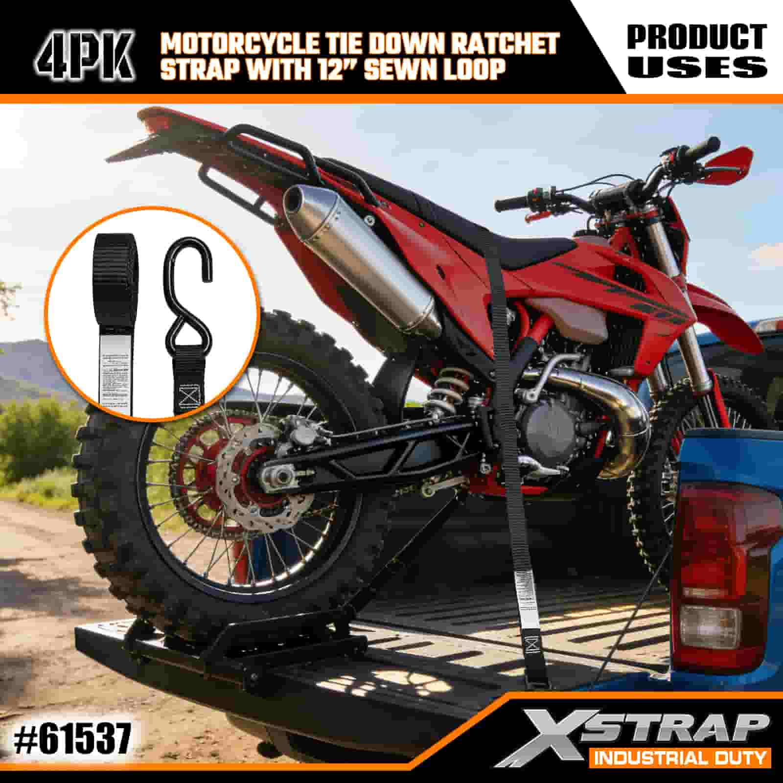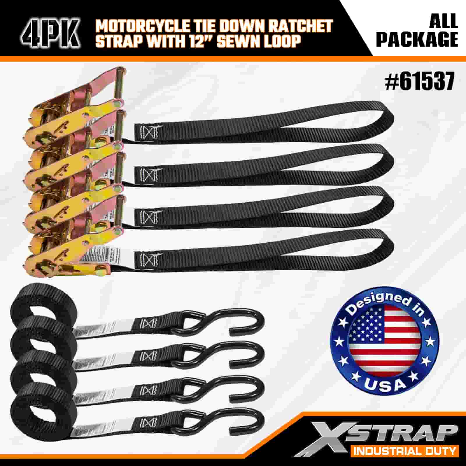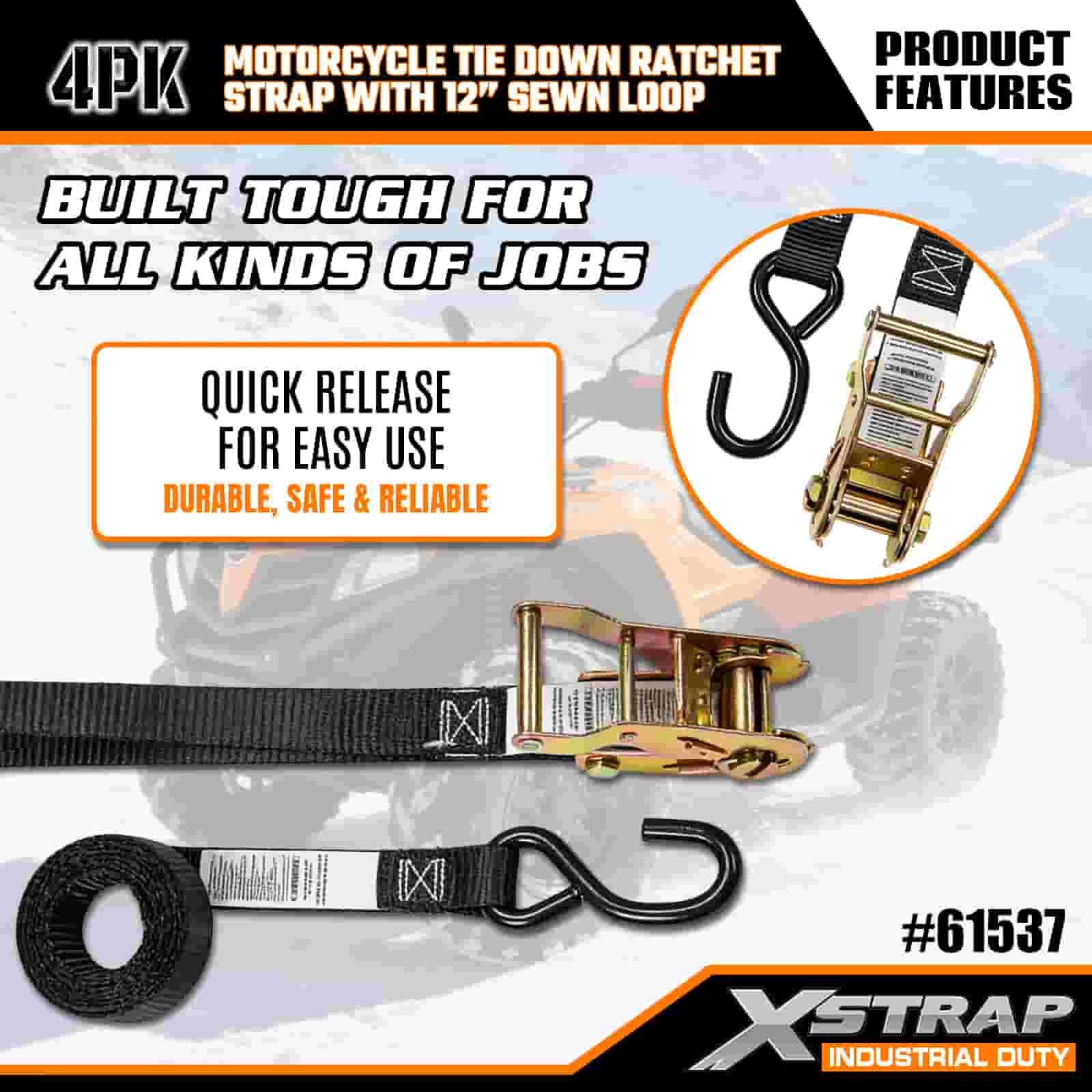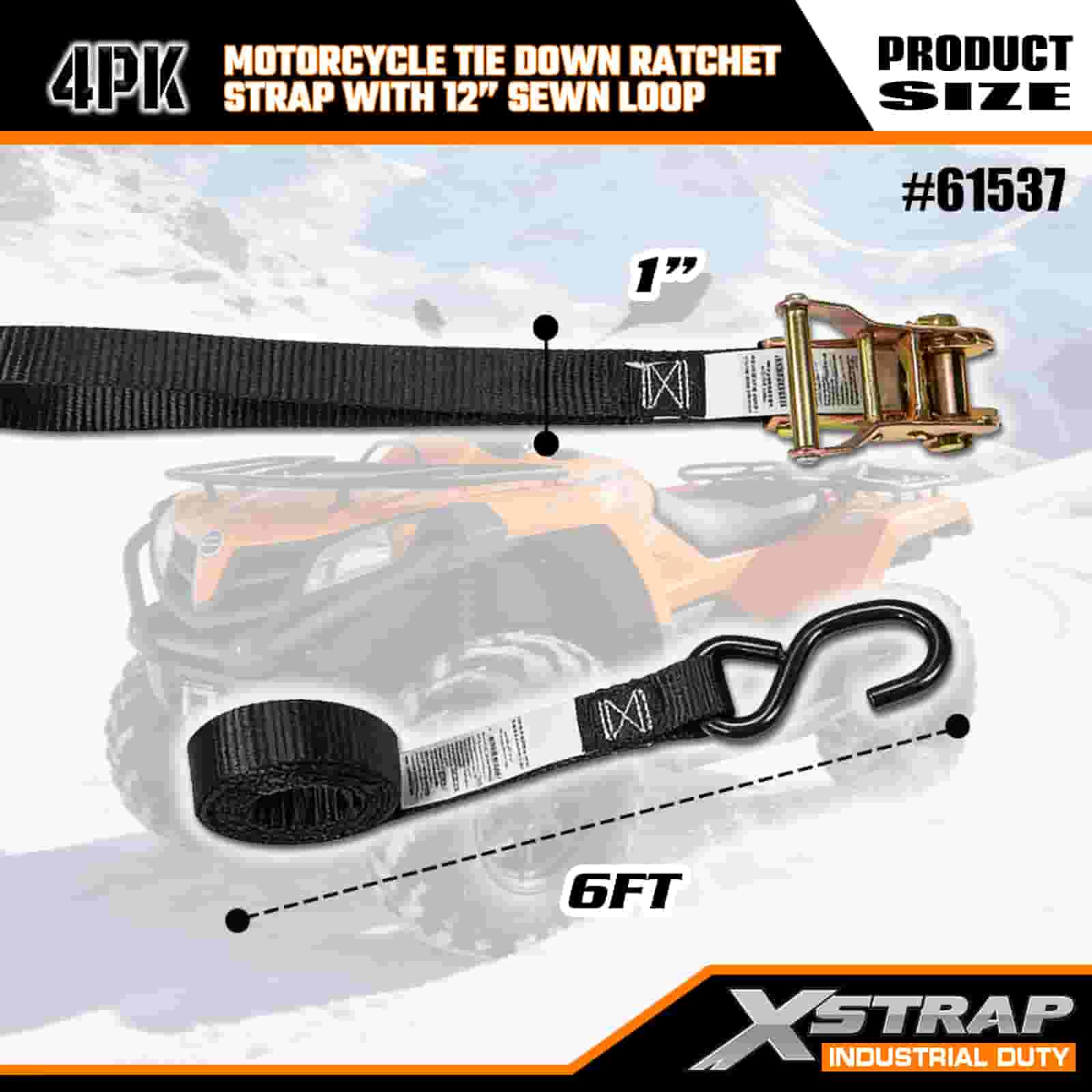 - 4-pak 6FT-stropper til motorcykelbinding: Sælges som et sæt med 4 stropper (1 tomme bred × 6 fod lang), ideel til at fastgøre motorcykler, ATV'er og småt udstyr i lastbilleje eller under transport.