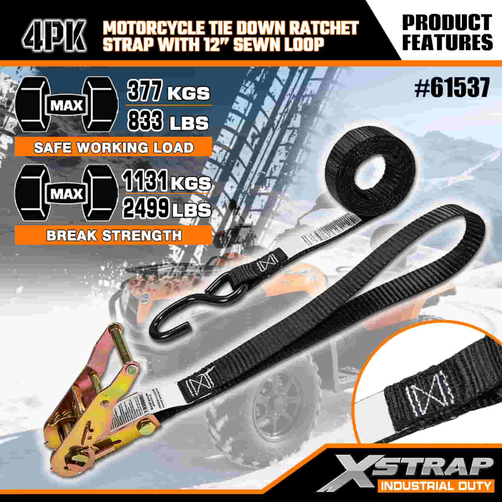 Xstrap 4PK-motorcykelbindingsstrop med 12" syet løkke, 1" x 6' polyesterbindingsstrop Pull Ratchet strop, 833lbs Kapacitet Cargo Surring Sikringsstropper med S-krog til den seriøse professionelle til at sikre fragttrailer, fladvognsanhænger, skibåd.