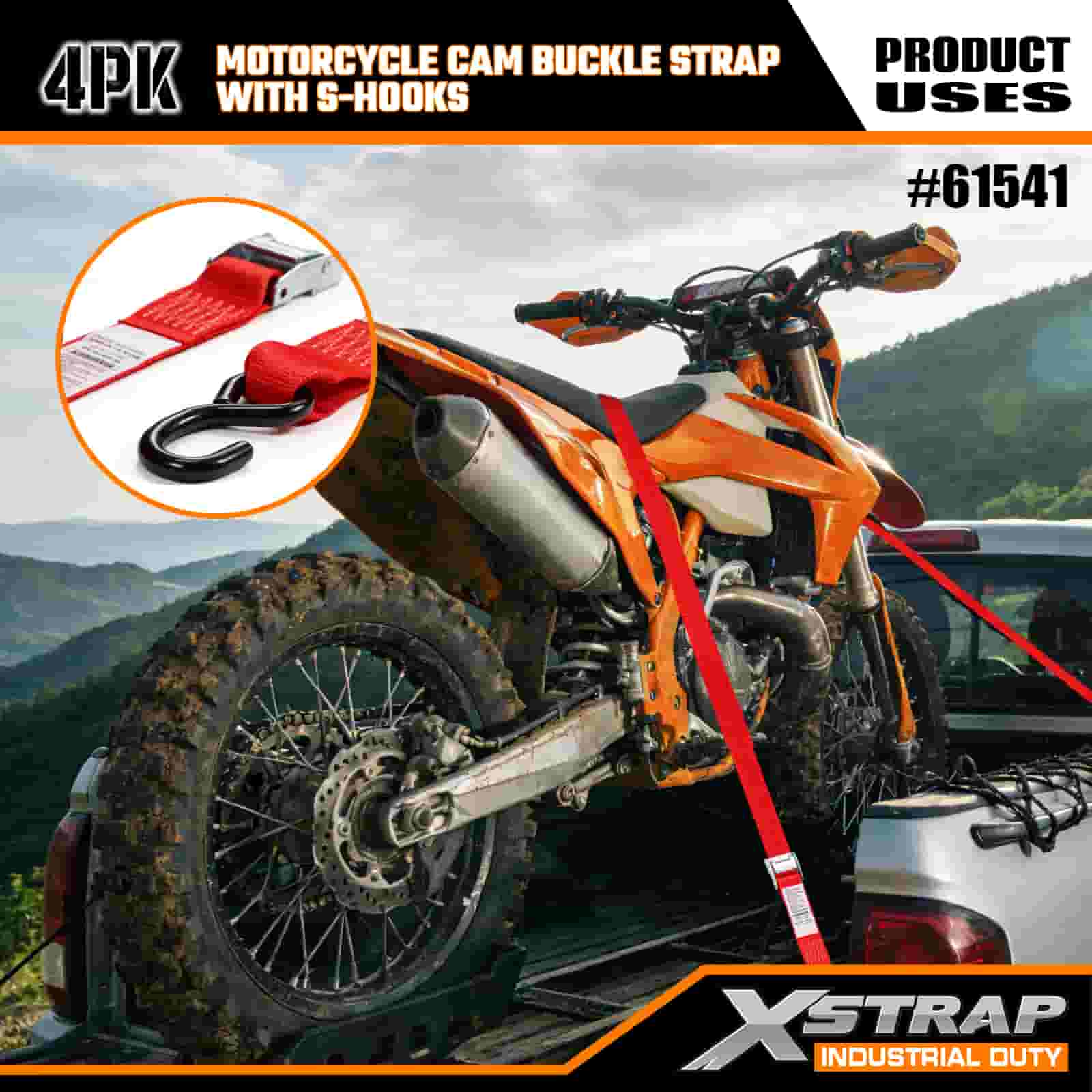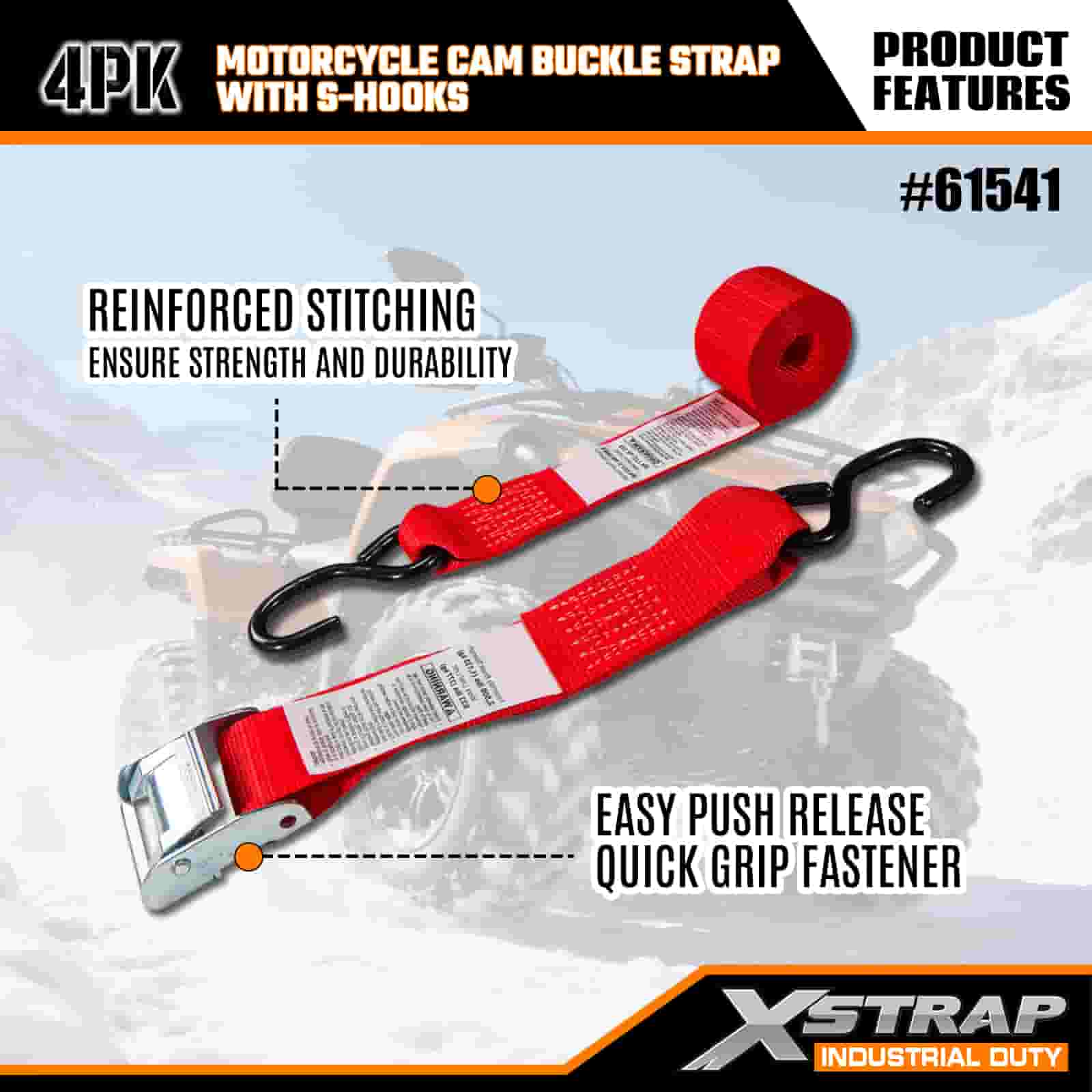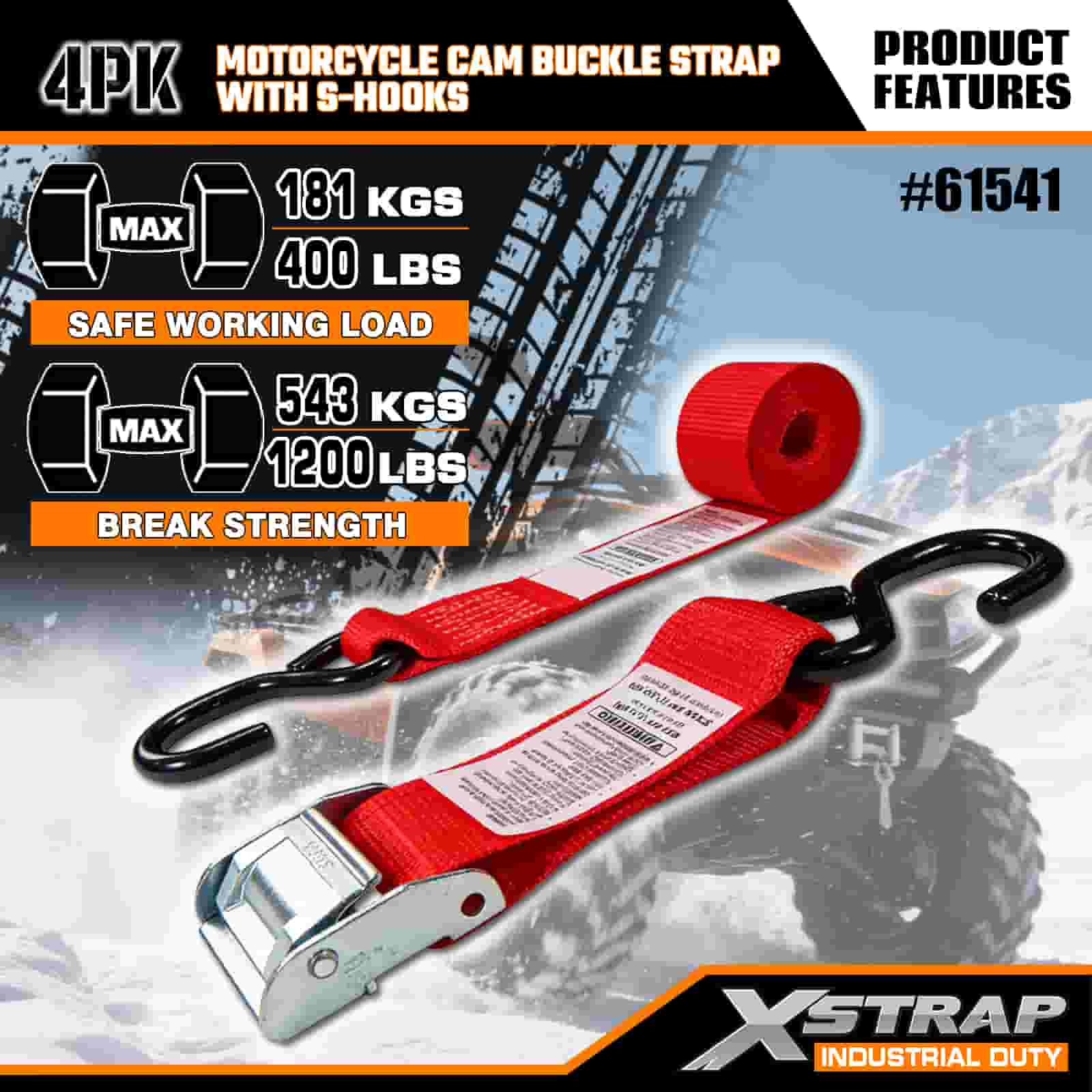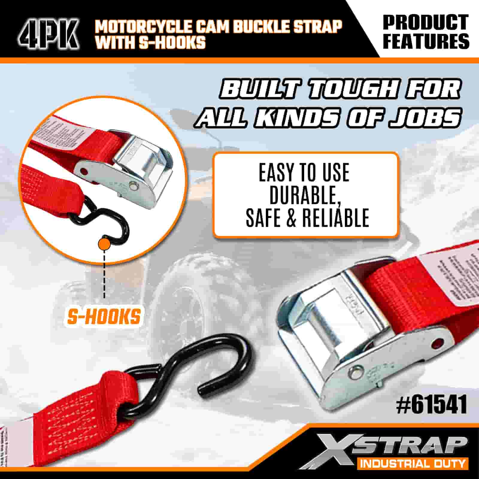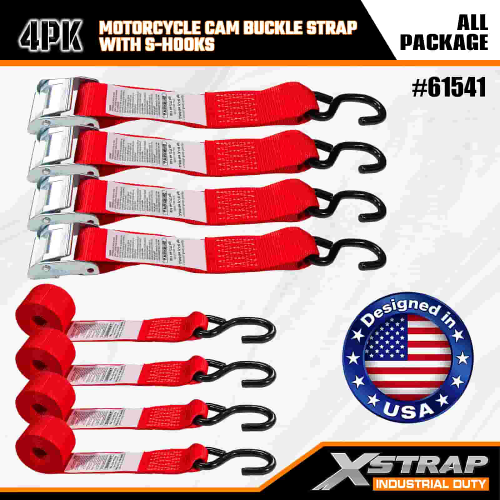 Xstrap 4PK Motorcykel Cam Buckle Strap med S-krog, 2" x 8' Polyester Tie Down Strap Pull Ratchet Spænderem, 400 lbs Kapacitet Cargo Surring Sikringsstropper med S-krog til den seriøse professionelle til at sikre fragttrailer, fladvogn, skibåd, lille bil.