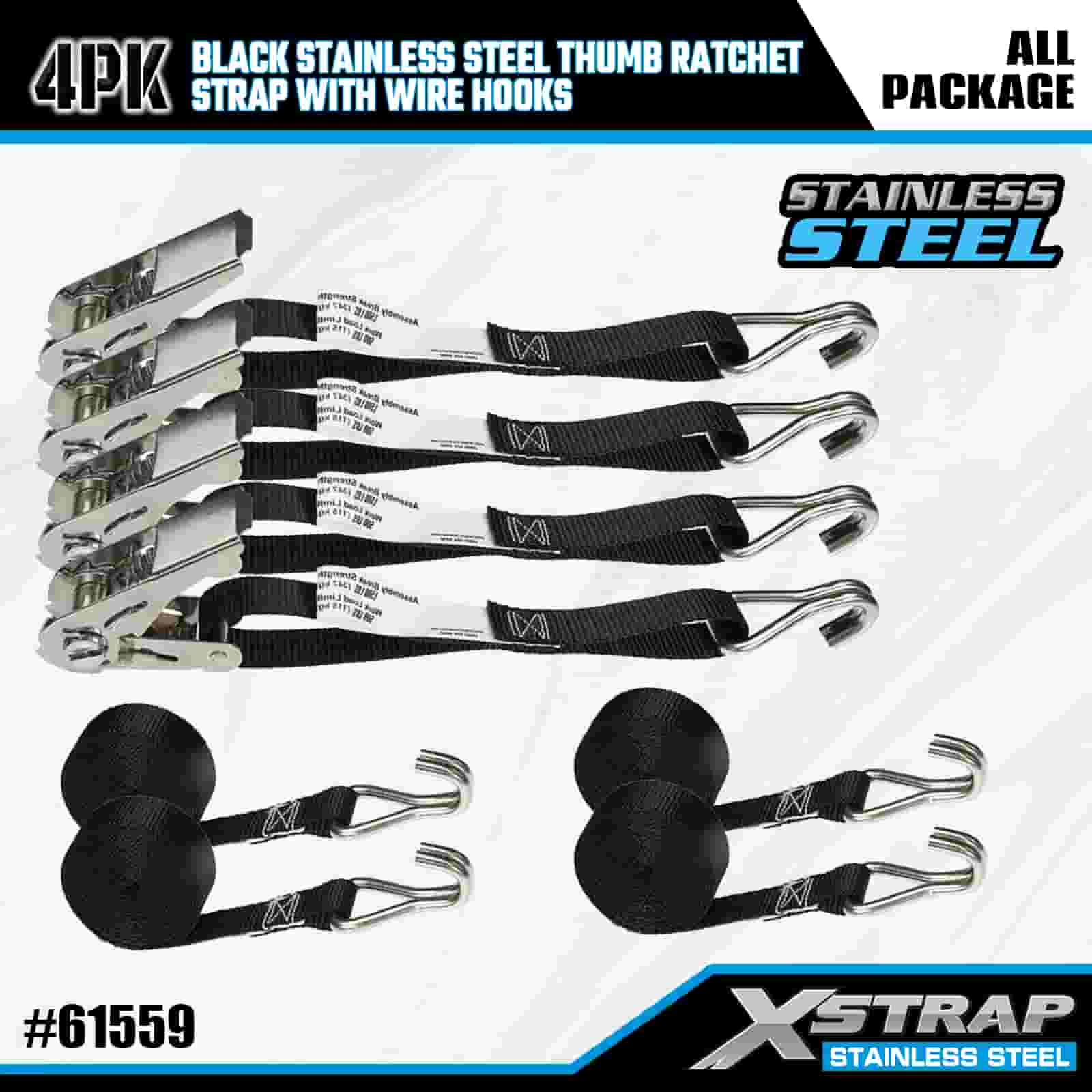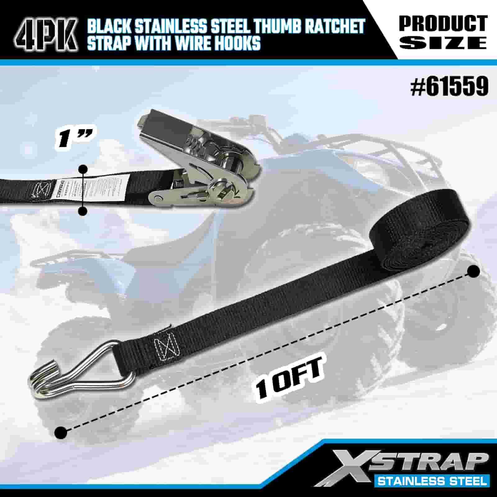 Xstrap 4PK sort rustfrit stål tommelfingerskralde med trådkroge, 1" x 10' polyester bindestrop Skraldestrop, 500lbs Kapacitet Cargo Surring Sikringsstropper med trådkroge til trailer, fladvogns trailer skibåd, lille bil, tungt udstyr.