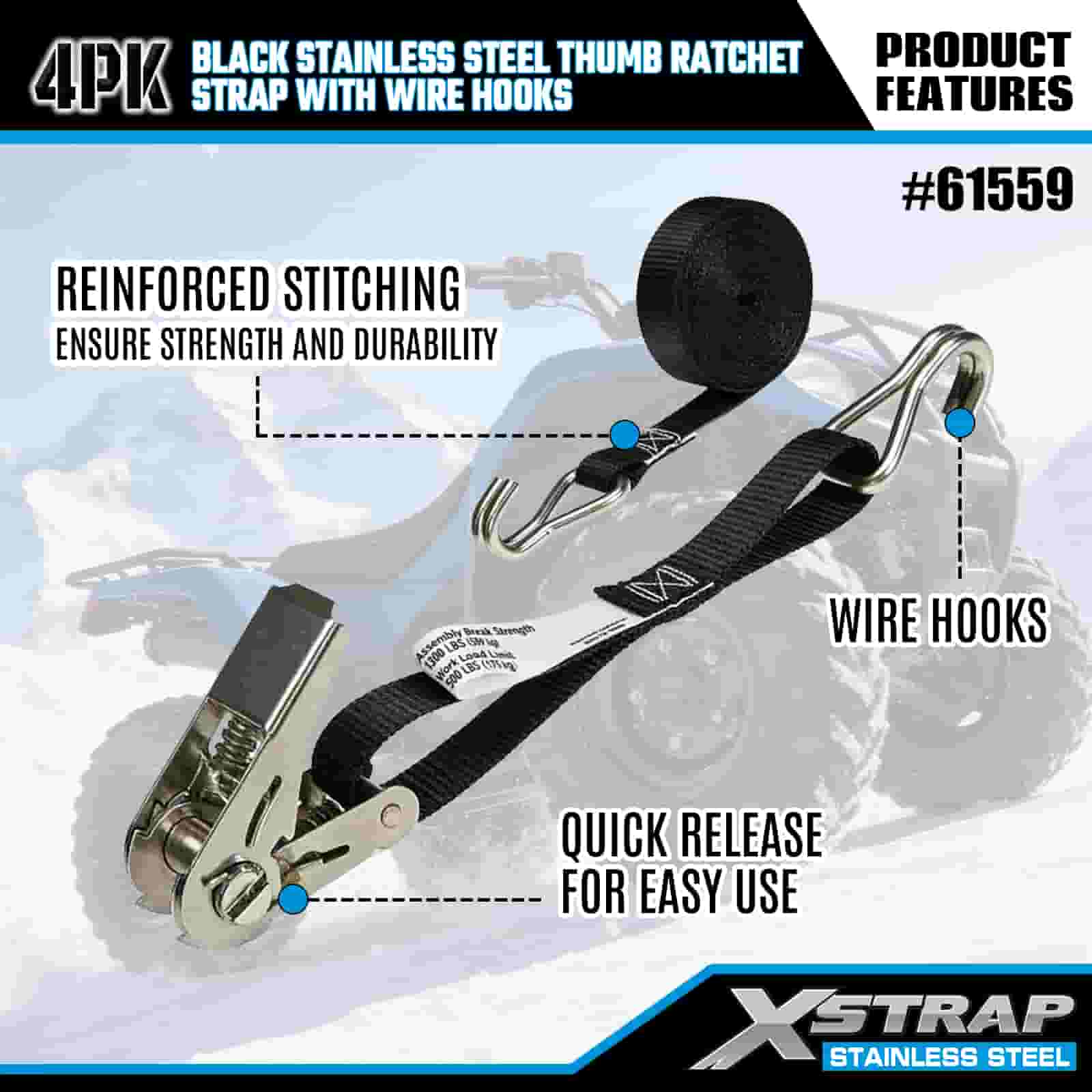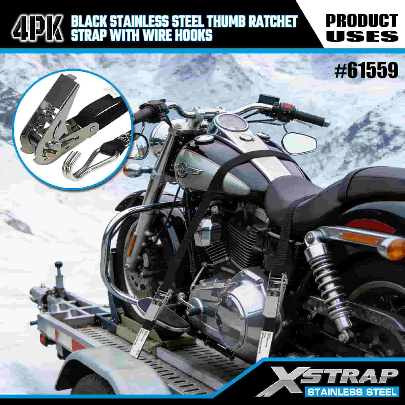 - Eventyr og industriel hårdfør, bygget til at præstere. Denne skralderem i rustfrit stål er konstrueret til både off-road motorcykeltransport og hårdt arbejde på arbejdspladsen og er bygget til at håndtere mudder, sne og dagligt slid. Stol på XStraps 20 års lastkontrolekspertise for et lastrum, du kan stole på, uanset terrænet.