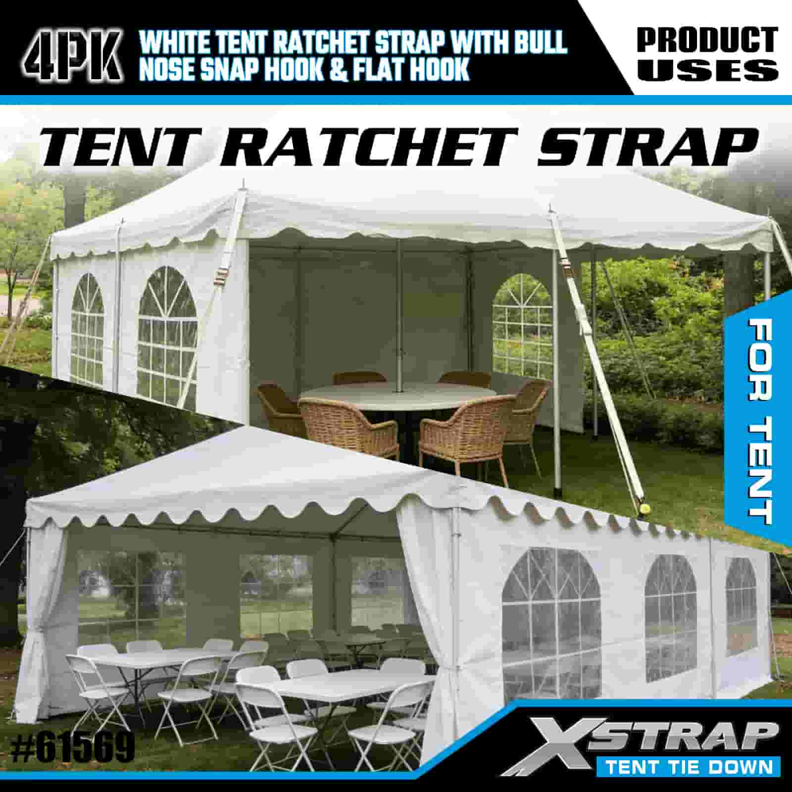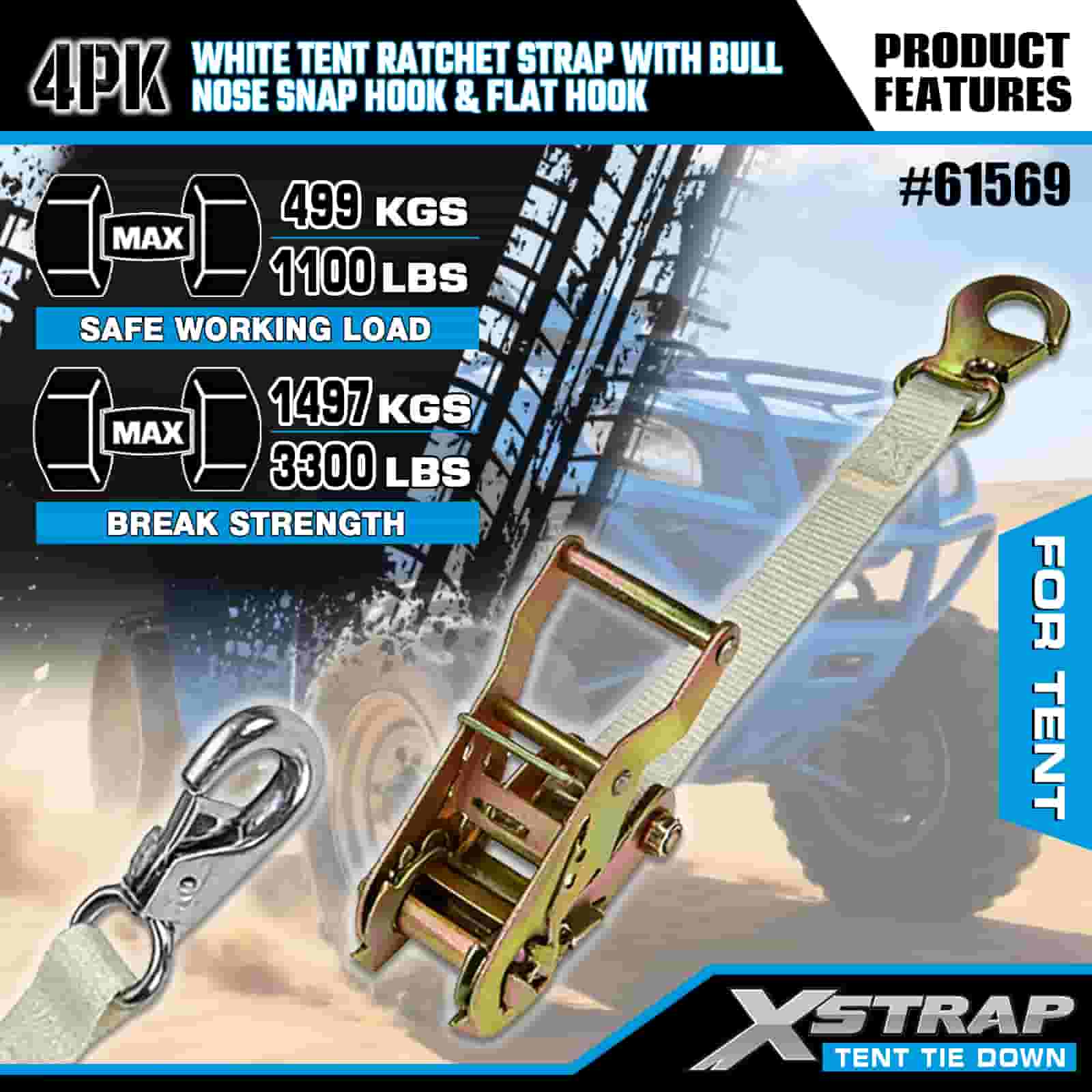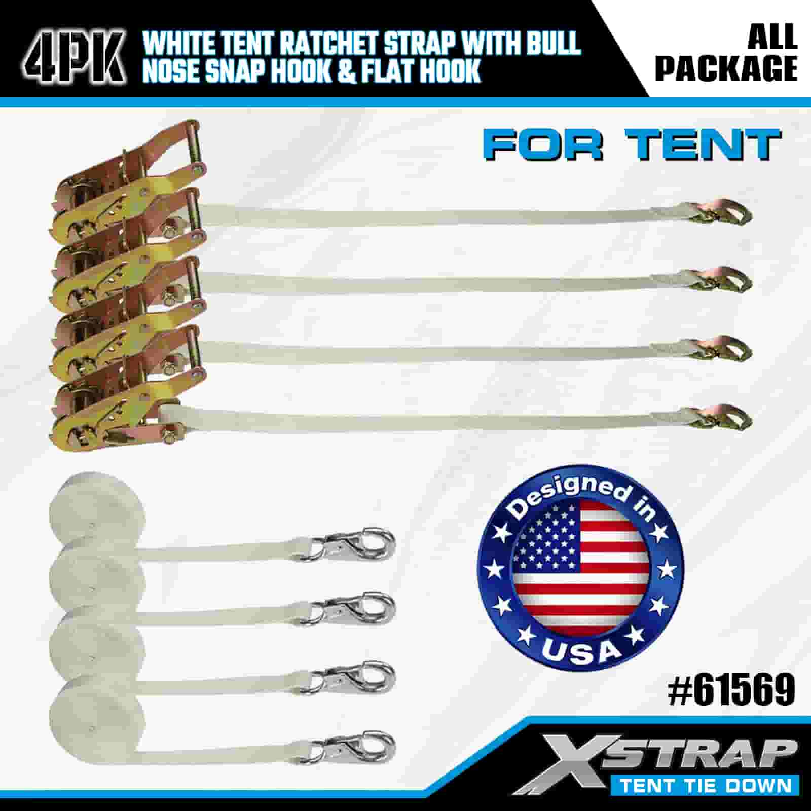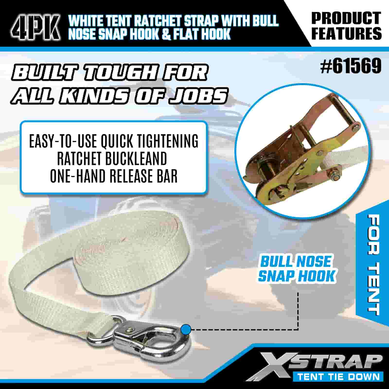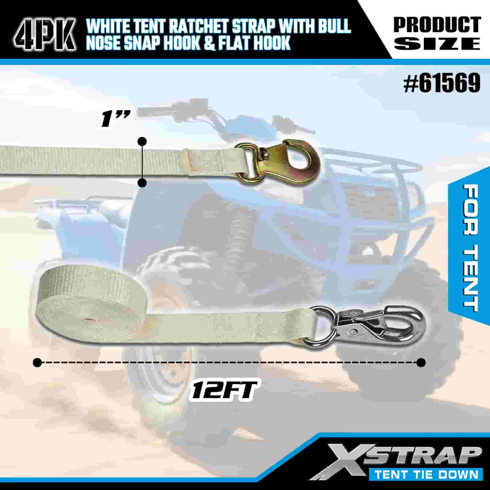 Xstrap 4PK hvid telt skralderem med Bull Nose Snap krog og flad krog, 1" x 12" polyester bindestrop Skralde strop, 1100lbs Kapacitet Cargo Surring Sikringsstropper med næse snapkrog og flad krog til lastkontrol, teltfiksering.
