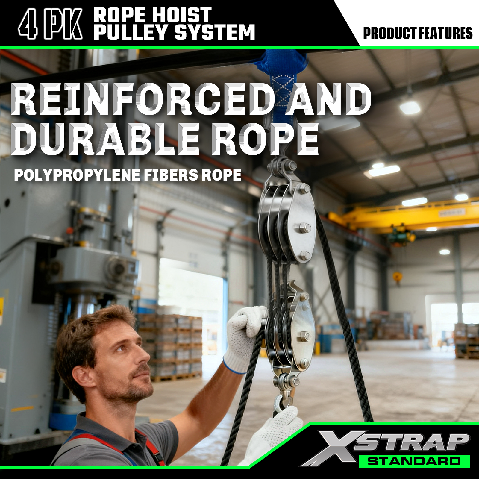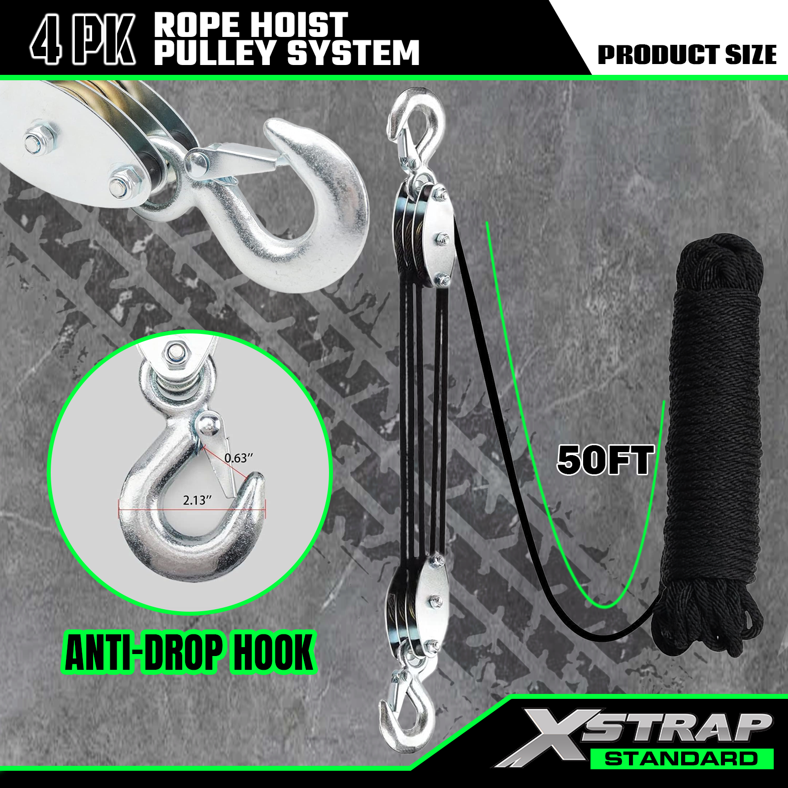 Dette er Xstrap Standard Rope Hoist Pulley System. Kapaciteten er 1000 lbs, brudstyrken er 2000 lbs. 5:1 Lifting Power 50ft Heavy Duty Pulley Block til jagt, løft af tunge genstande med skridsikre arbejdshandsker, 2 stk bløde løkker.