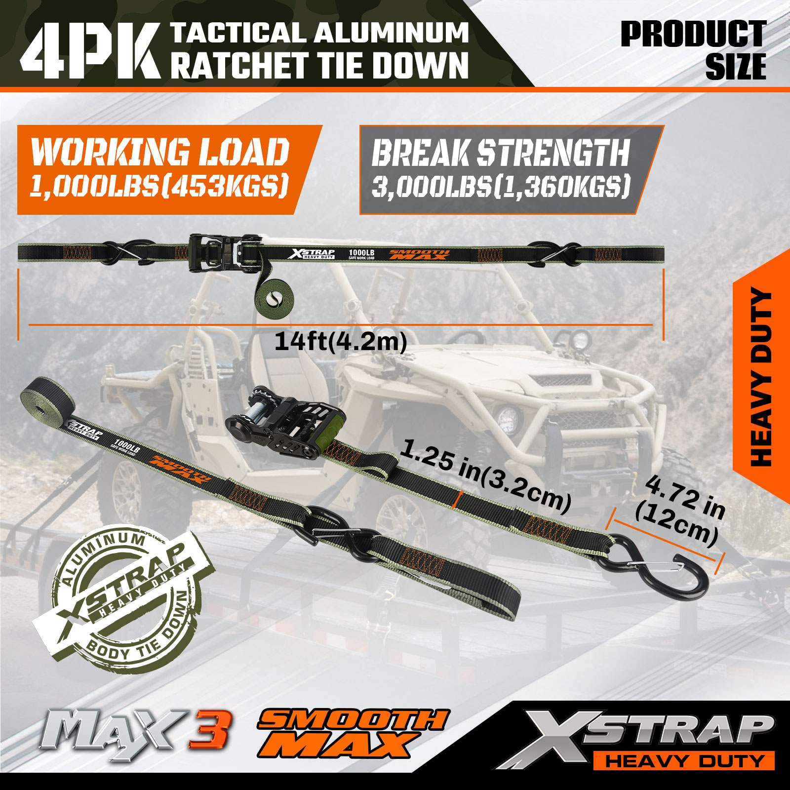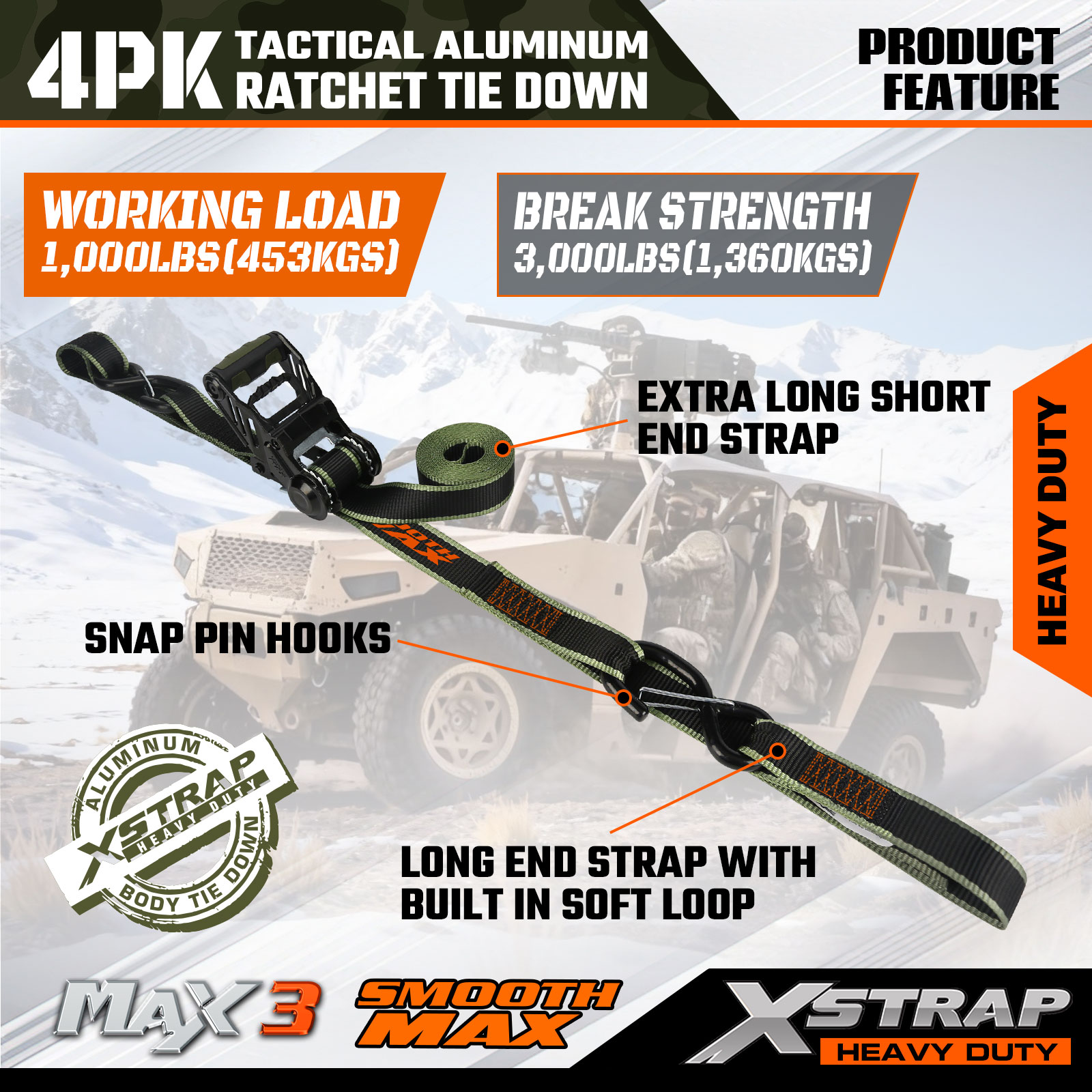 Xstrap Tactical Ratchet Tie Down er 1,25 tommer x 12 fod, den sikre arbejdsbelastning er 1000 lbs, og brudstyrken er 3000 lbs.