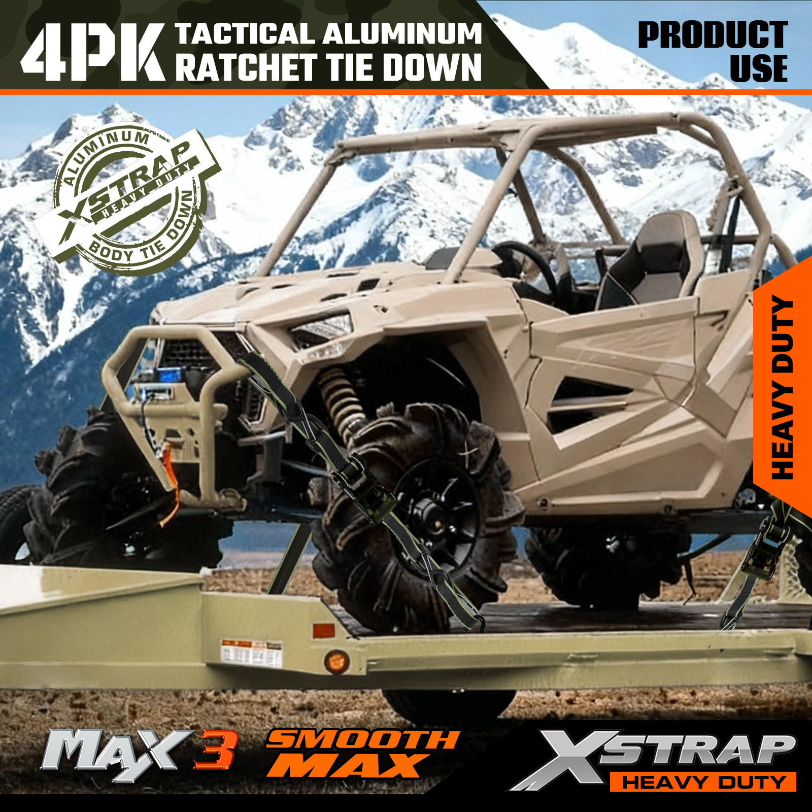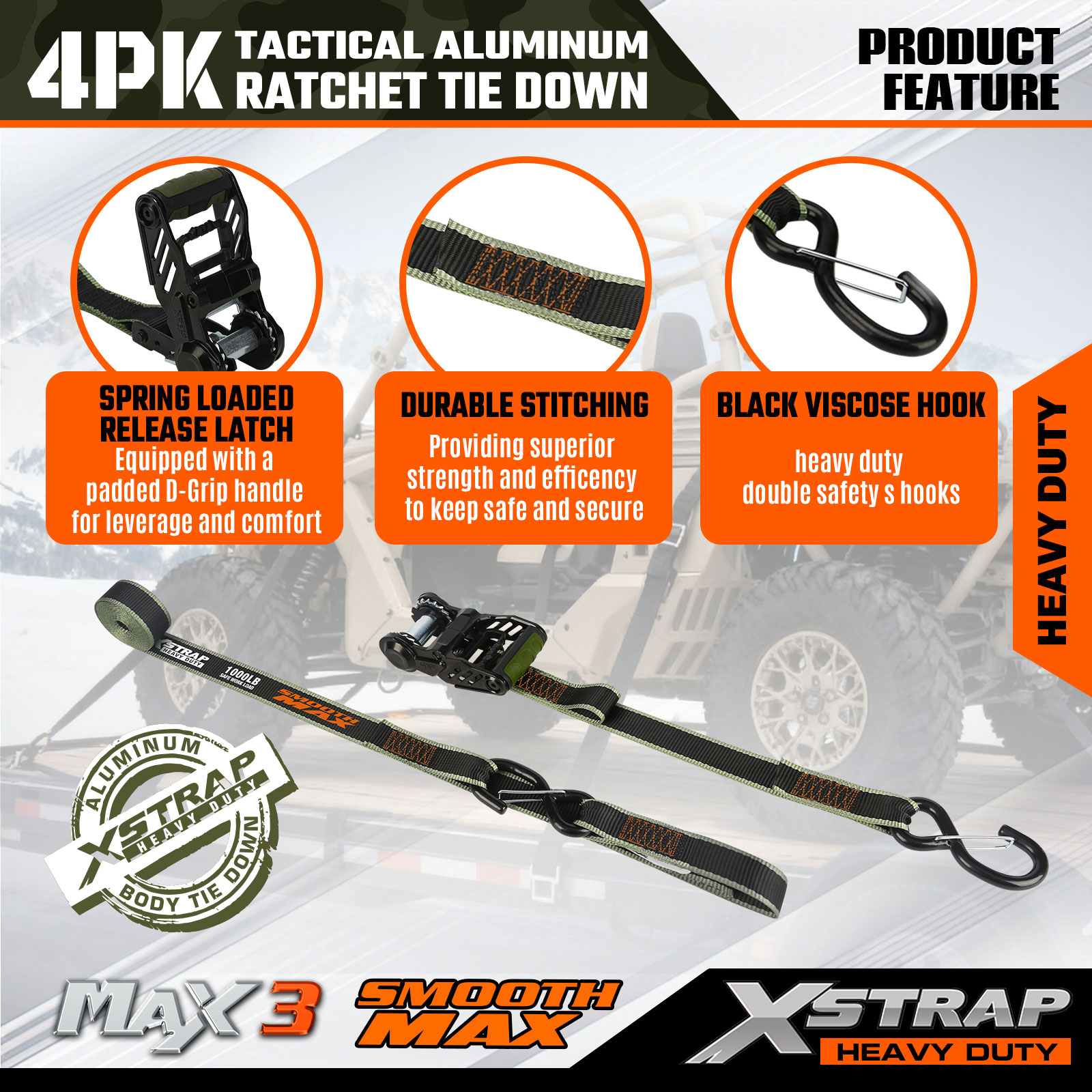Xstrap Tactical Ratchet Tie Downs er stærkere og nemmere at bruge end standard Ratchet Tie Downs. Designet af soft loop kan hjælpe med at sikre lasten uden at beskadige maling eller krom. Diamanthåndtaget giver øget greb, og gummikofangere langs skralden beskytter din last mod ridser. Remmen har præcisionsgear takket være 16 tænder langs tandhjulet på skralde.