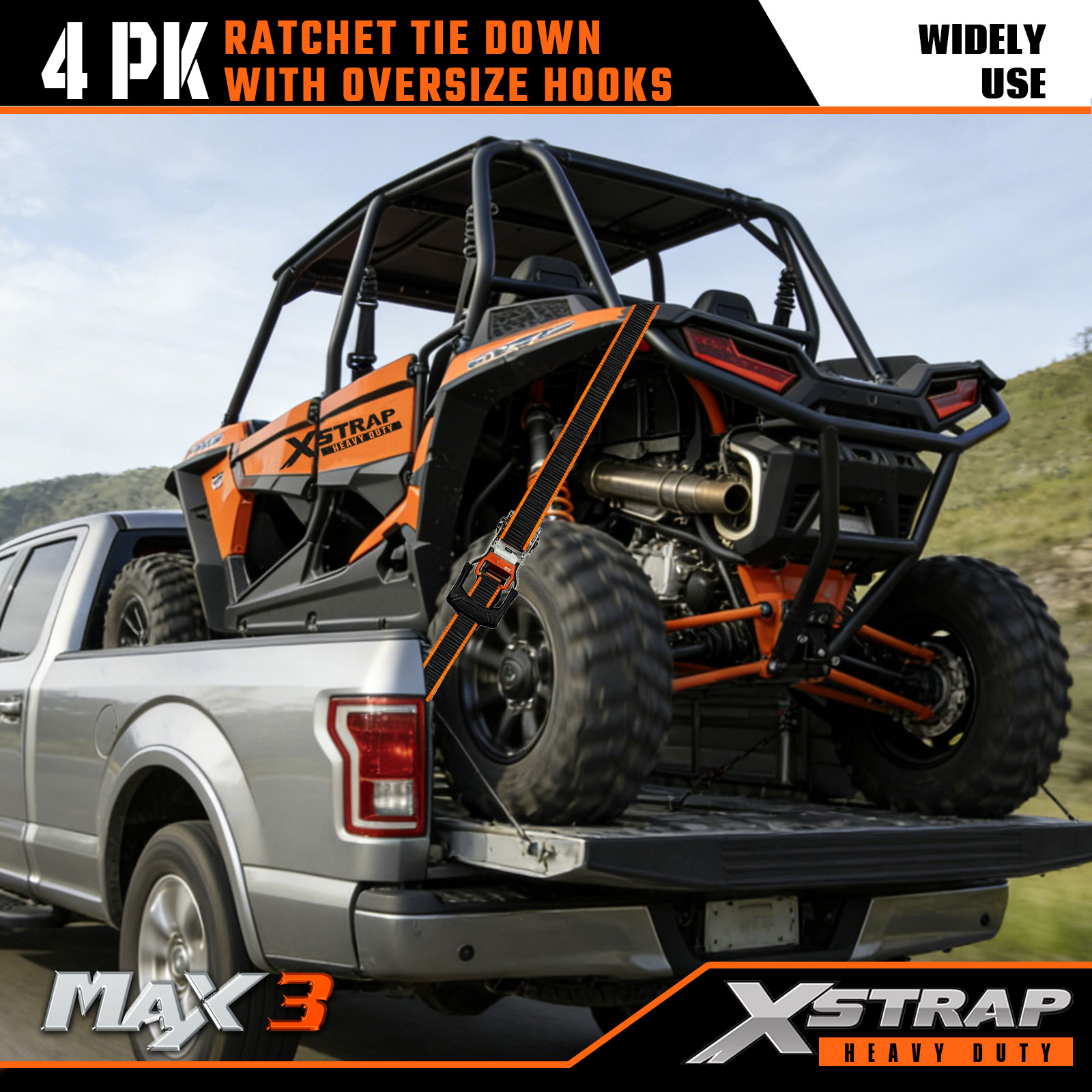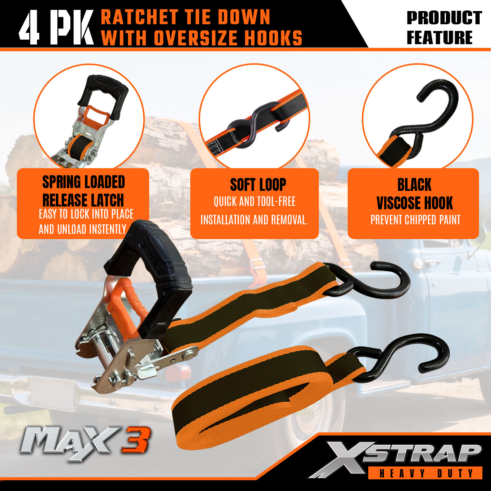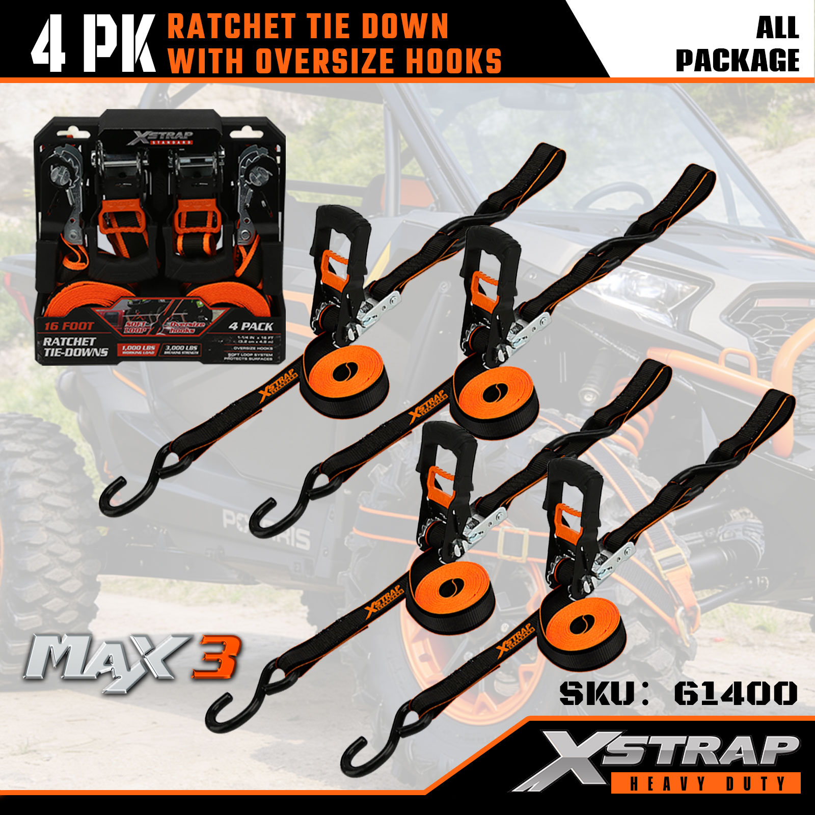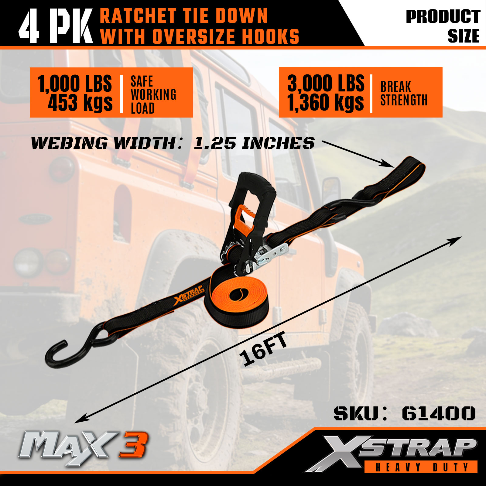 Xstrap 4 Pack Ratchet Tie Down, 1-1/4” x 16″ Polyester Tie Down Strap Pull Ratchet Strap, 1000 lbs Kapacitet Cargo Surring Sikringsstropper med Double J-kroge til pickup, SUV, Car Top Racks Motorcykel, Light Fishing Boat, Lawn Ski Båd,.