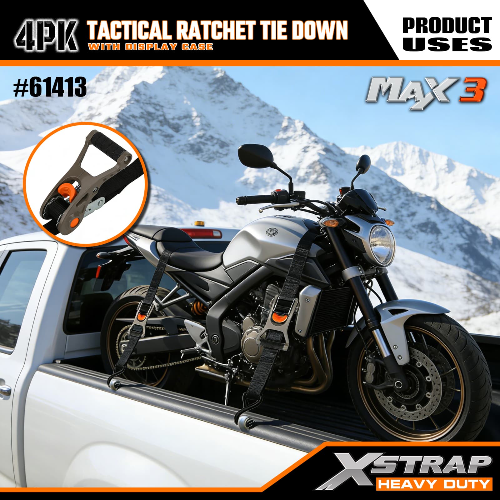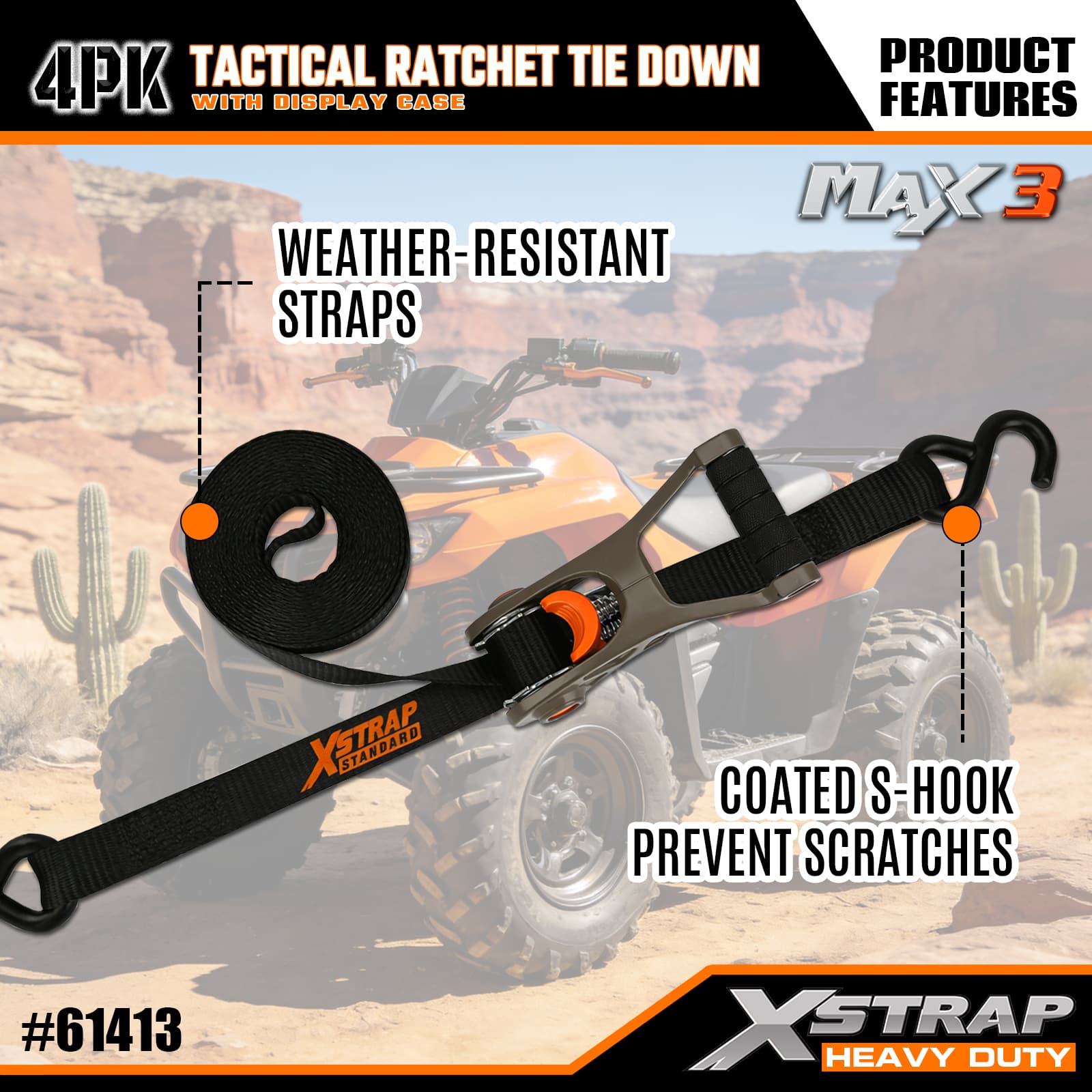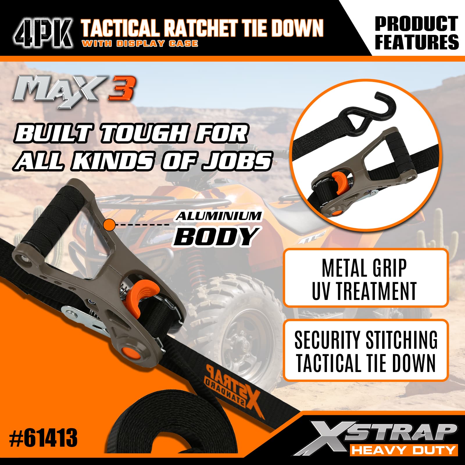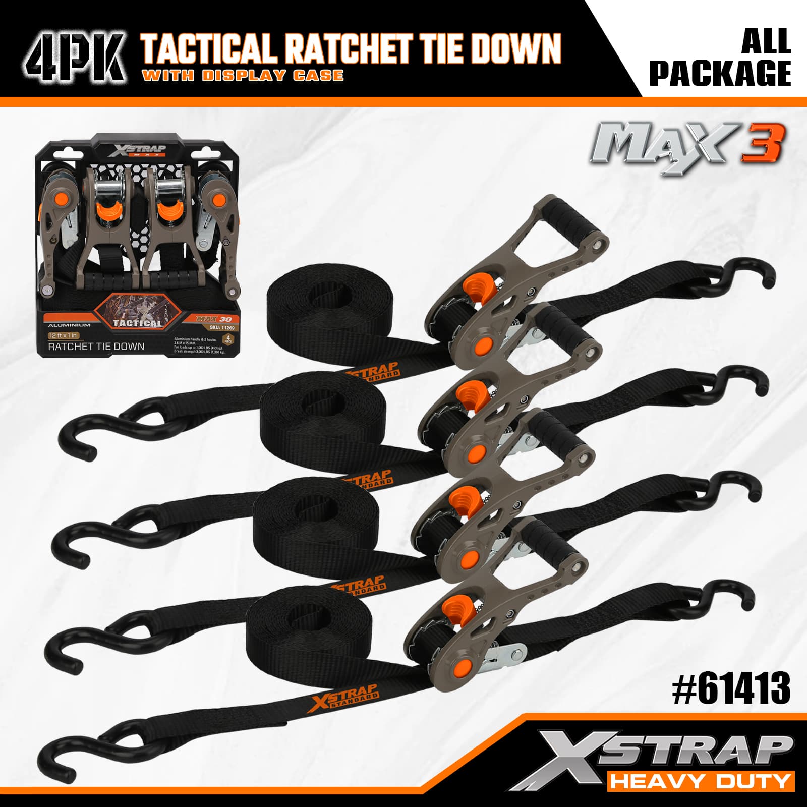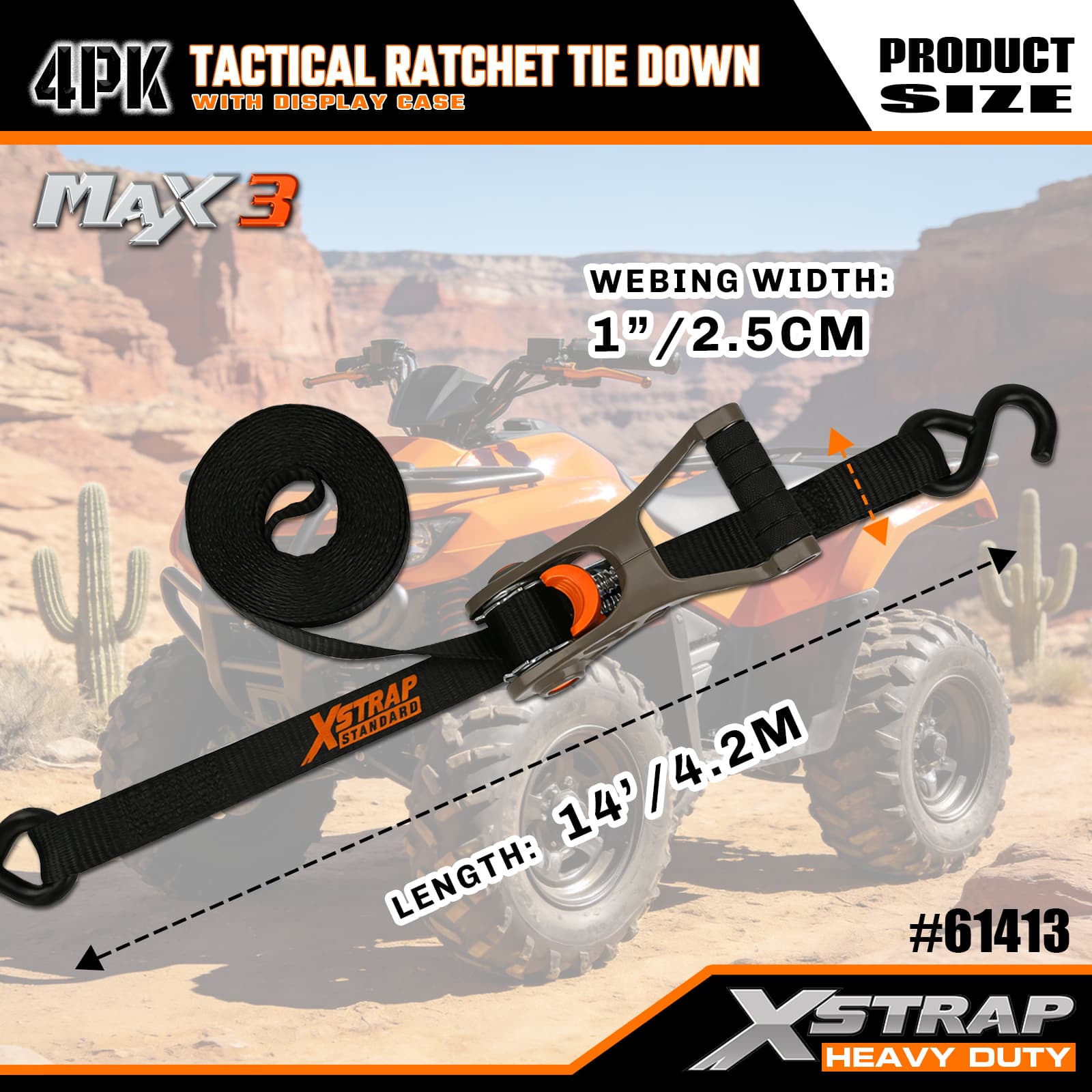 Xstrap 4 Pack Tactical Ratchet Tie Down med Soft Loop, 1” x 14″ Polyester Tie Down Strap Træk Ratchet Strap, 1000 lbs Kapacitet Cargo Surring Sikringsstropper med S kroge til lastbil, SUV, Car Top Racks motorcykel.