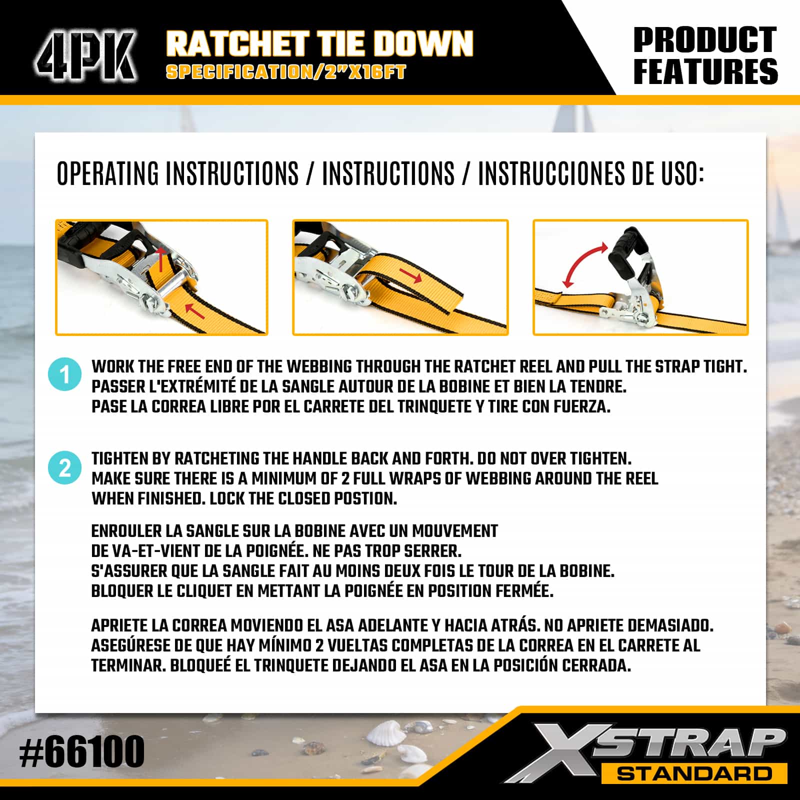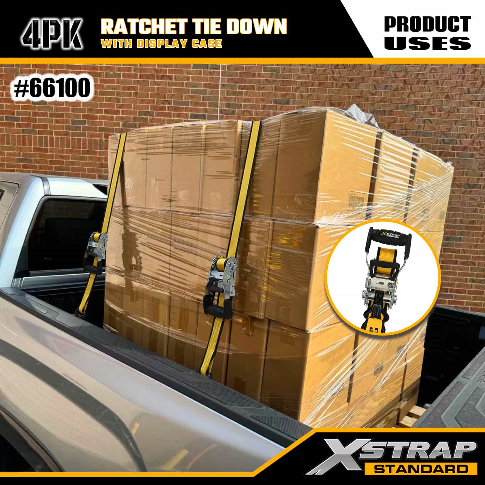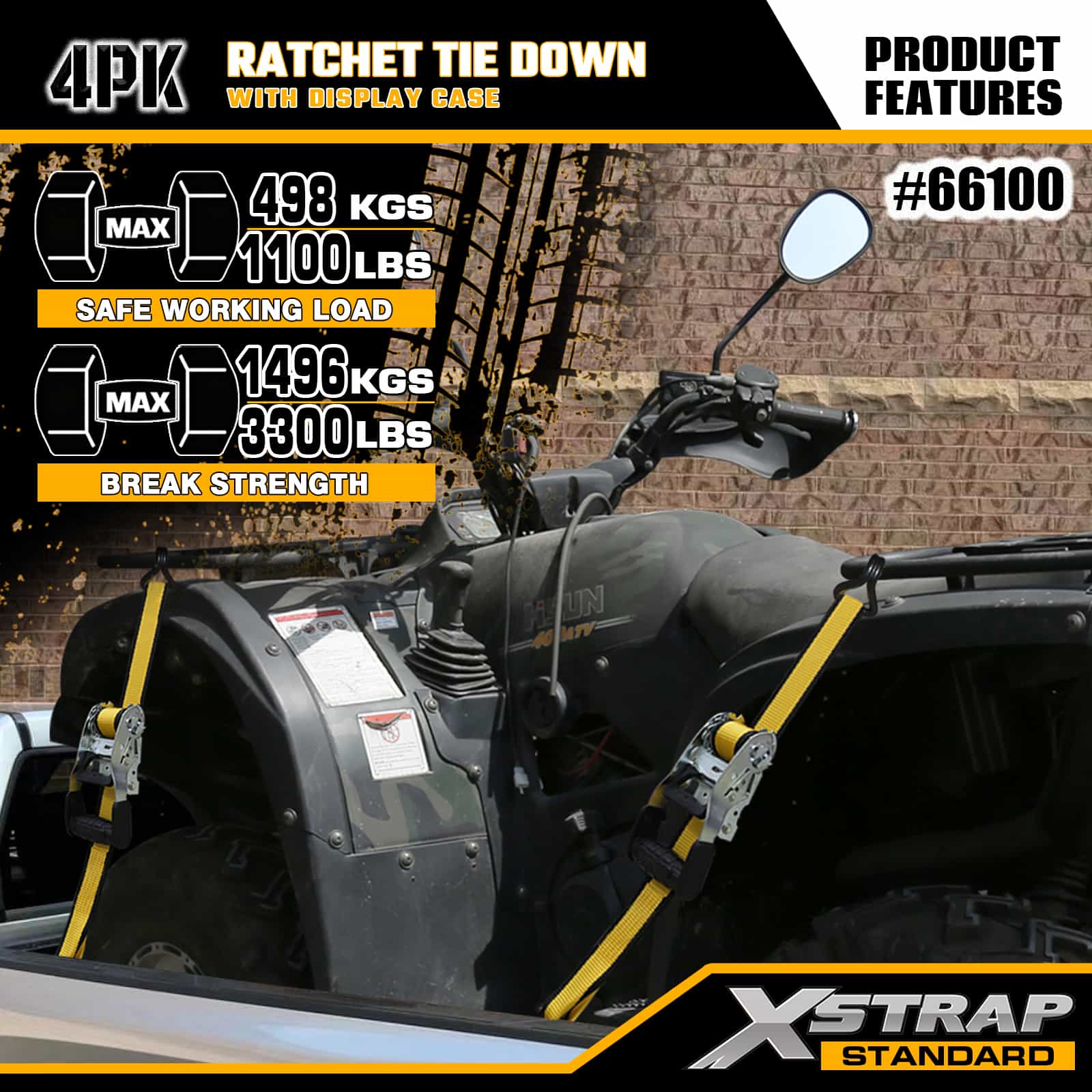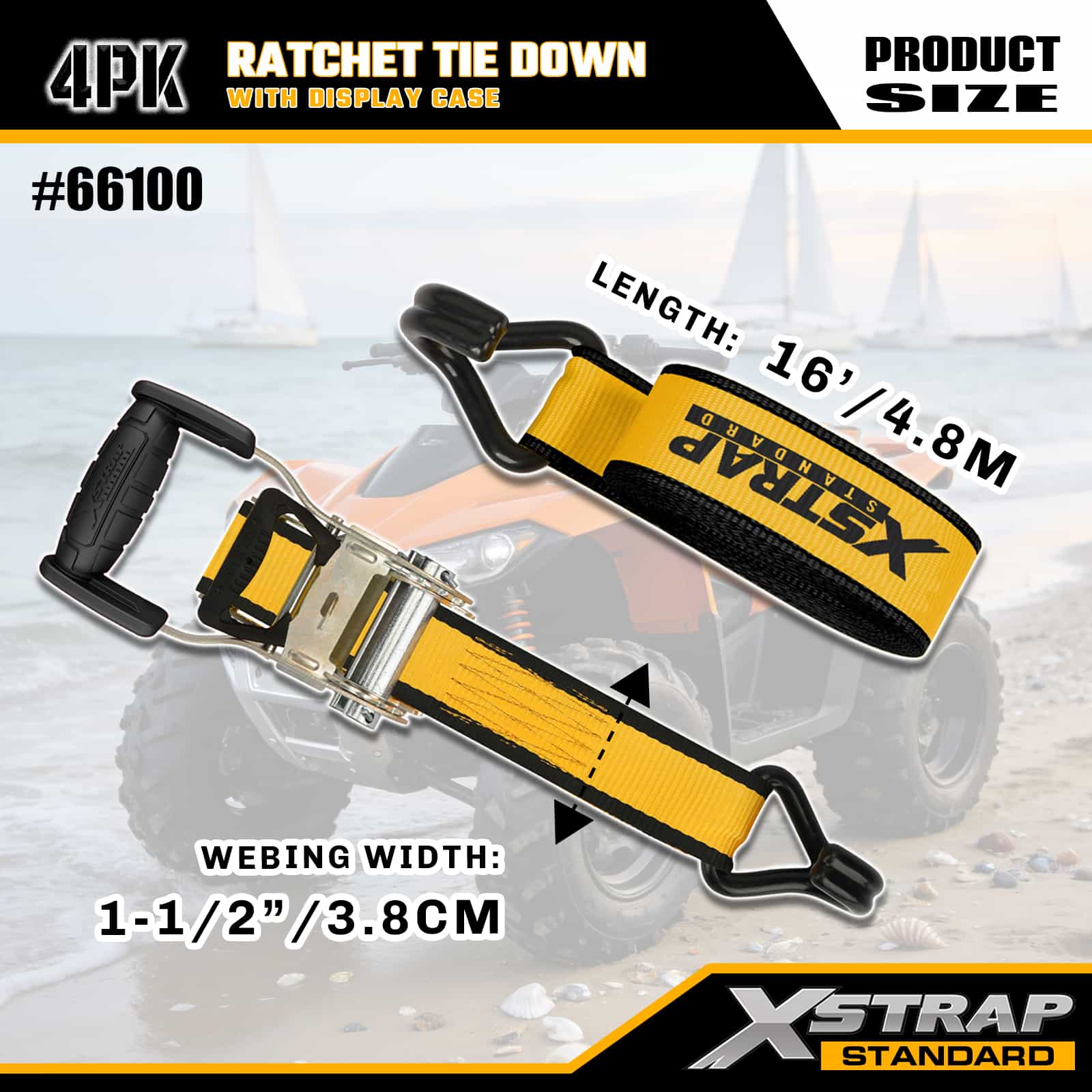 Xstrap 4-pack skraldebinding med dobbelt J kroge, 1-1/2" x 16' polyester bindestrop Træk skralderstrop, 1100lbs Kapacitet Cargo Surring Sikringsstropper med Double J kroge til pickup, SUV, Car Top Recks Motorcykel, Light Fishing Tractor, Jet Lawn Tractor.