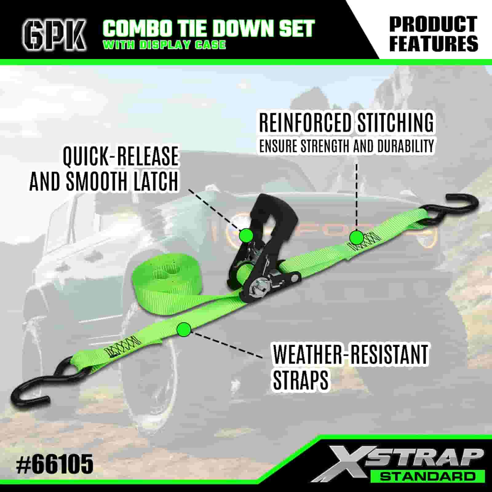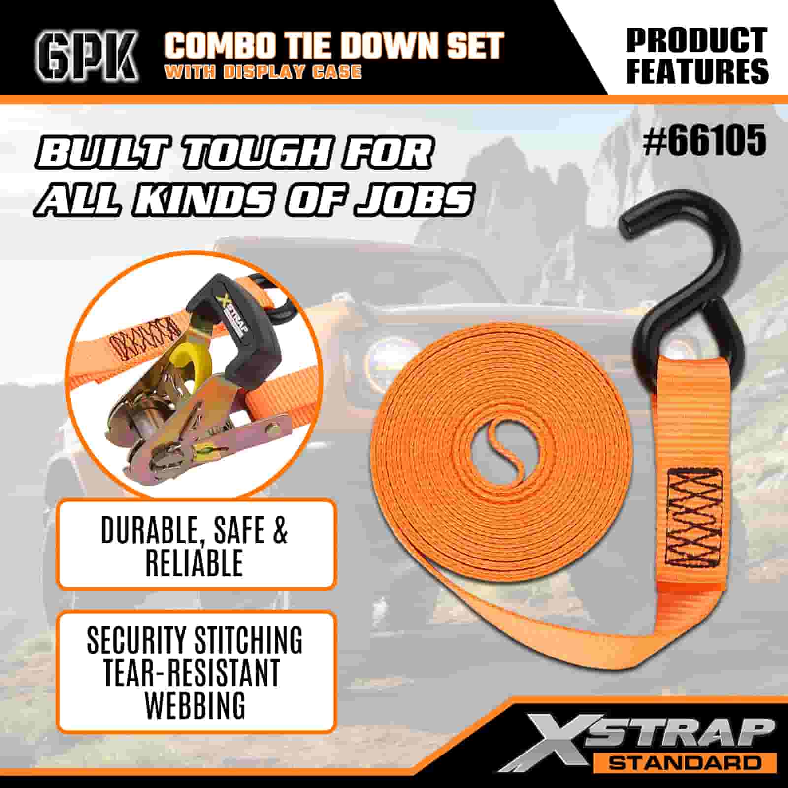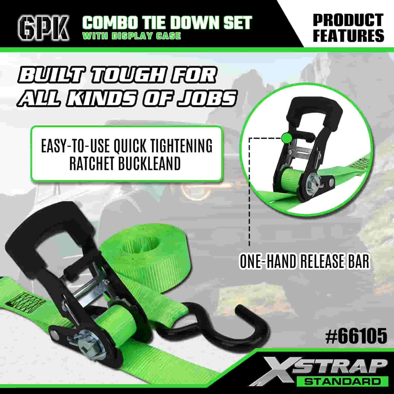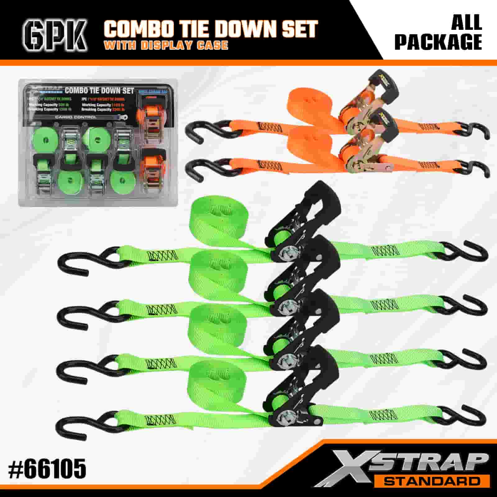 - Organiseret Combo Display Emballage: Leveres i en pæn, mærket vitrine, der adskiller 4 lette grønne bindebånd og 2 kraftige orange bindebånd, som holder sættet ryddeligt til opbevaring, transport og nemt valg af den rigtige rem til hvert job.