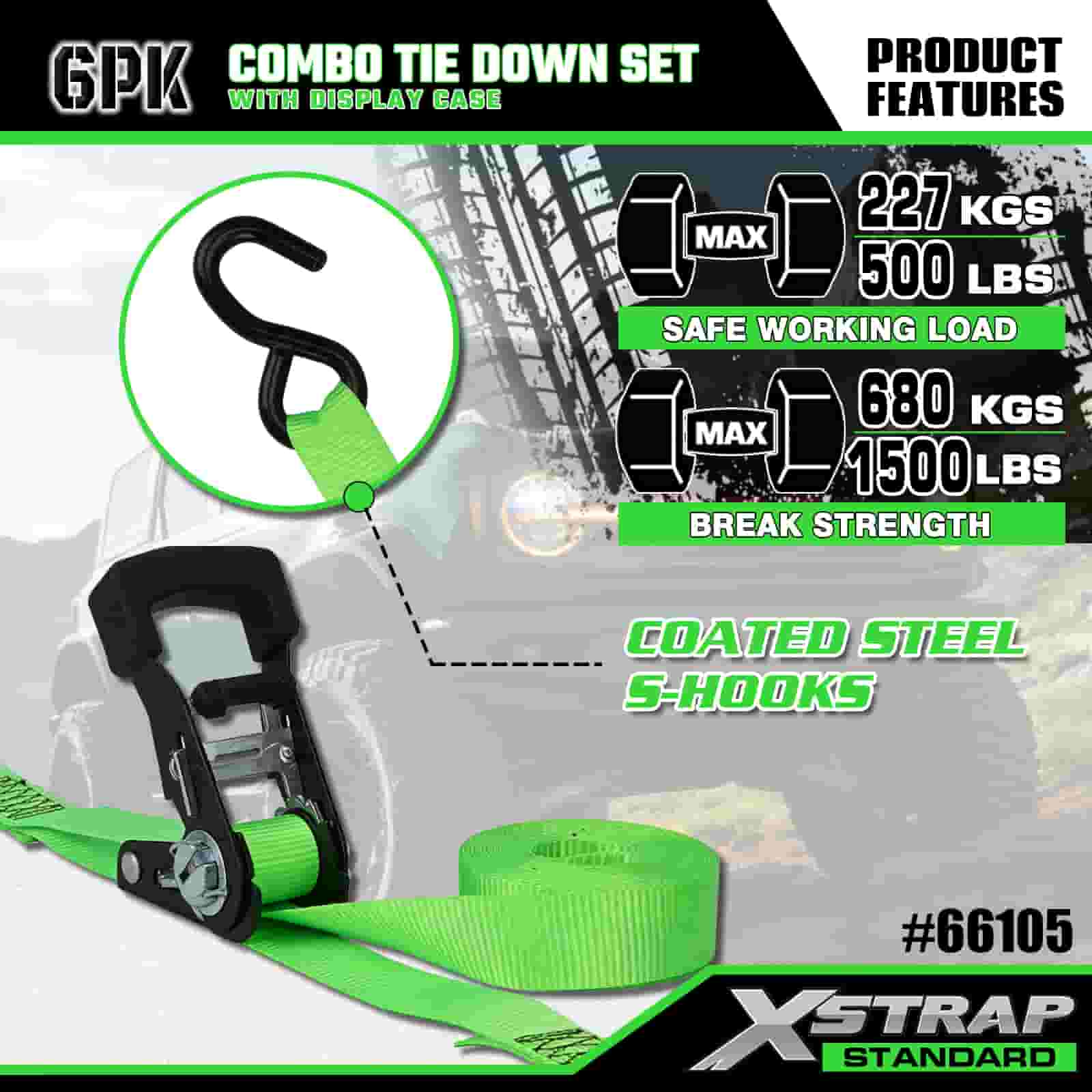 Xstrap 6 Pack Aluminium Ratchet Tie Down, 1” x 14″ og 1” x 10″ Polyester Tie Down Strap Pull Ratchet Strap, 500lbs og 1100lbs Capacitet Cargo Surring Sikringsstropper med S-kroge til Cargo-kontrol, SU-motorcykel, SU-kontrol til lastbil.