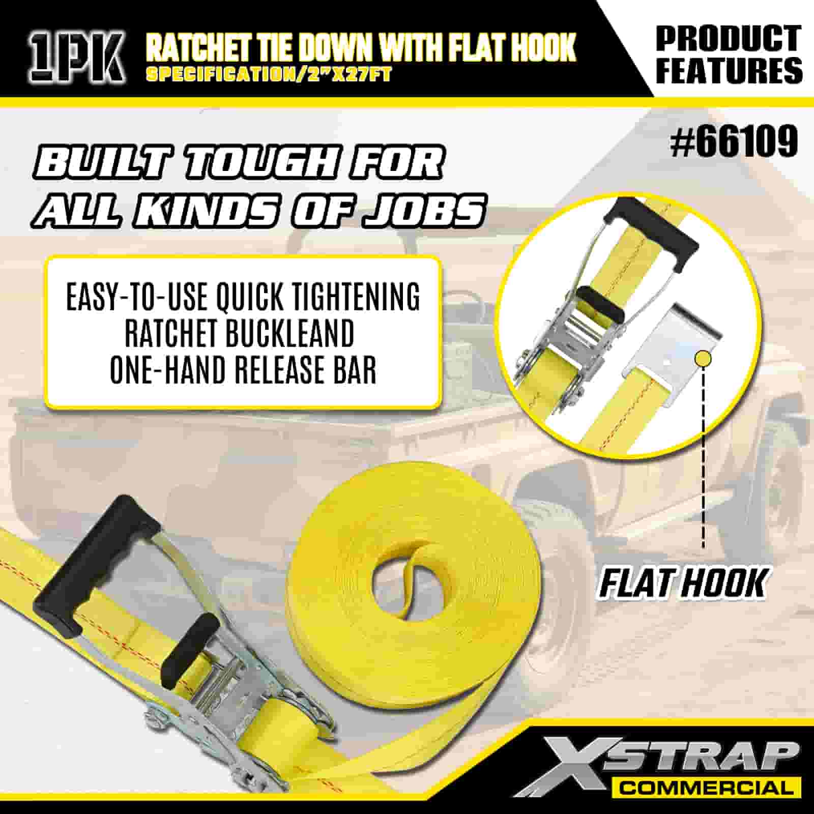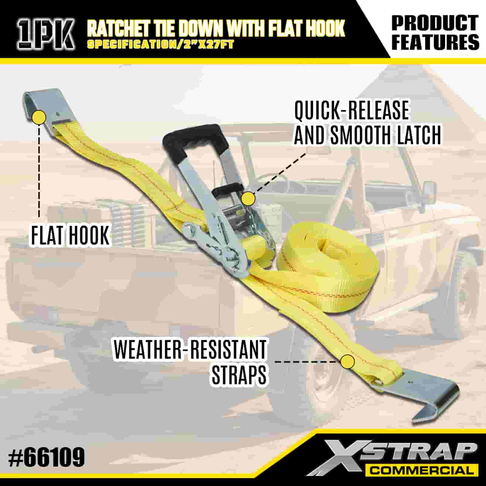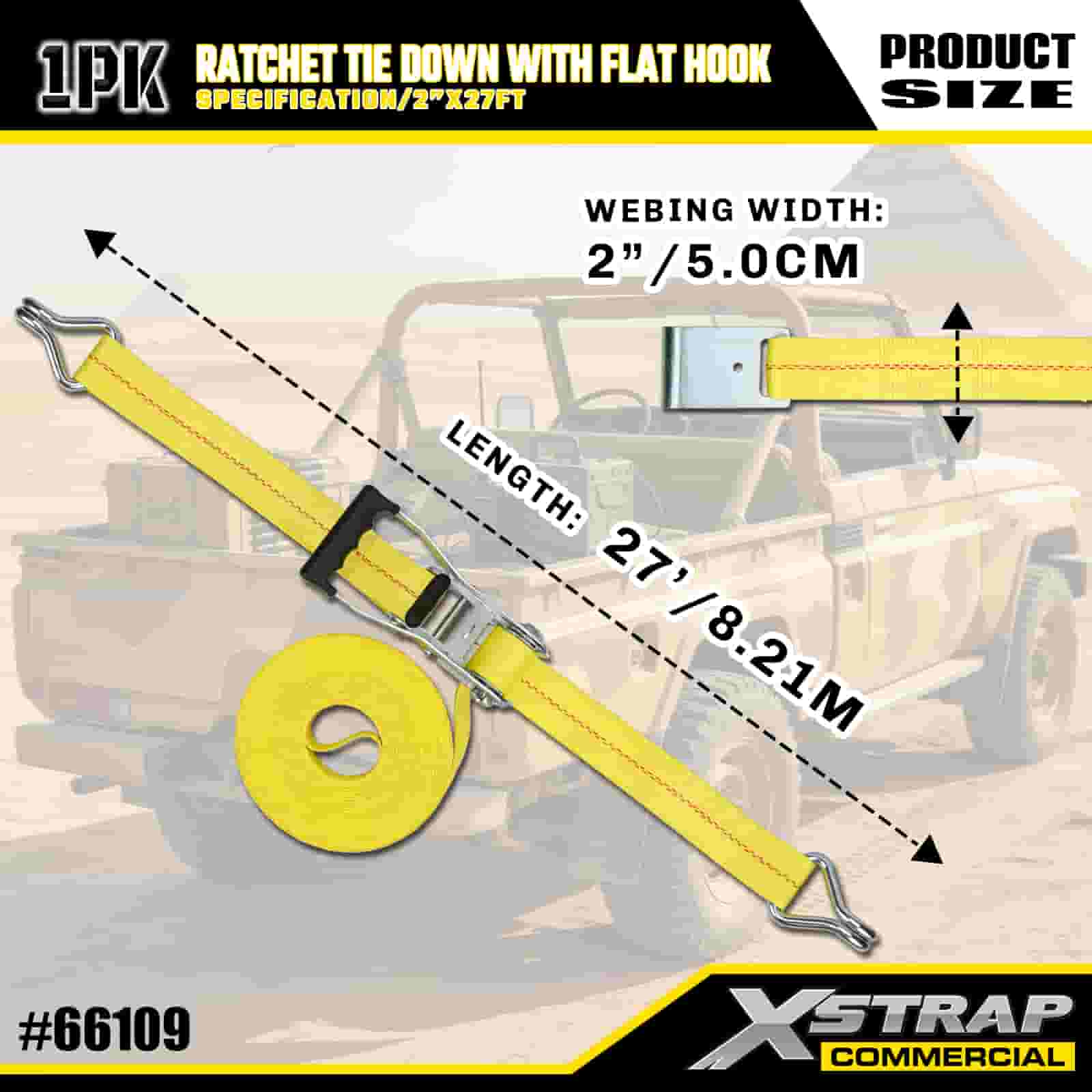 Xstrap Ratchet Tie Down med flade kroge, 2” x 27’ Polyester Tie Down Strap Pull Ratchet Strap, 3333lbs Kapacitet Cargo Surring Sikringsstropper med flade kroge til lastkontrol Pickup, SUV, Car Top Racks Motorcykel,.