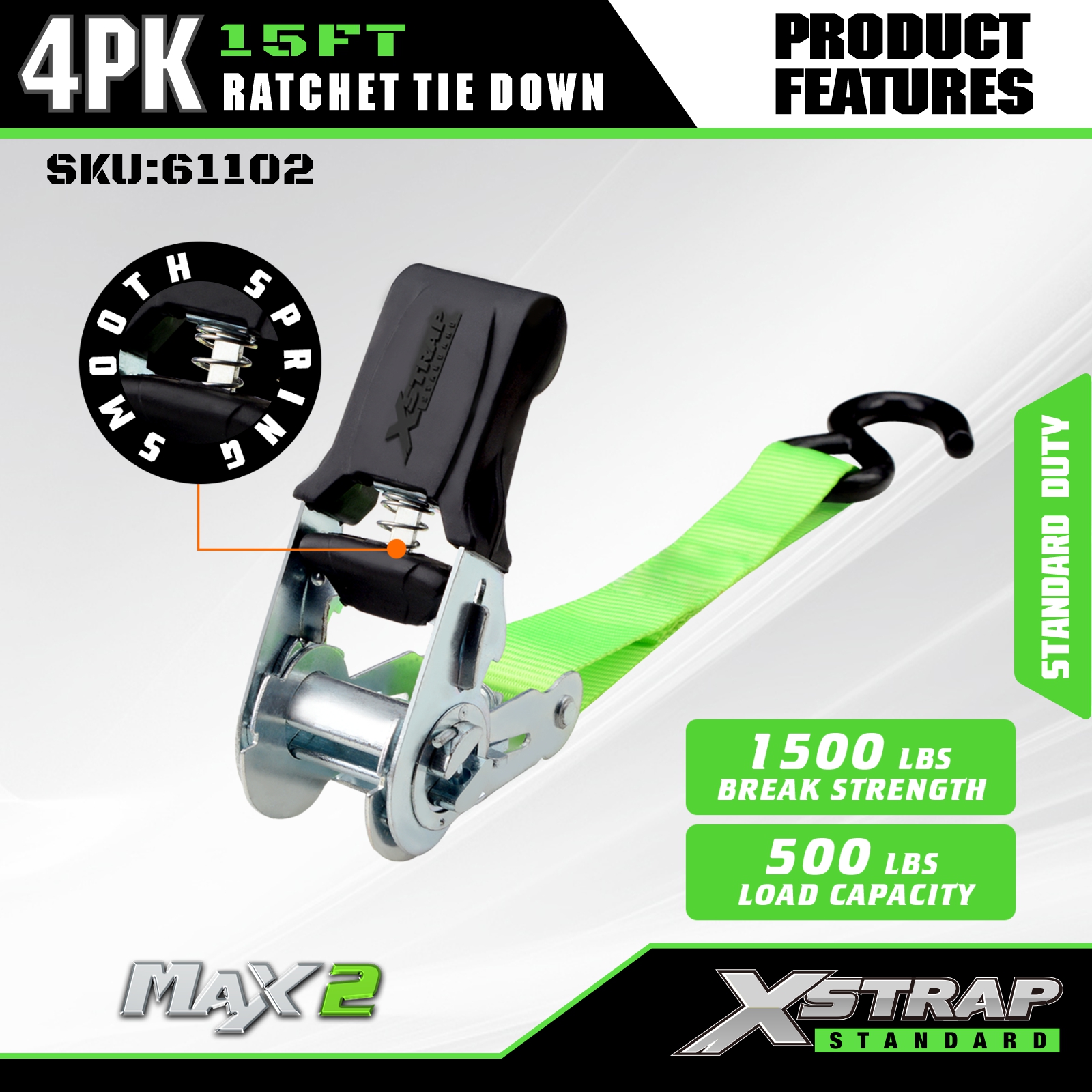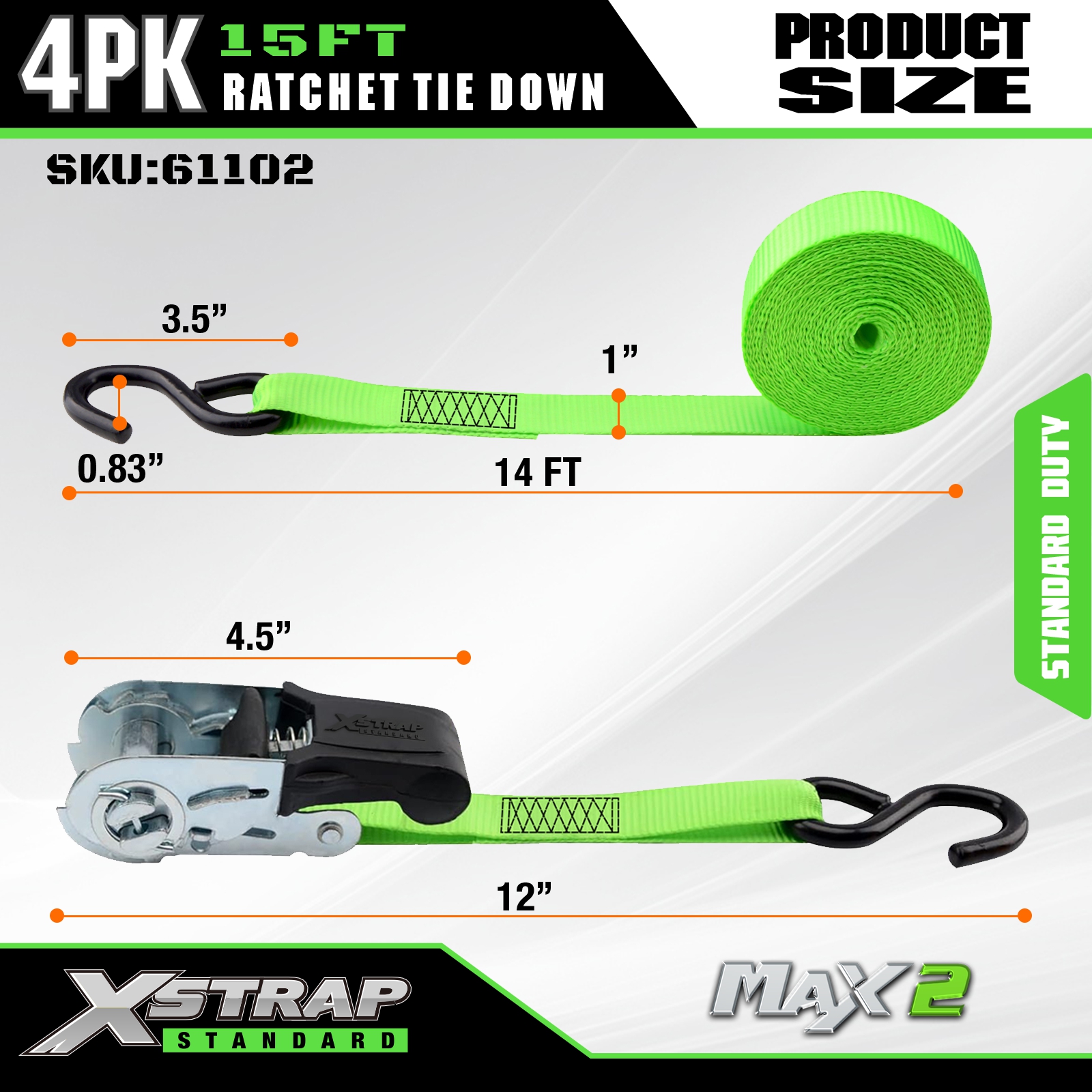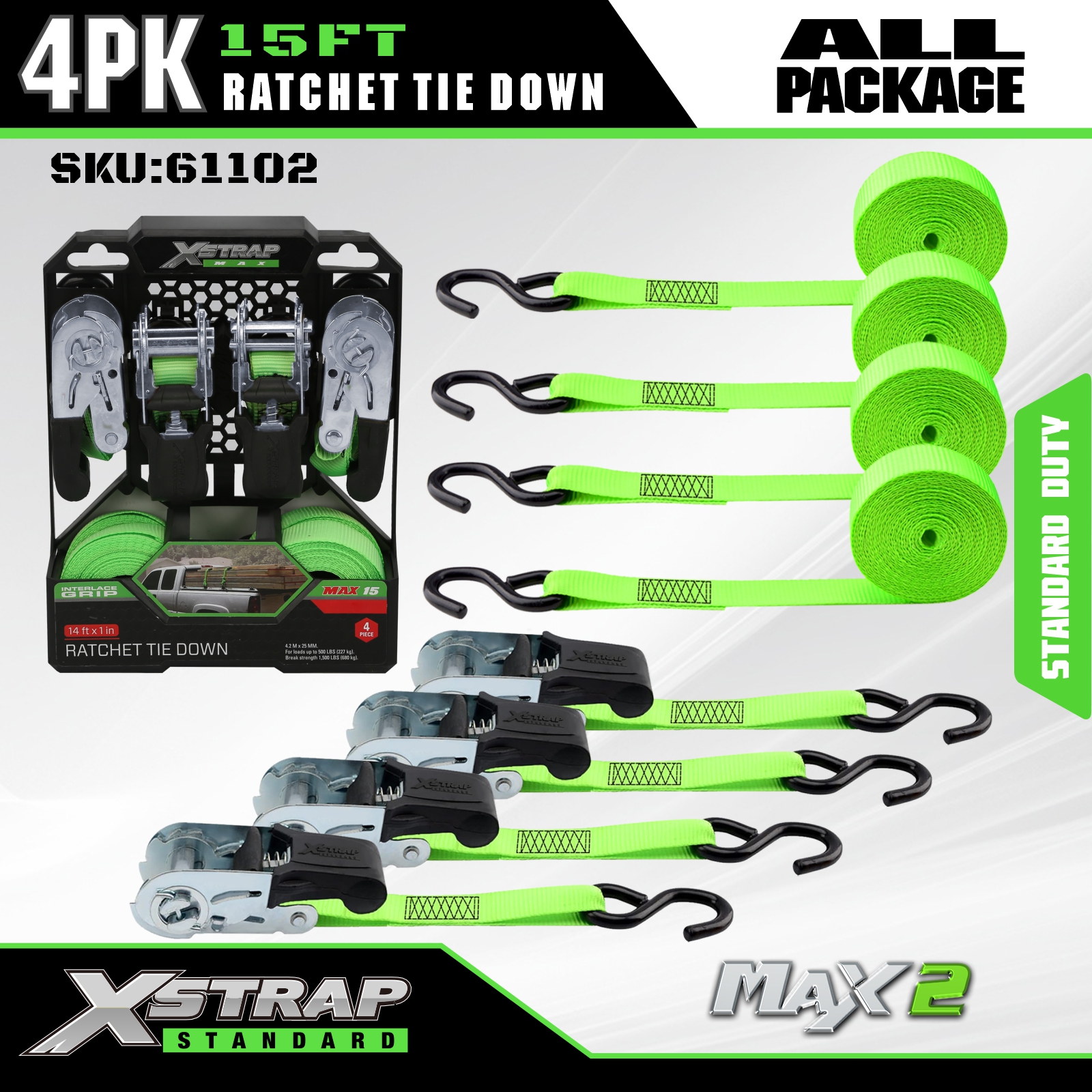 Xstrap Ratchet Tie Down Straps 4 PK 15Ft- 500 Lbs Belastningskapacitet 1500 Lbs Brydestyrke-lastremme til flytning af apparater, græsplæneudstyr, motorcykel.