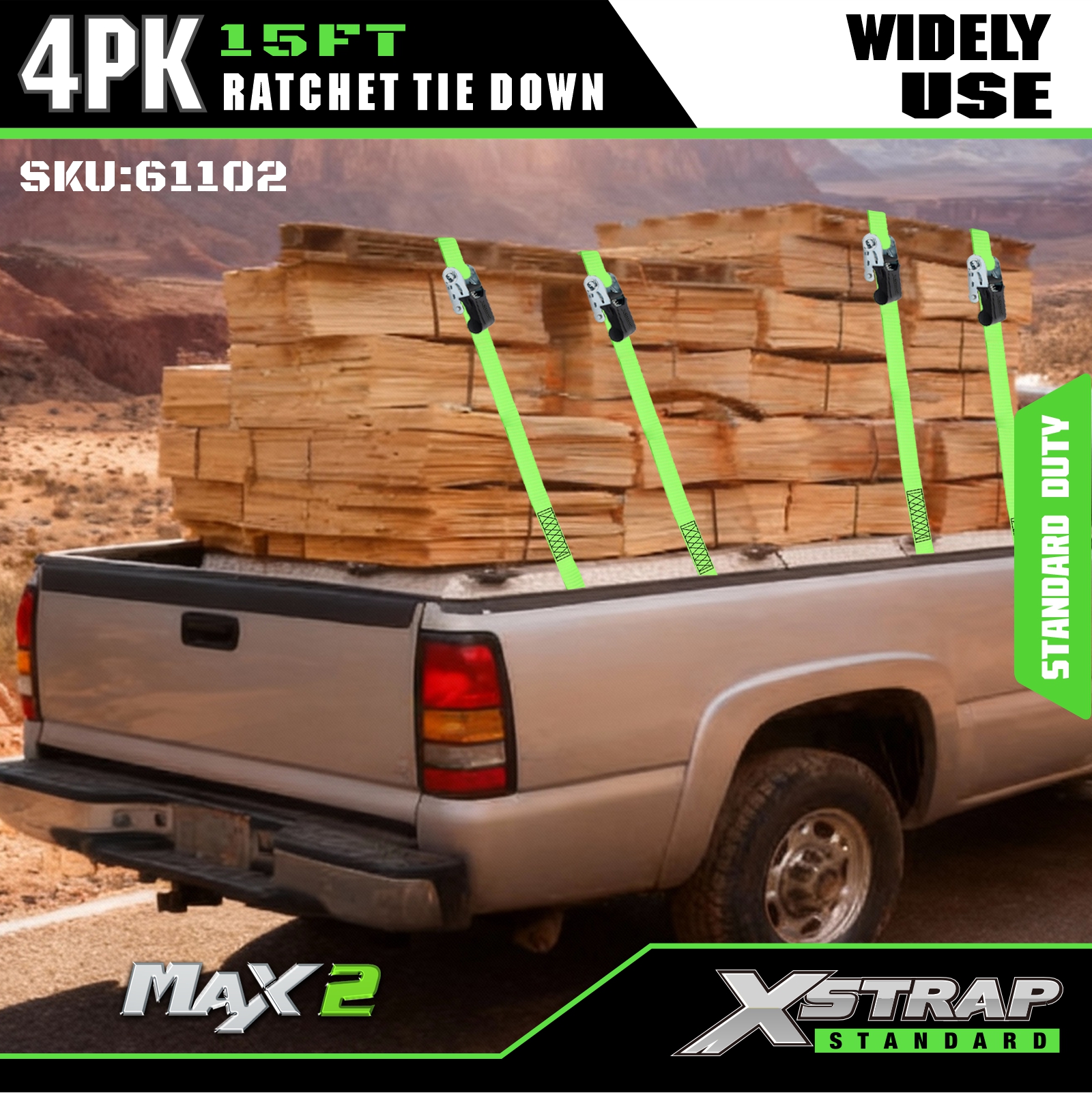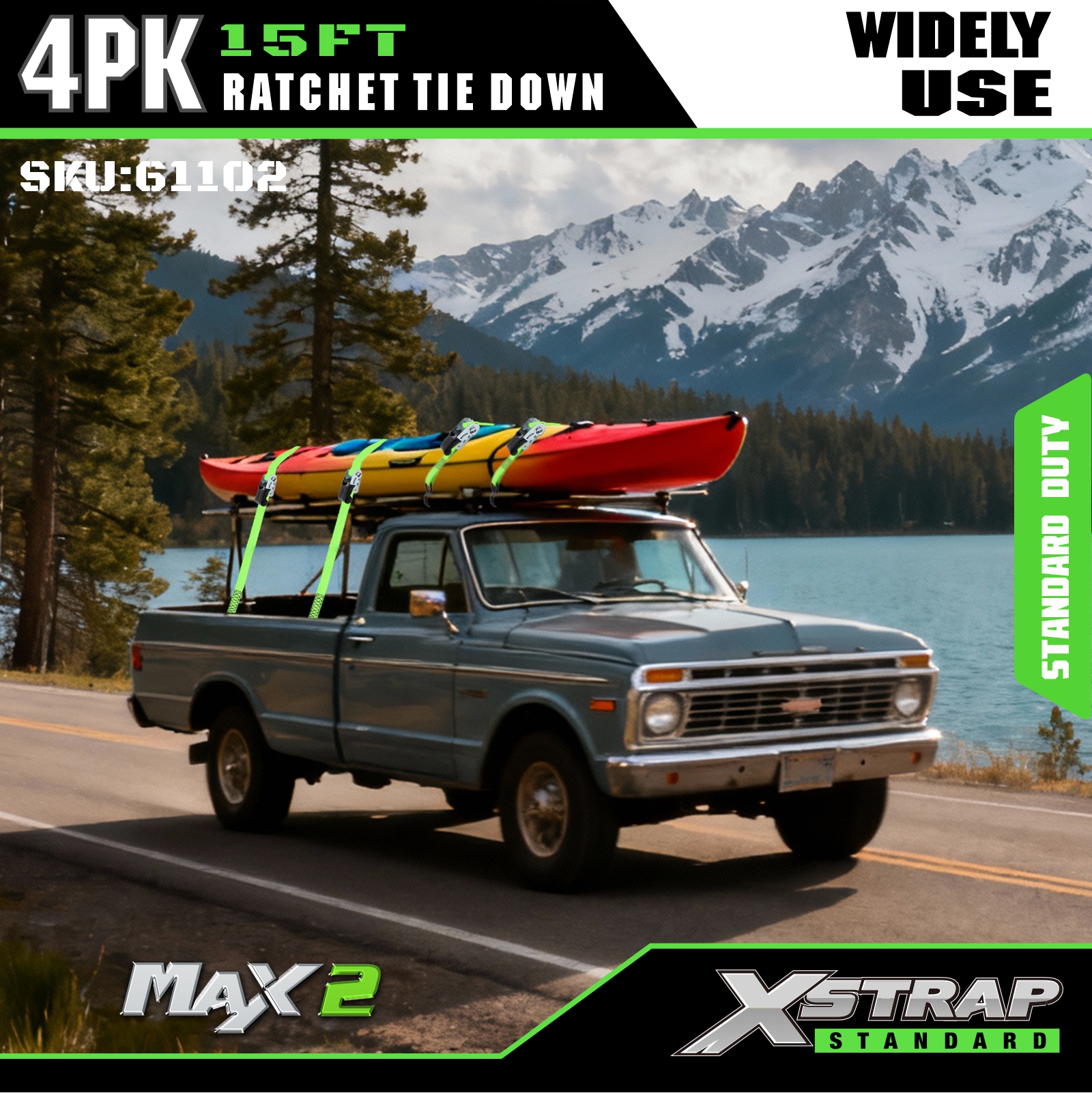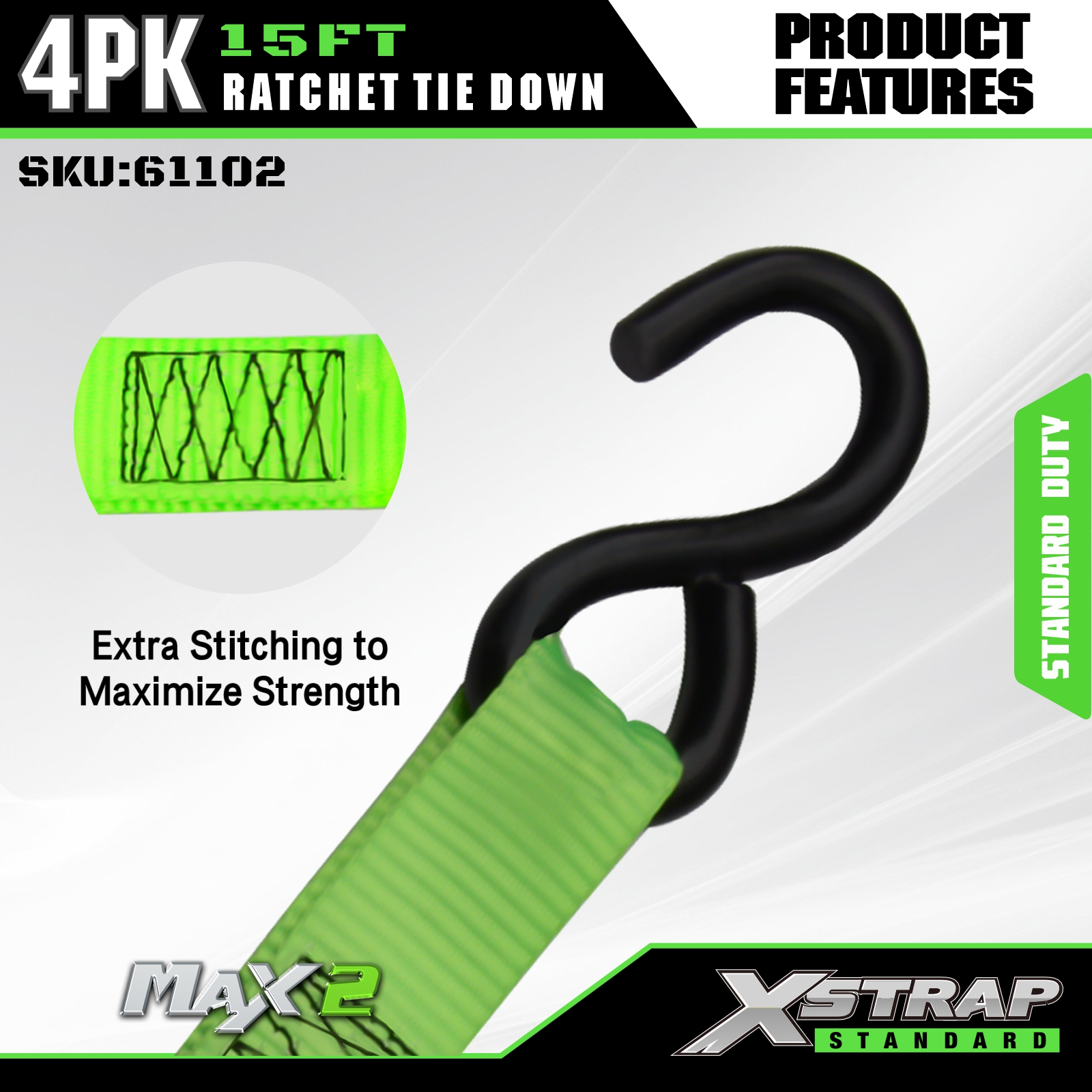 - Beskyttende gummibelagte S-kroge: Udstyret med gummibelagte S-kroge i stål, der effektivt forhindrer ridser og skader på din last og køretøjets overflader. Ideel til sikring af last i kørende lastbiler, UTV'er, ATV'er, dirtbikes, motorcykler og som vigtigt lastbiltilbehør.